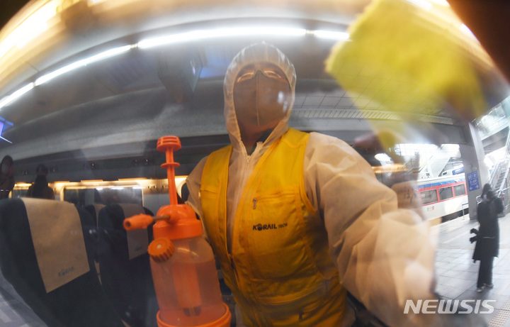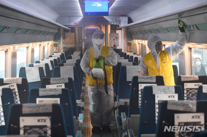 旧正月(今年は2月1日)の連休間近の27日午前、ソウル市中区のソウル駅乗降場で、釜山行きKTX(韓国高速鉄道)の列車内の防疫作業を行う関係者の様子。