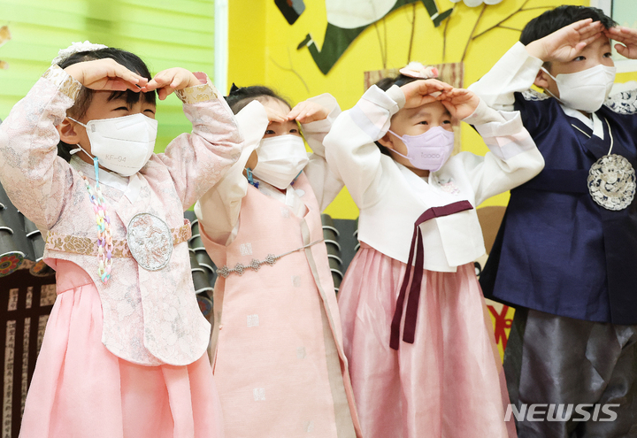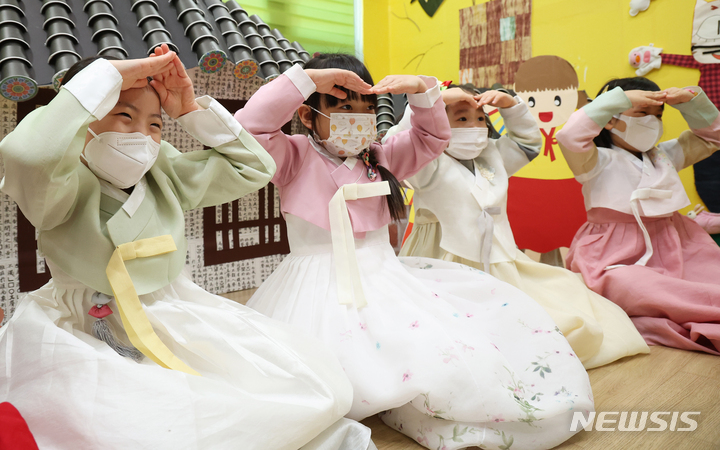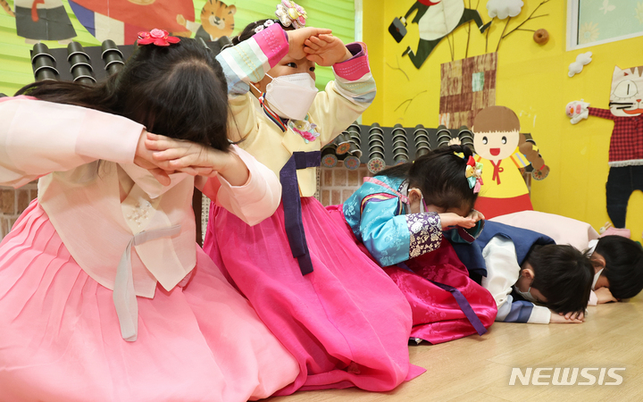 民族の大名節、旧正月(今年は2月1日)まであと五日となった27日午前、京畿道水原市細柳洞のギョンヒ・アイダソム・オリニチプ(民間保育施設)では、韓服できれいに着飾った子どもたちが特別なお辞儀の仕方を習っていた。