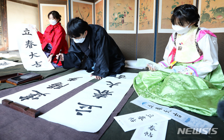 春の始まりを告げる立春を翌日に控えた3日午前、ソウル市鍾路区の国立民俗博物館にある梧村宅では、書道家パク・チヌらが「立春大吉」や「建陽多慶」と書かれた立春帖を門に貼っていた。