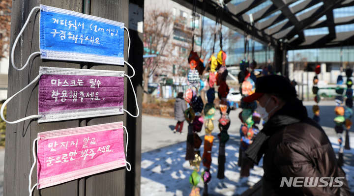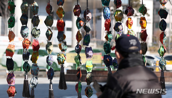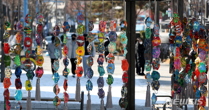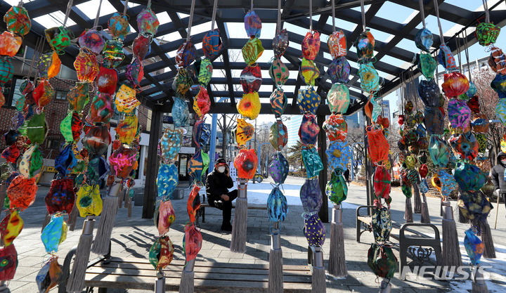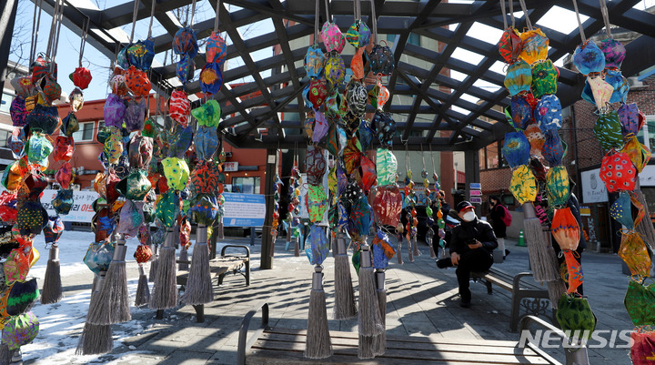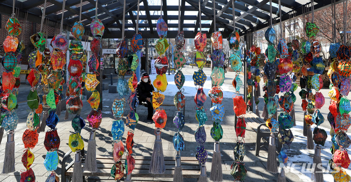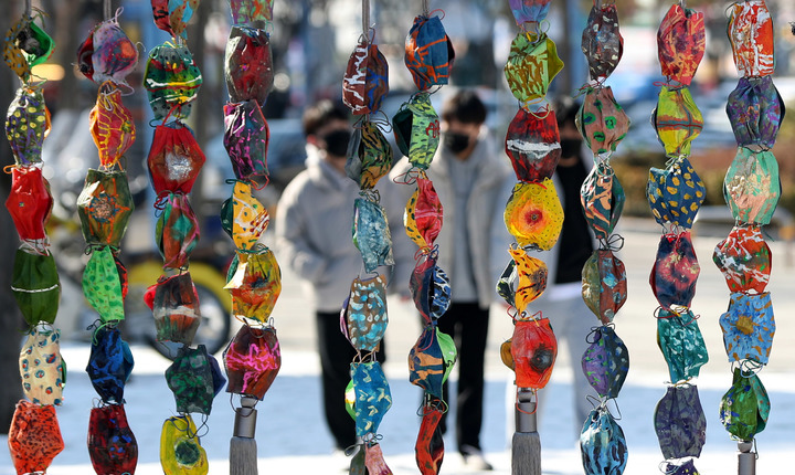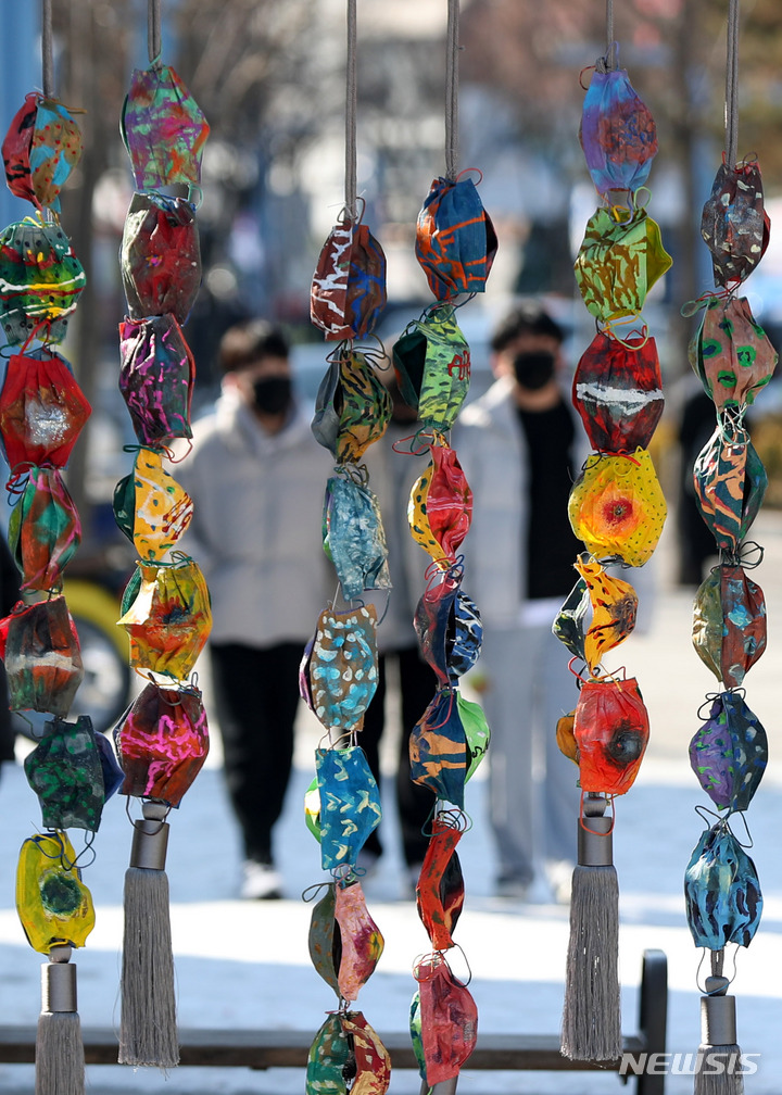 【NEWSIS】3日午後、ソウル市麻浦区にある地下鉄弘大入口駅前「出会いの広場」に、新型コロナウイルス感染症予防のため使用されたマスクを集めてカーテンにした「望んでいる憩いの場」というタイトルのアート作品が設置された。