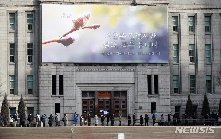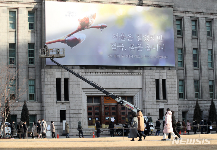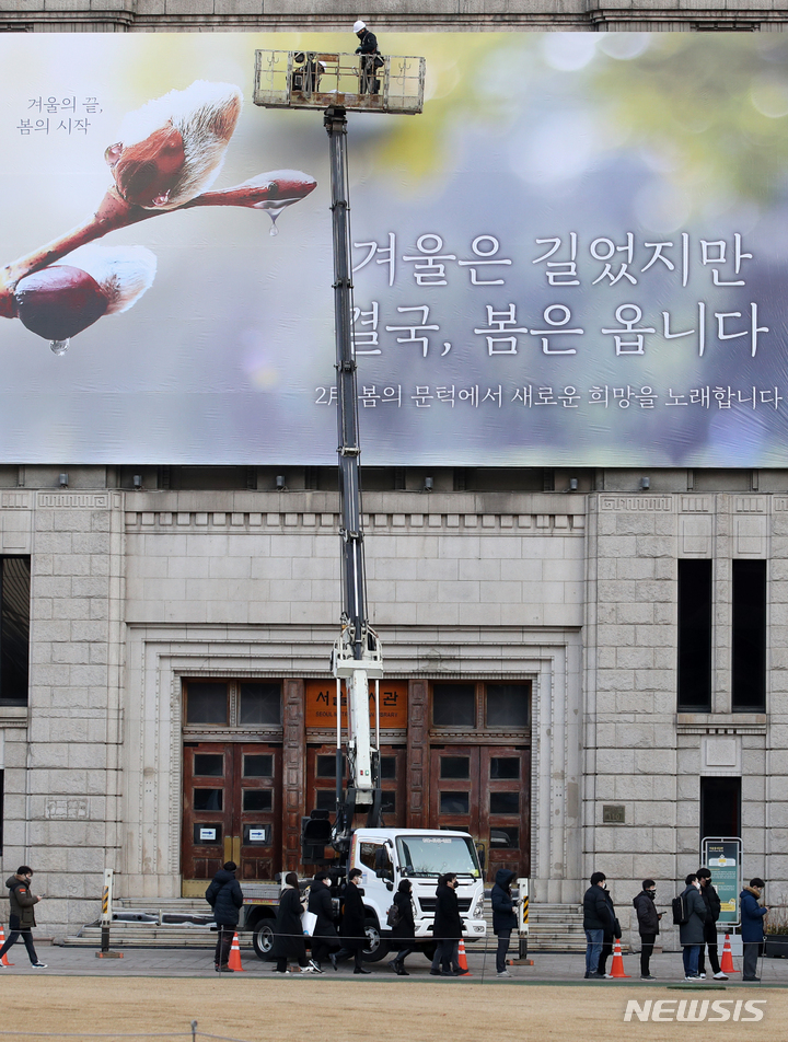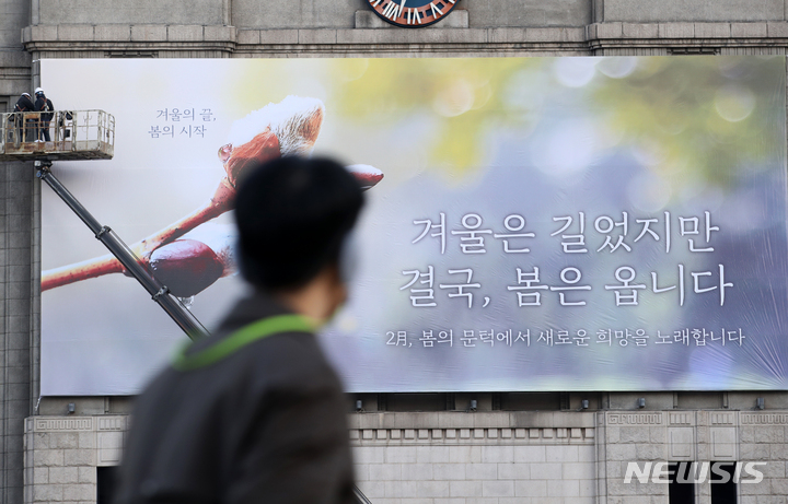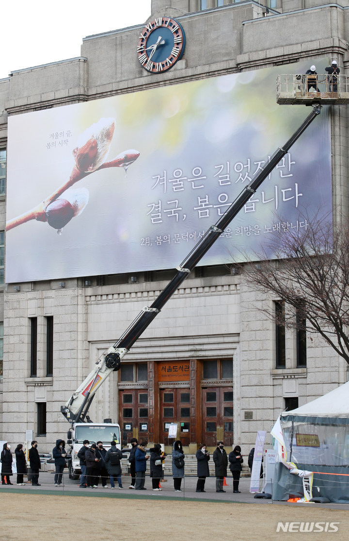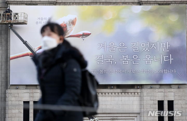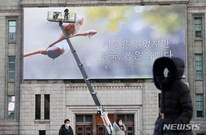 【NEWSIS】7日午前、ソウル市中区にあるソウル図書館の外壁「夢刻み板」に新年のメッセージが掲げられた。ソウル市は「冬は長かったが、結局、春はやって来ます」というメッセージを通じて、冬の寒さと新型コロナウイルス感染症の流行長期化で凍えている市民たちの心にも暖かい春の訪れが感じられるよう願っていることを伝えた。