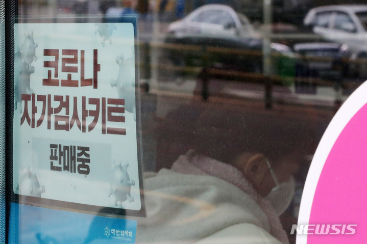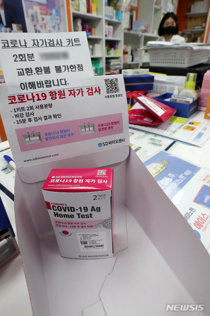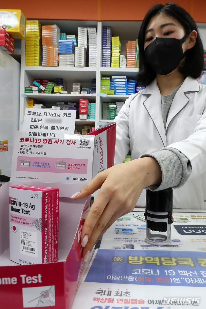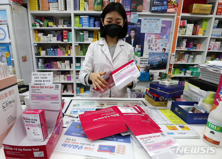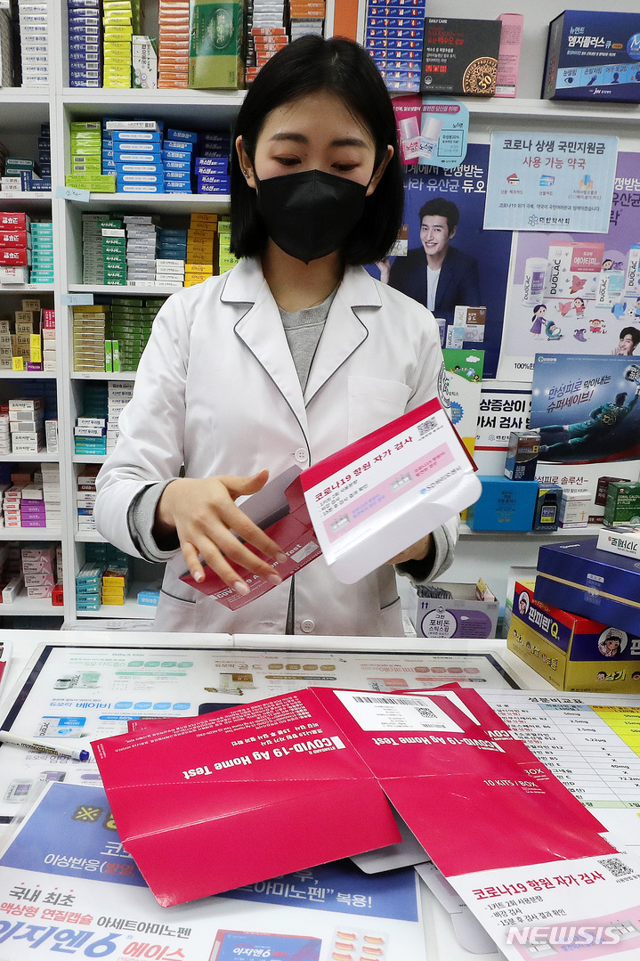 食品医薬品安全処が「新型コロナ自宅検査キット追加供給」を表明してから二日目の7日午前、ソウル市内のある薬局で、薬剤師が新型コロナの自宅検査キットの空箱を整理しているところ。この薬局は、今月3日に自宅検査キット5箱(計100回分)を受領したが、現在は1箱、2回分を残すのみだ。