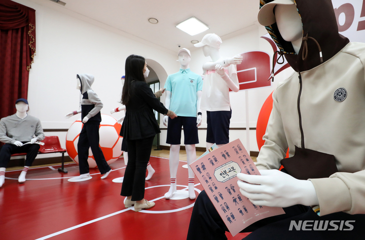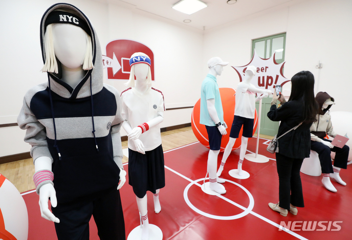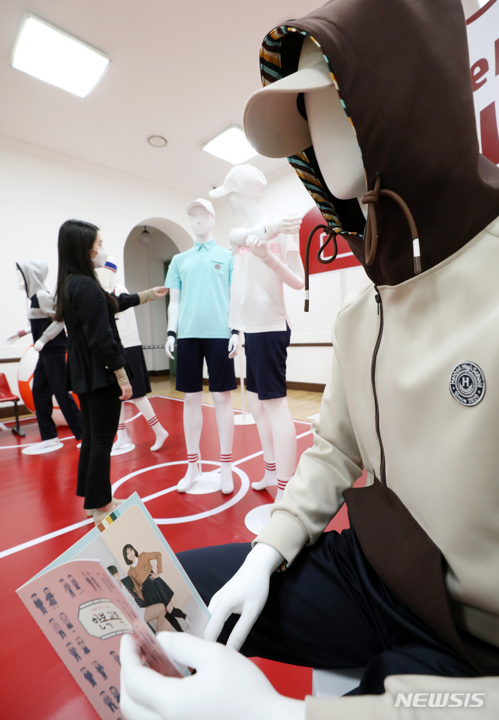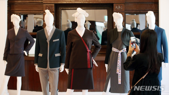 ソウル市中区の「文化駅ソウル284」で9日午後、「韓服勤務服・韓服校服展示会」が開かれ、訪れた市民が韓服風の制服を見て回っているところ。