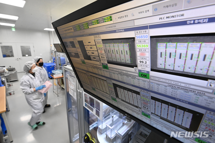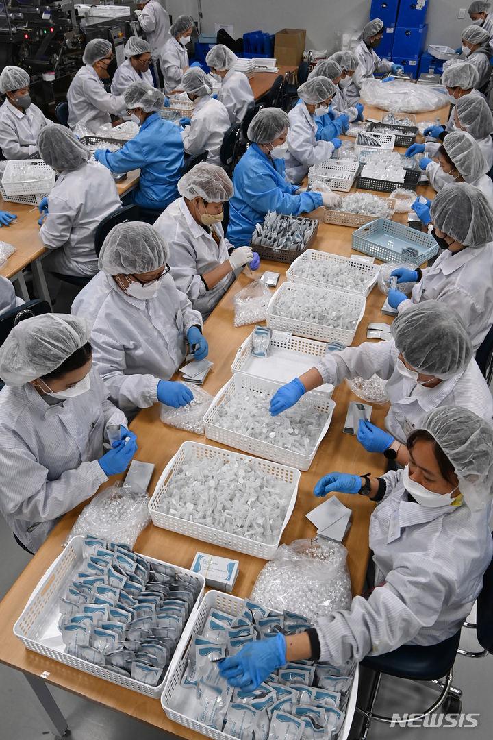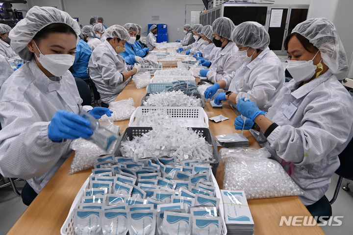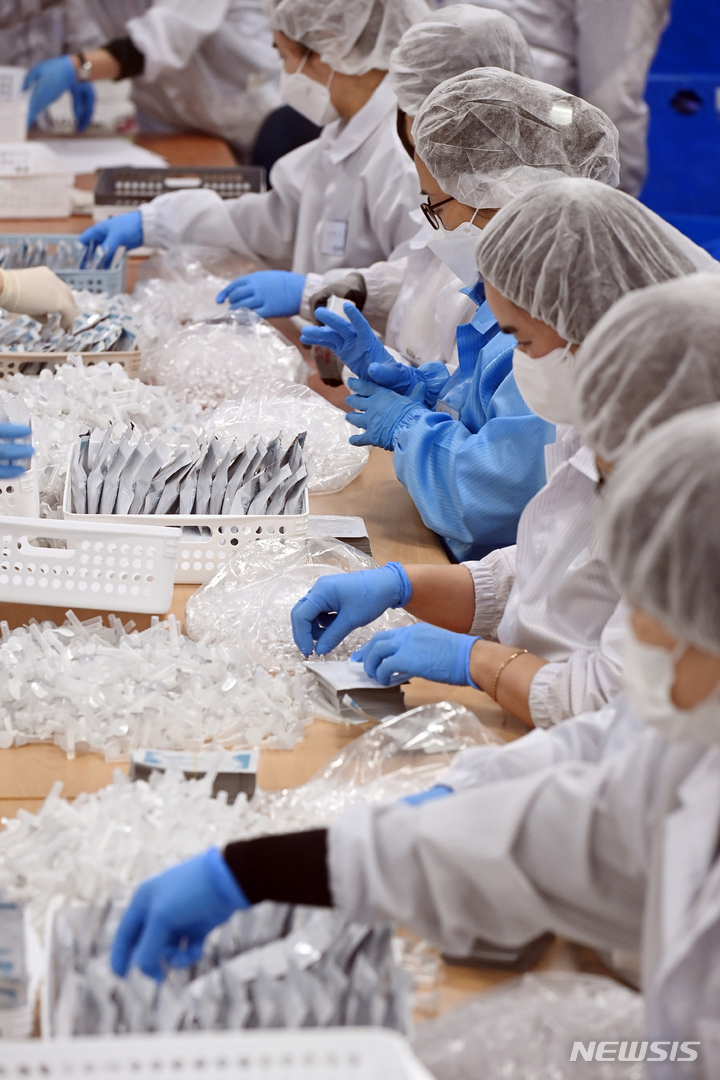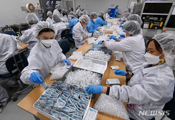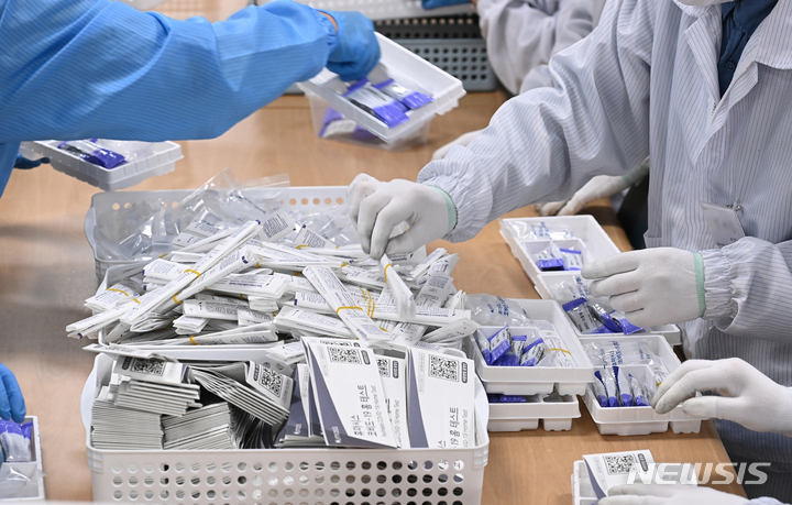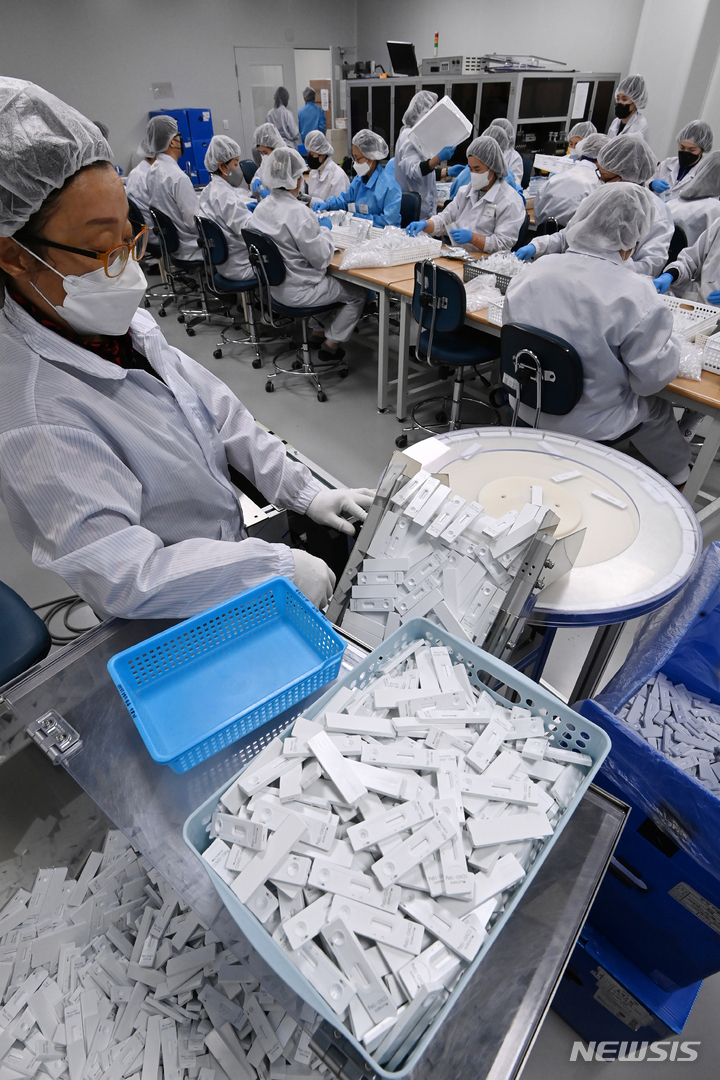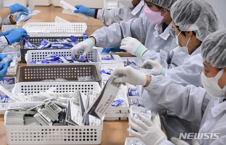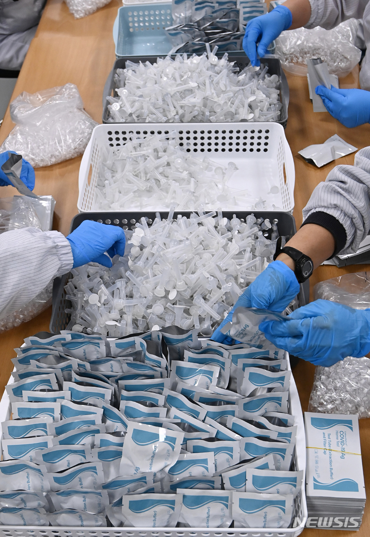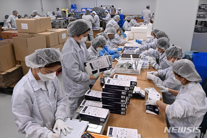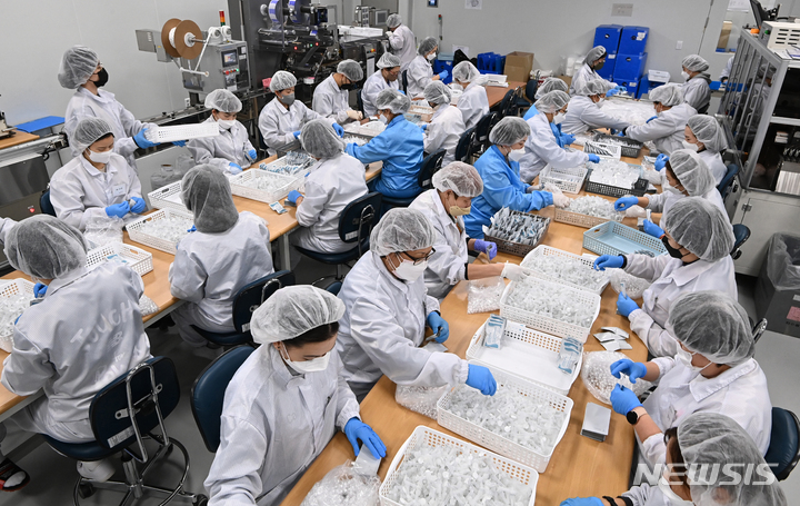 【NEWSIS】新型コロナウイルスに感染して自宅療養している人が過去最多となった9日午後、京畿道軍浦市内の医療検査品メーカー「ヒューマシス」の工場で、迅速抗原検査キットをパッケージングする従業員たち。