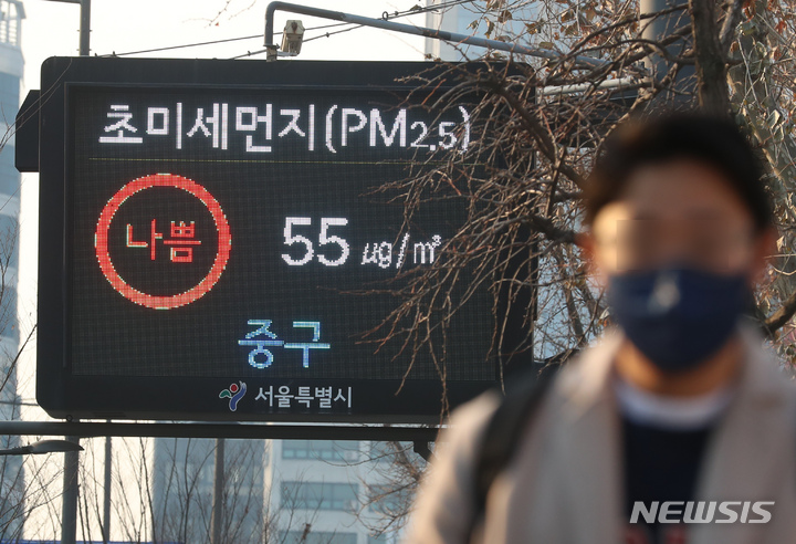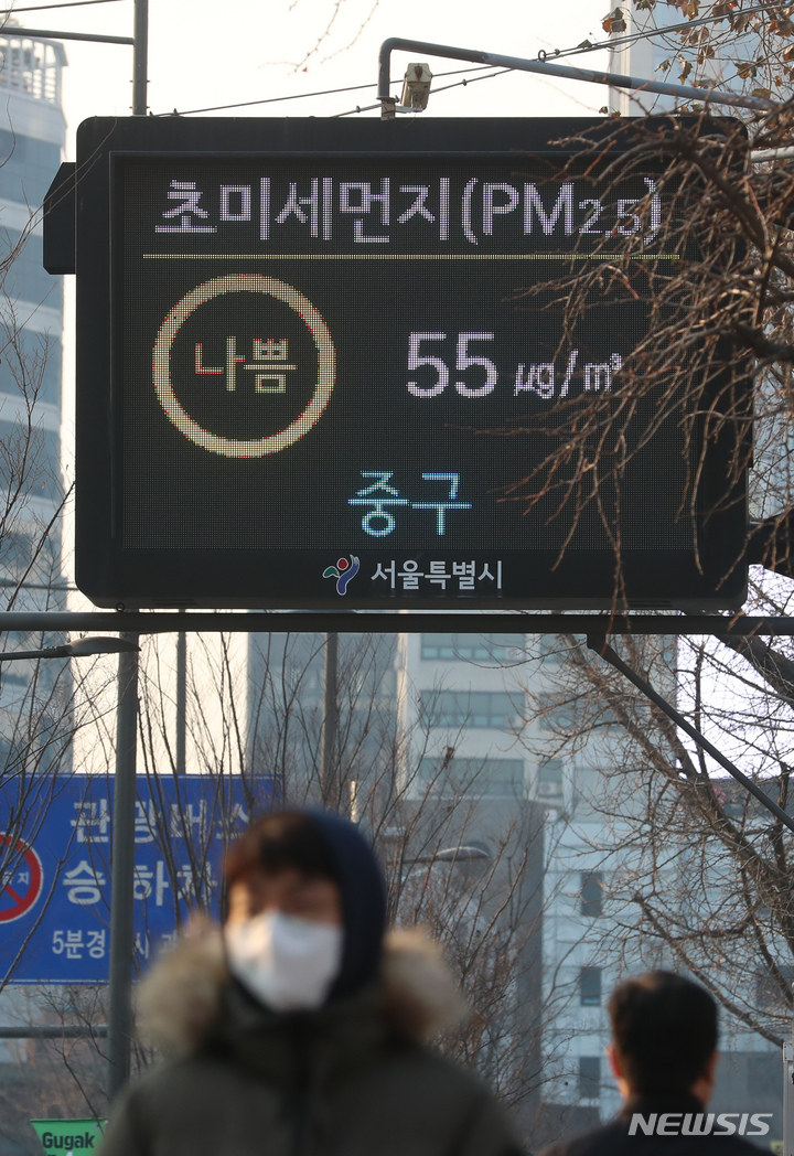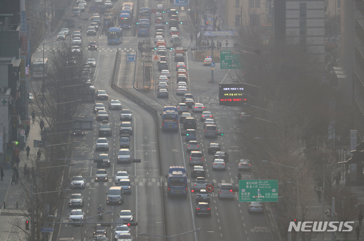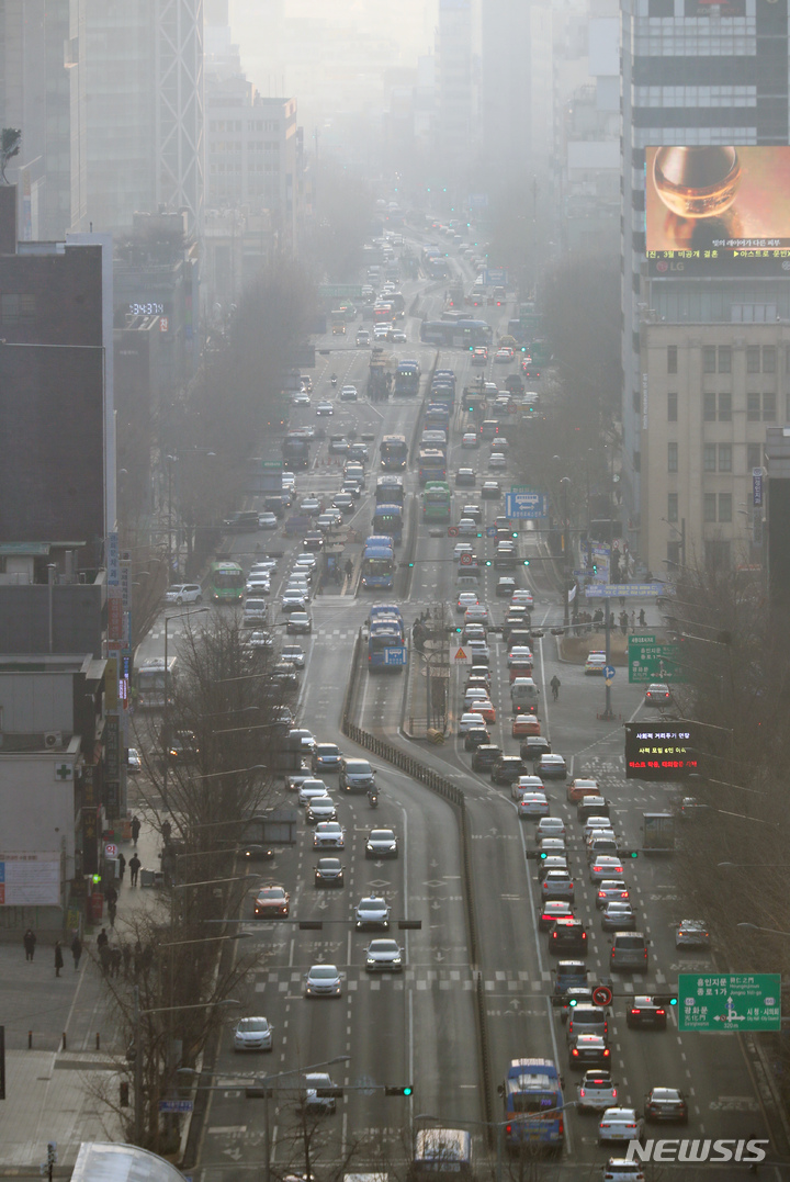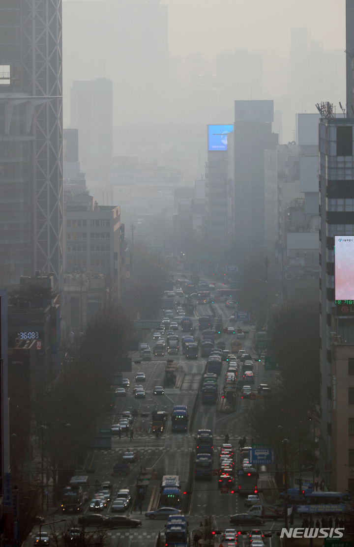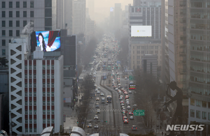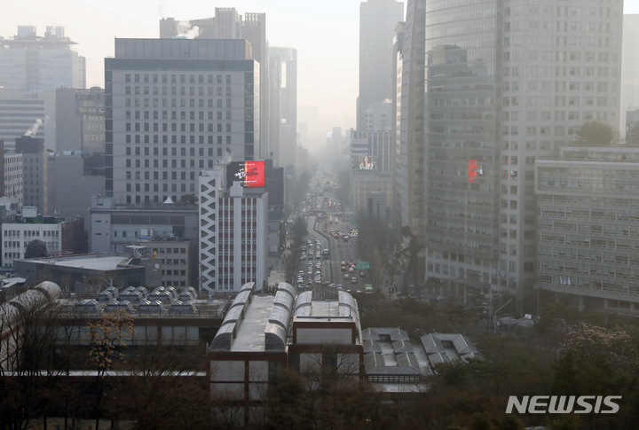 【NEWSIS】韓国環境部所属の機関「首都圏大気環境庁」では11日の午前6時から午後9時まで、ソウル市・仁川市・京畿道地域の「粒子状物質(PM)予備低減措置」を発令した。写真は同日、鍾路などのソウル中心部で大気がかすんでいる様子。