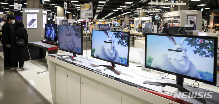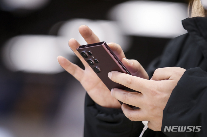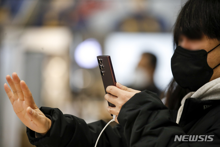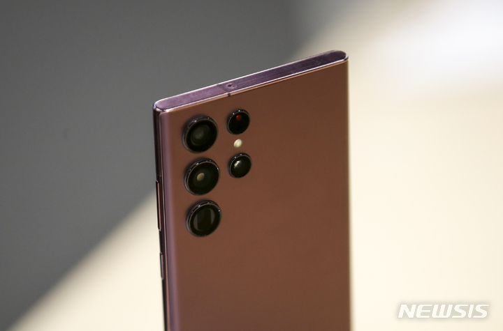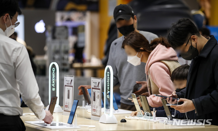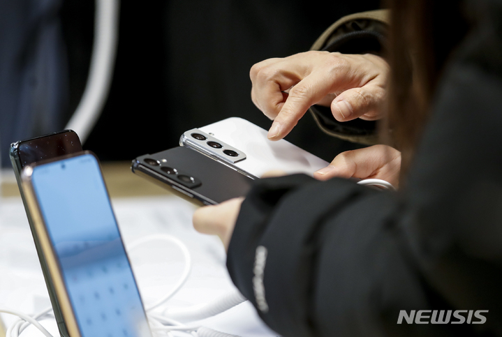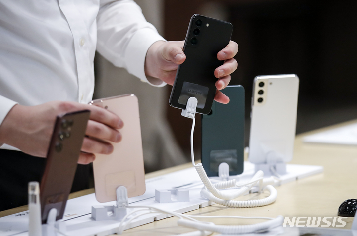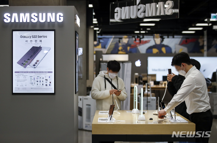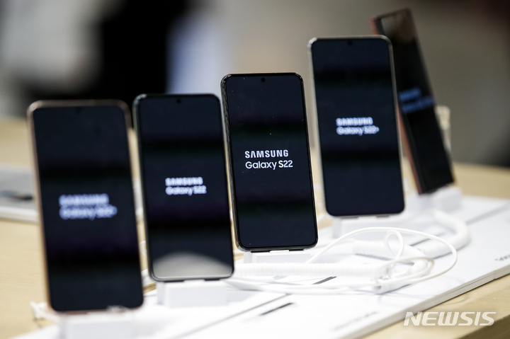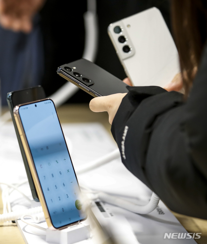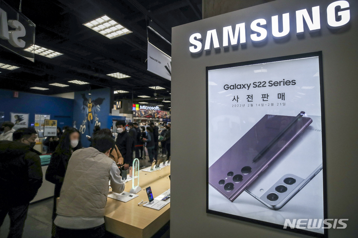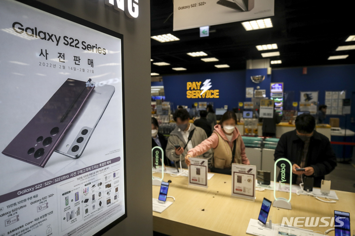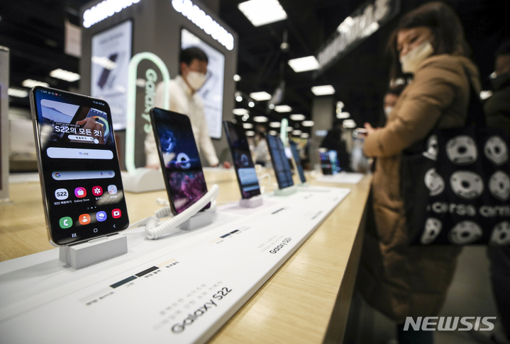 サムスン電子の新型スマートフォン「Galaxy S22」の先行販売が始まった14日午後、ソウル市内の大手スーパーに入店しているサムスンの売り場に展示されたGalaxy S22の様子。