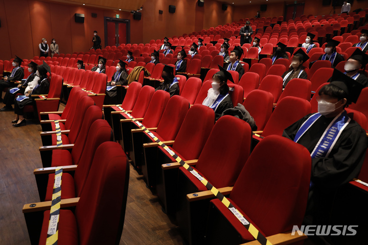 14日、芸術学部および経営経済学部の学位授与式が行われたソウルの中央大学にて、学士帽を投げてお祝いしている卒業生らの様子。