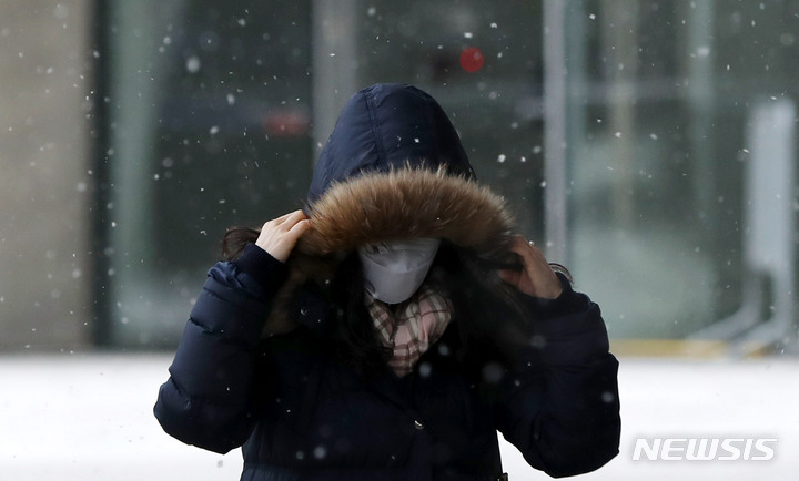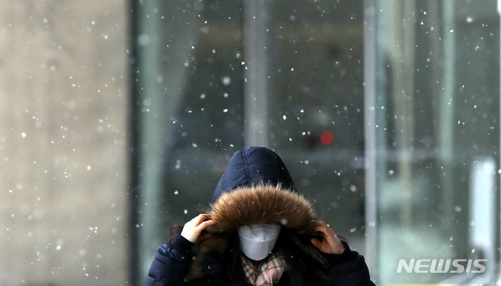 厳しい寒さとなり雪が降った15日午前、ソウル都心では、市民たちが体をすくめたまま急ぎ足で通り過ぎる姿が見られた。