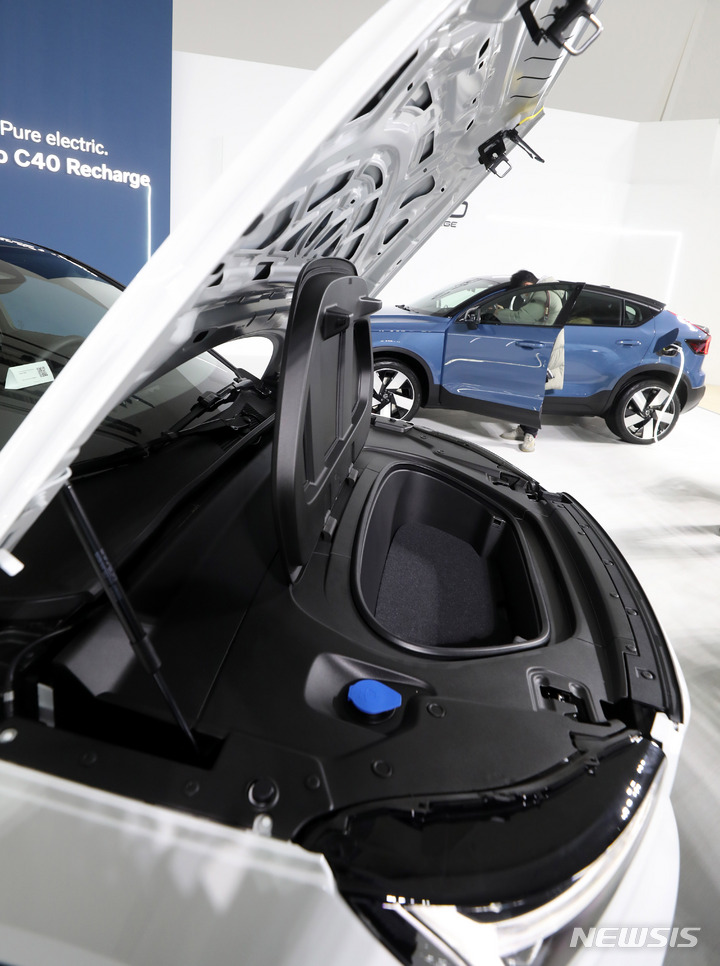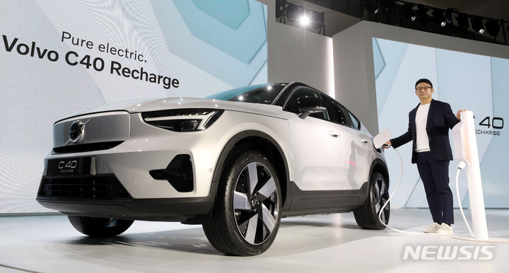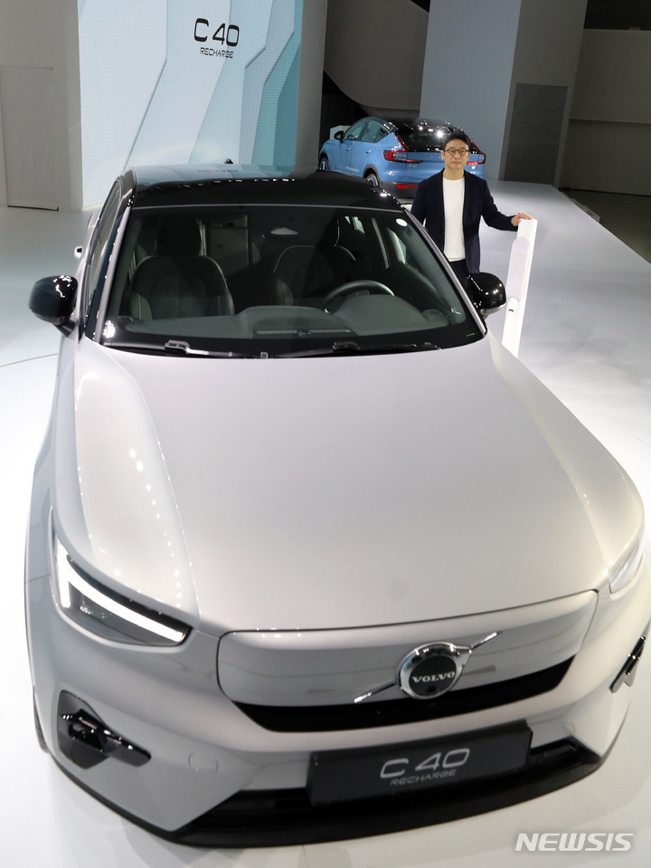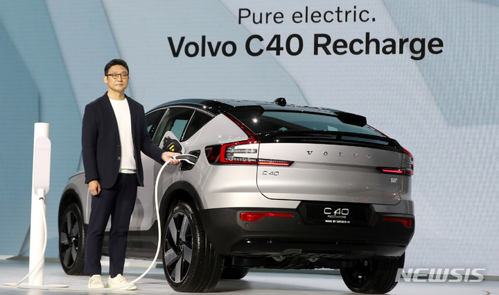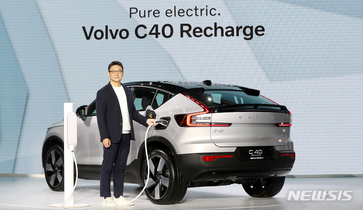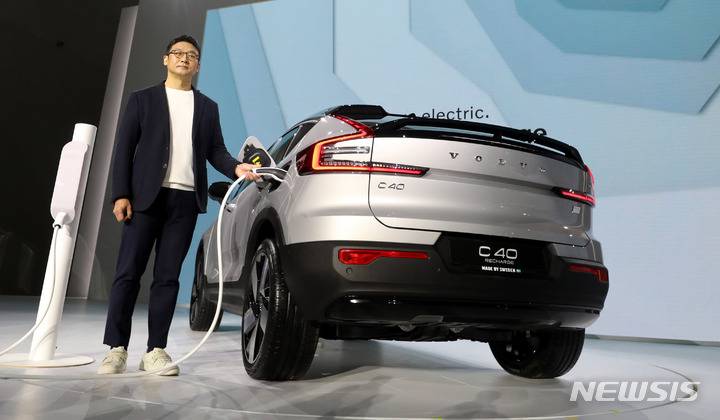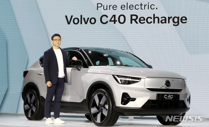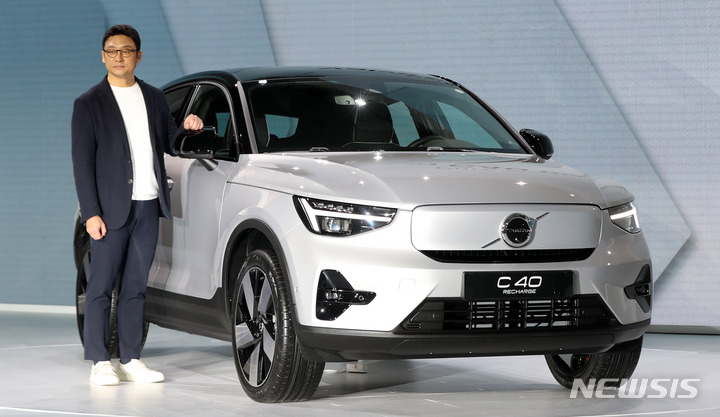 15日午前、ボルボ・カー・コリアの電気自動車専用モデル「C40 Recharge」が公開された。写真は、ソウル市内の東大門デザインプラザで「C40 Recharge」を紹介するボルボ・カー・コリアのイ・ユンモ代表。