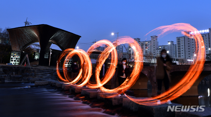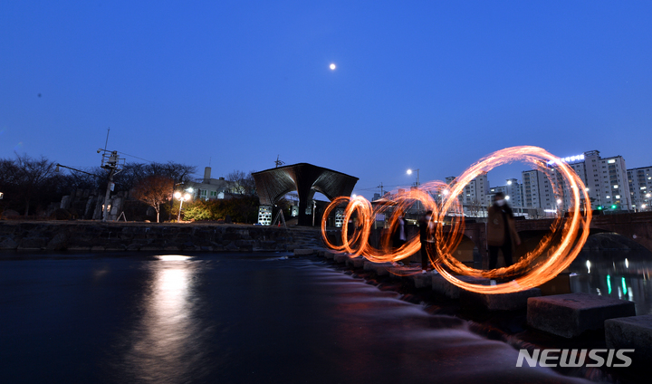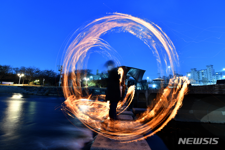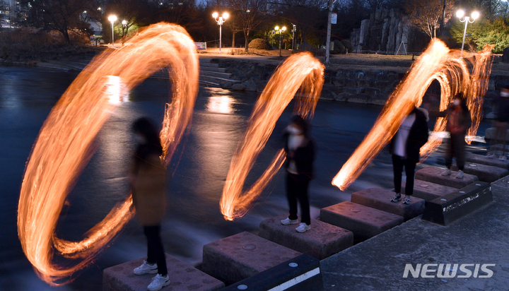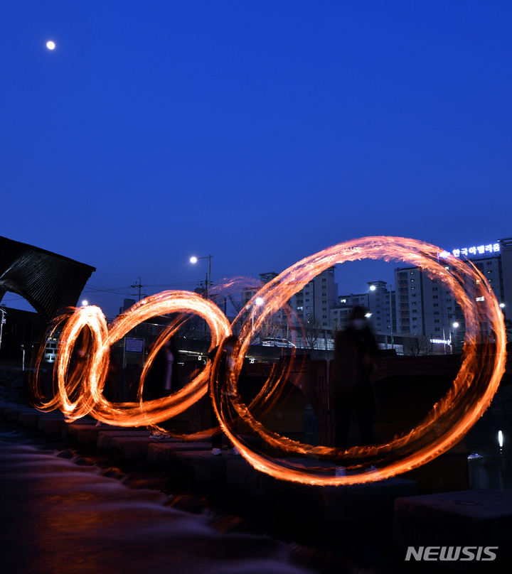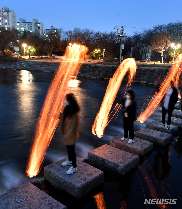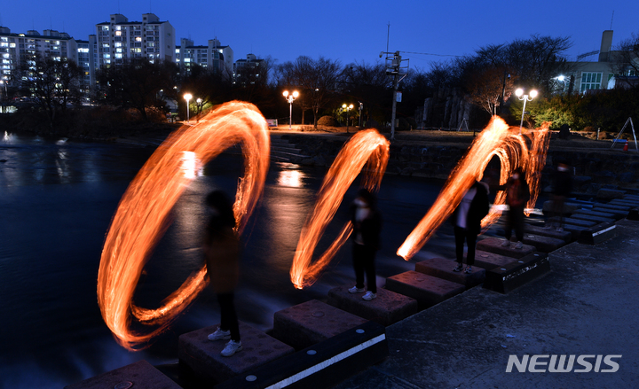 旧暦小正月(今年は2月15日)があすに迫った14日午後、光州市北区林洞の光州川トゥムルモリ(両水頭。川の合流点)で、北区庁・行政福祉センター職員らが「新型コロナ終息と光州安寧」を祈願しつつ伝統行事の「チブルノリ」を行っているところ。