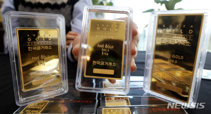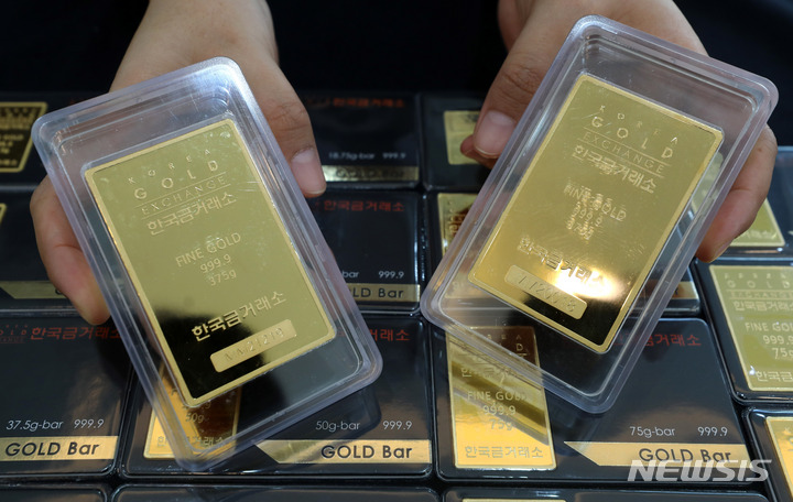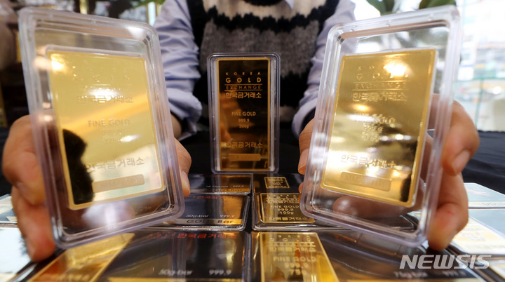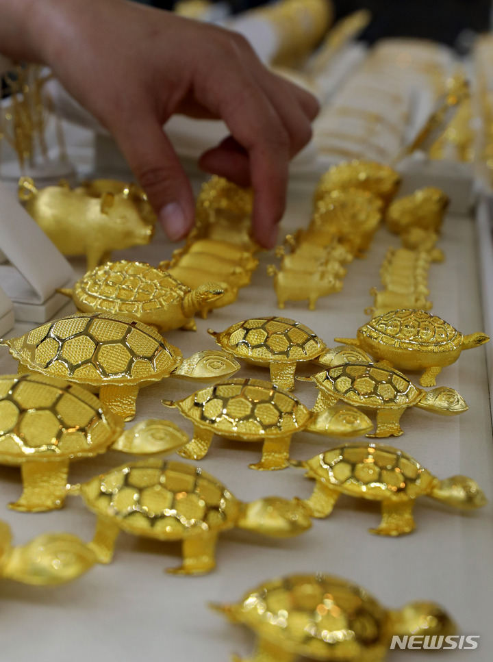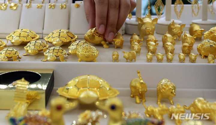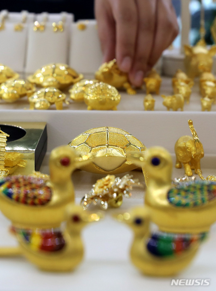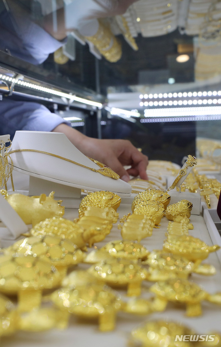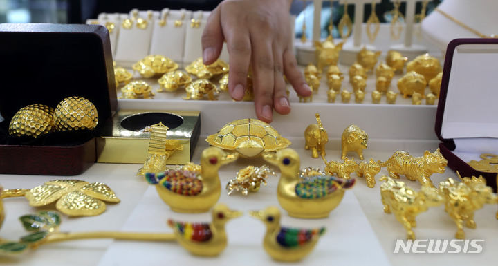 金の価格が1年4カ月ぶりの高値となった15日午後、ソウル市鍾路区の韓国金取引所では、職員らが金製品を陳列していた。