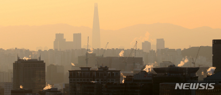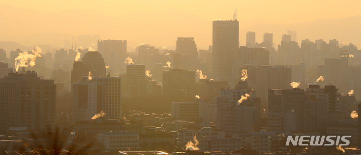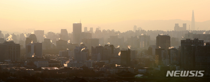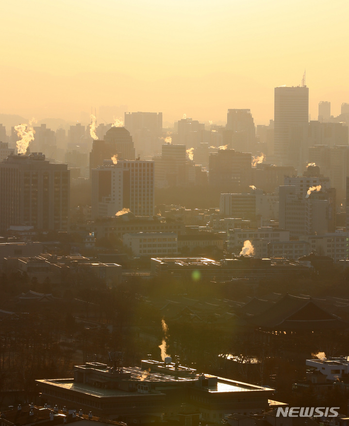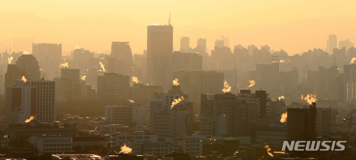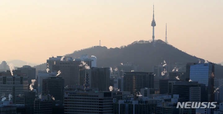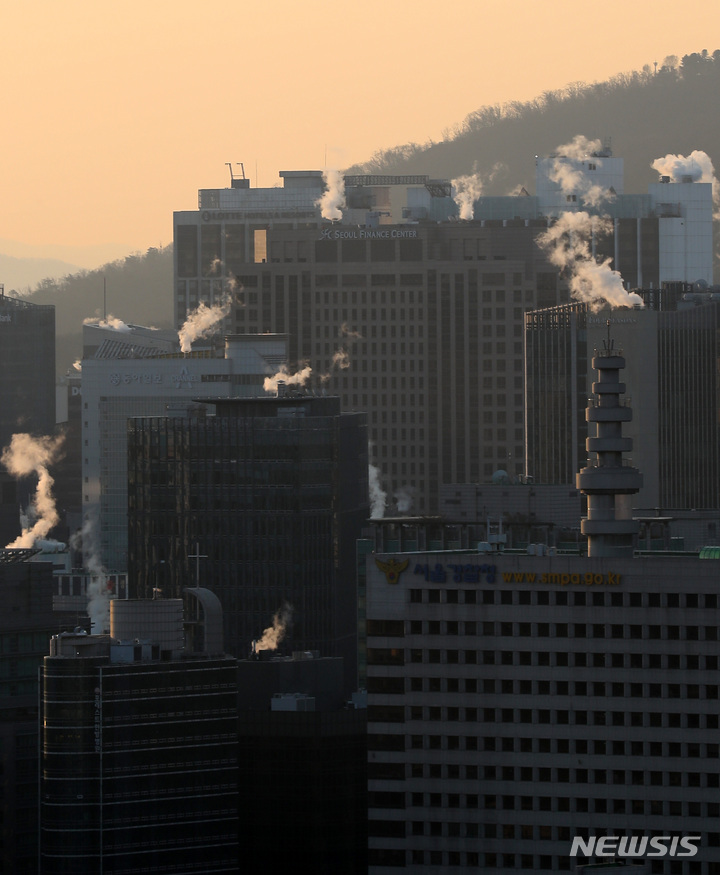 【NEWSIS】ソウル市内の朝の最低気温が氷点下11℃まで下がるなど、厳しい寒さが続いた17日午前、ソウル中心部では多くのビルから暖房による水蒸気が上がっていた。