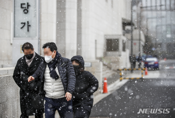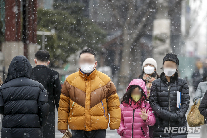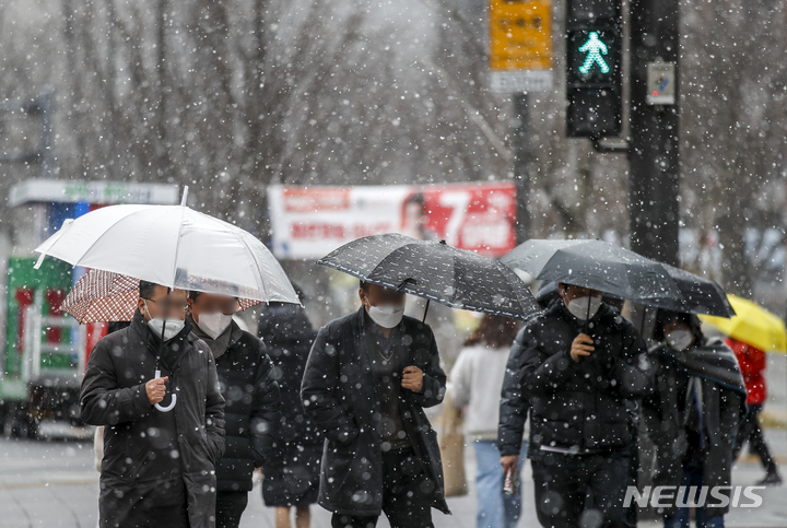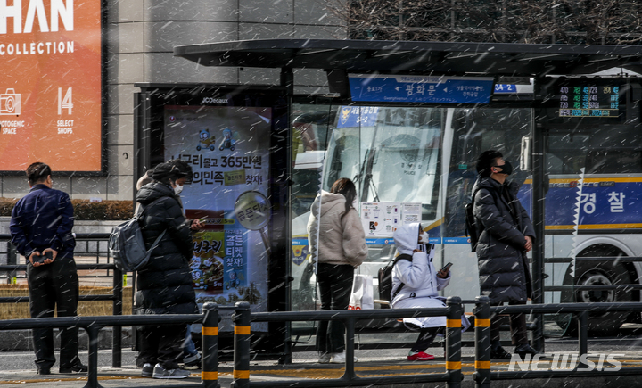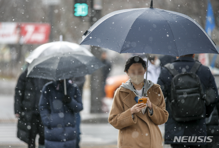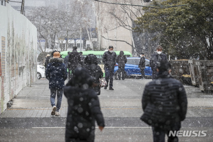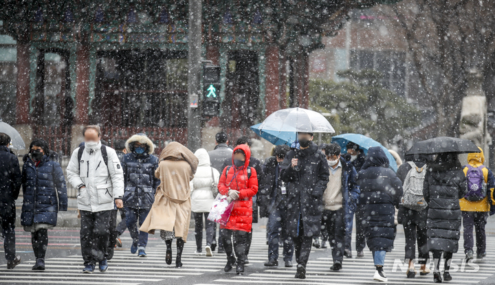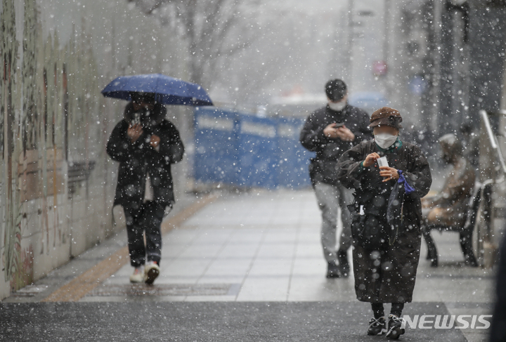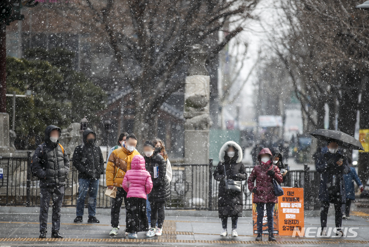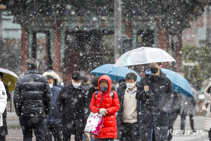 雪が降った21日午後、ソウル市鍾路区の世宗路交差点周辺では、雪が降る中、移動する市民たちの姿が見られた。