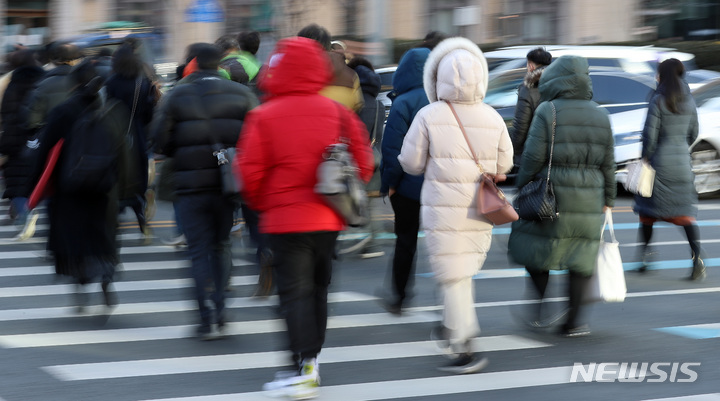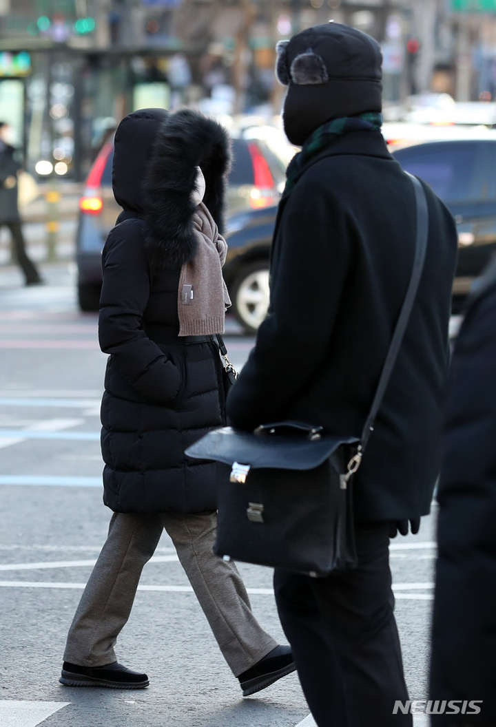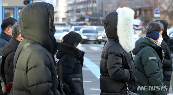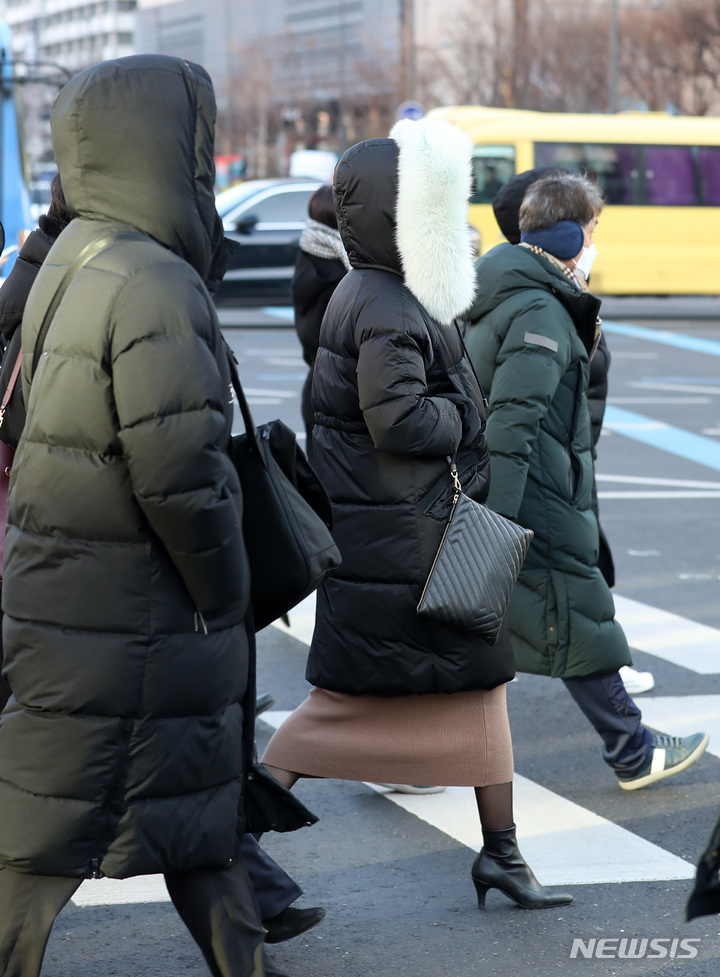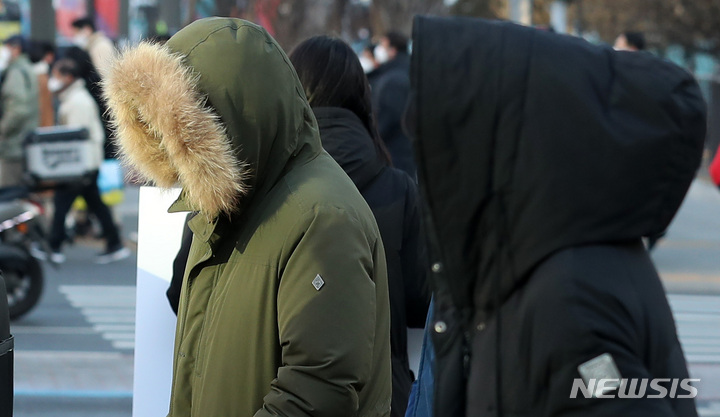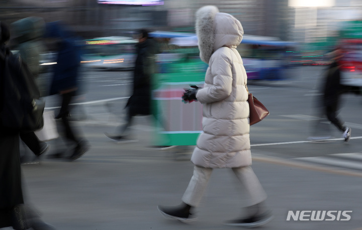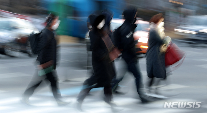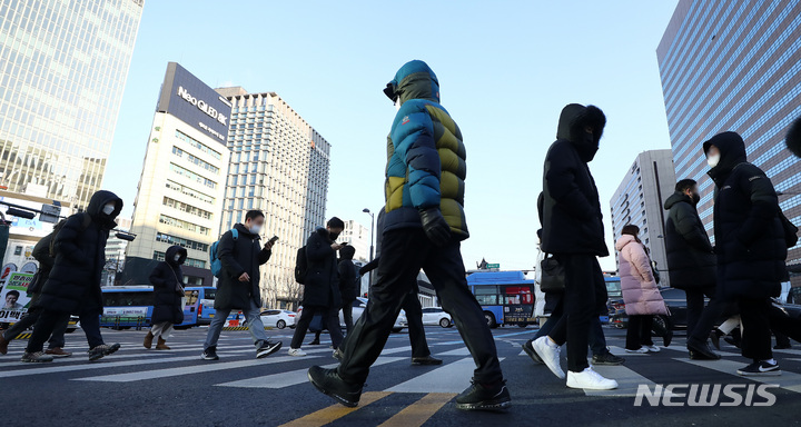 【NEWSIS】連日寒さが続いている22日午前、ソウル市鍾路区の光化門交差点で、厚手の上着を着て歩く人々。