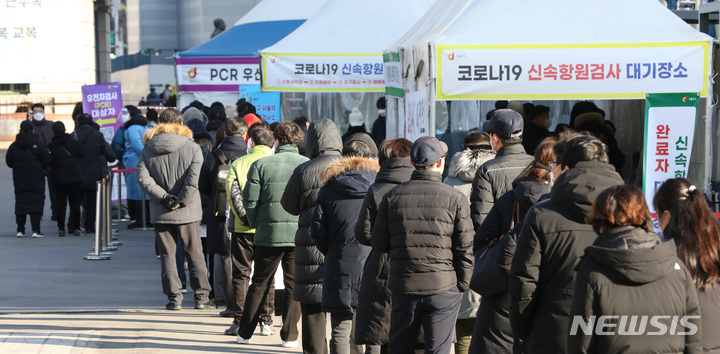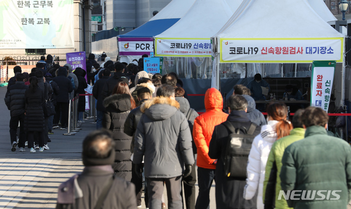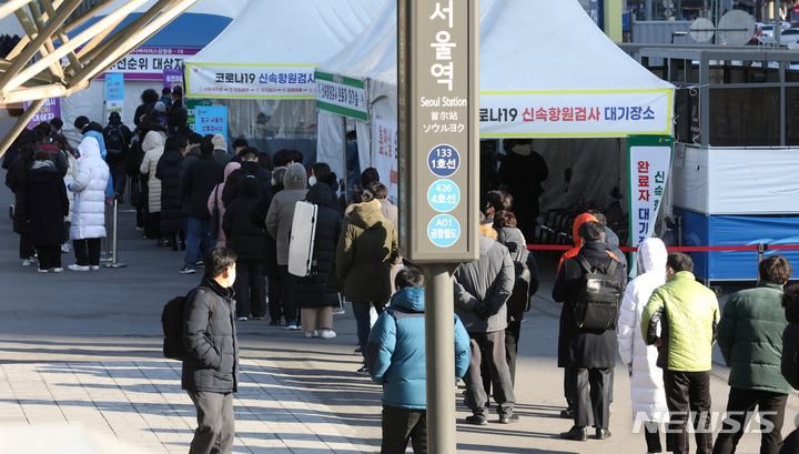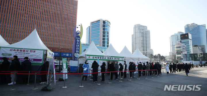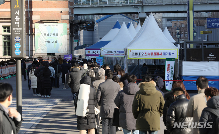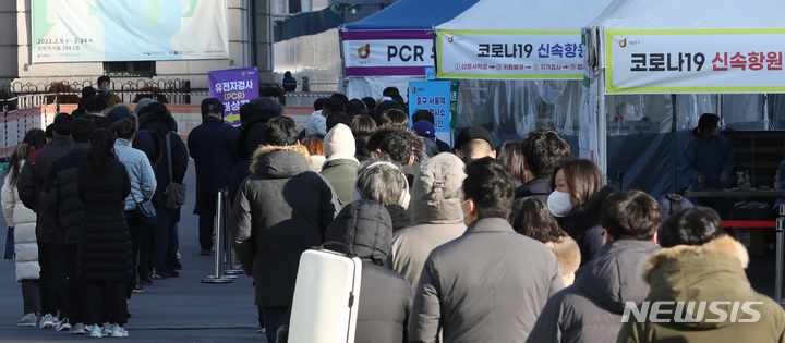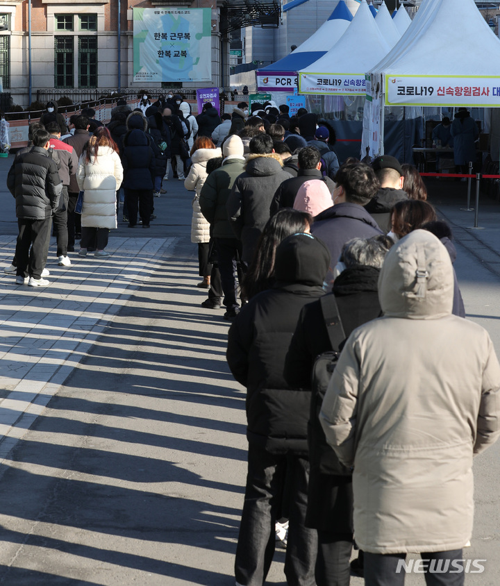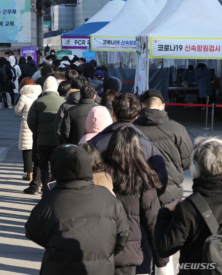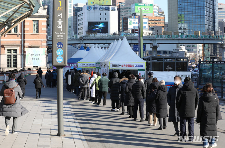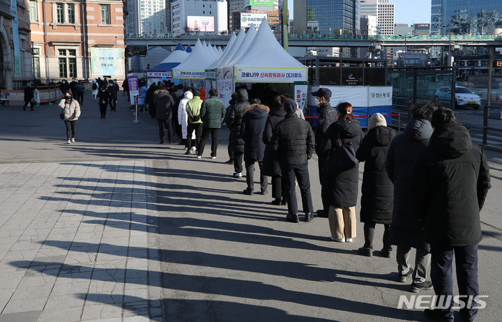 【NEWSIS】新型コロナウイルス一日新規感染者数が前日より約7万人も増え、23日午前0時時点で17万1452人に達した。写真は同日午前、ソウル市中区のソウル駅広場臨時選別検査所で、新型コロナ検査を受けるために並ぶ人々。