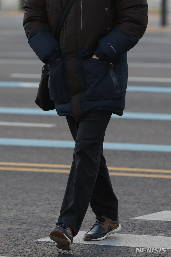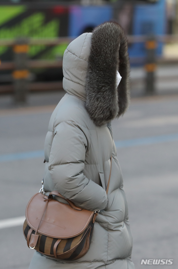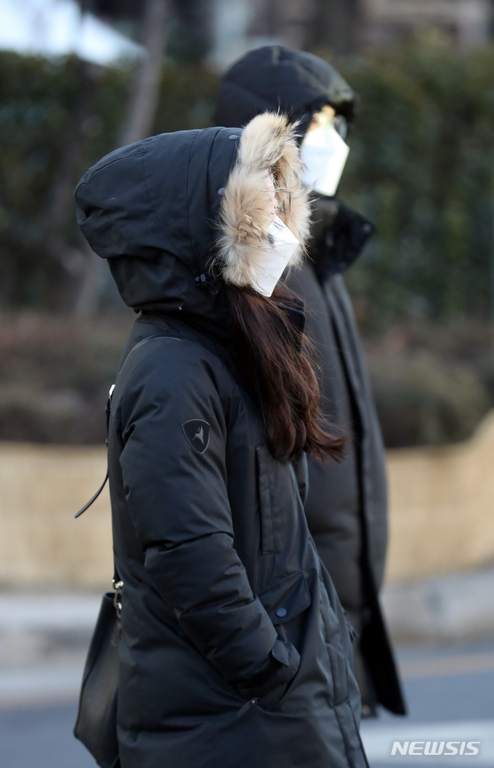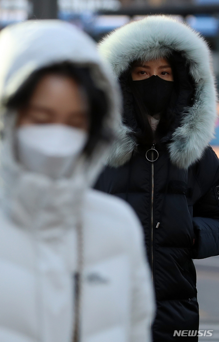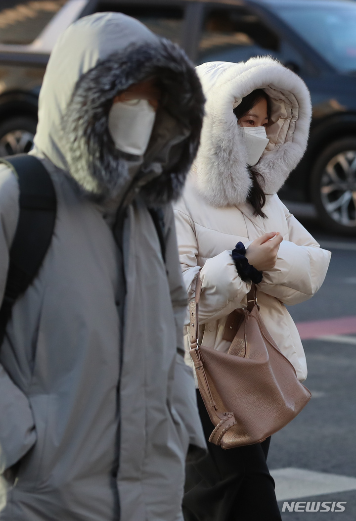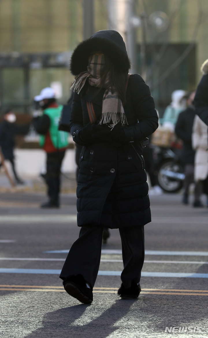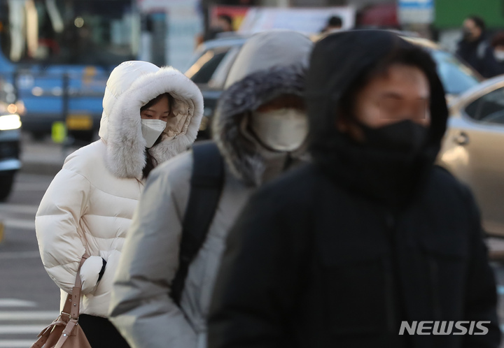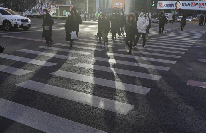 【NEWSIS】ソウル地域の朝の気温が氷点下10℃まで下がるなど、厳しい寒さとなった23日、ソウル市内の光化門交差点を歩く人々。