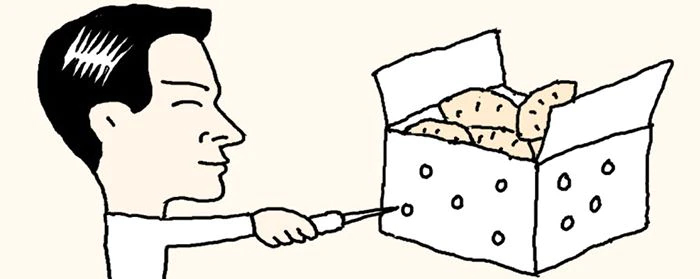 段ボール箱に風がよく通るよう穴を開けた後、新聞紙を敷いてサツマイモが重ならないように入れ、風通しの良い室温12-15℃の場所に置くと、長期間保存できる。
