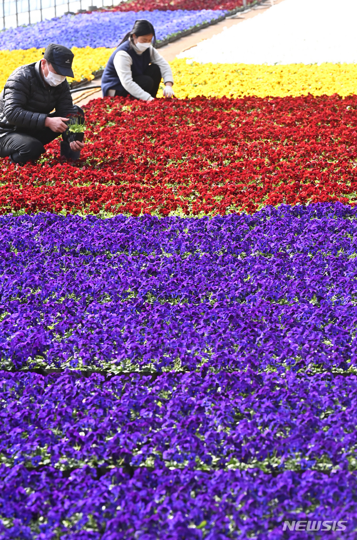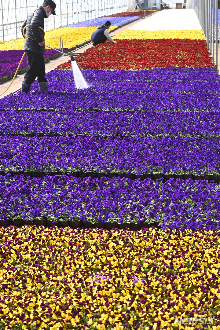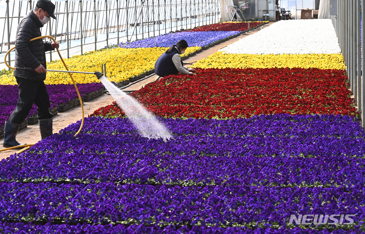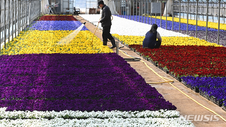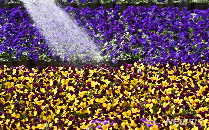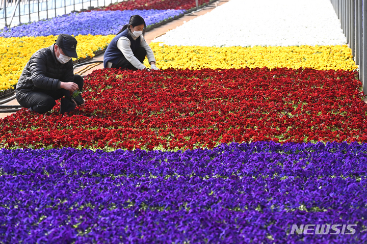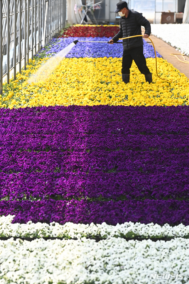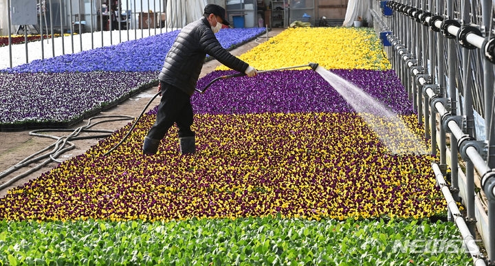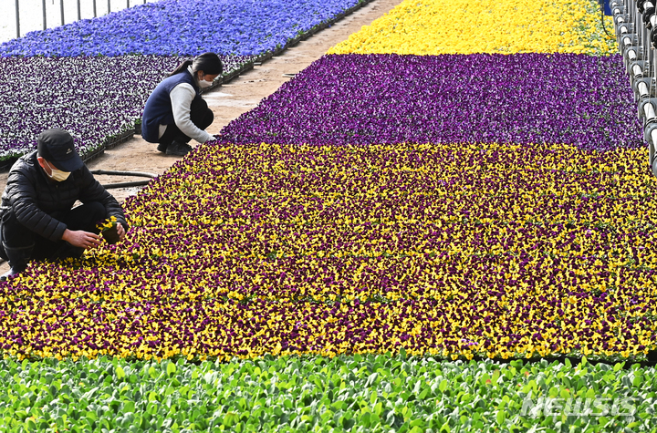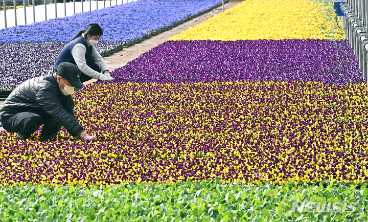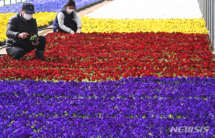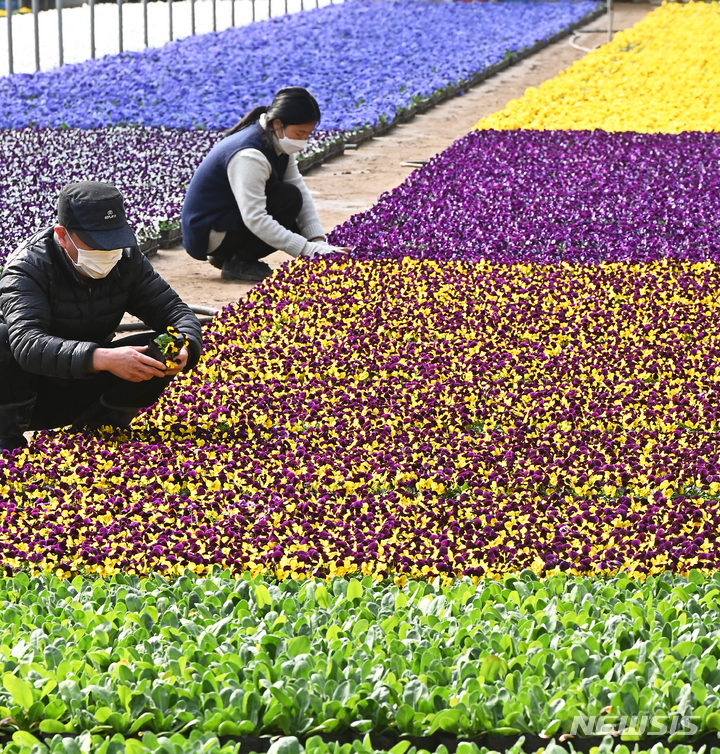 京畿道安養市東安区飛山洞の養苗場で24日、大きく花開いたパンジーの苗を管理している関係者の様子。ここで栽培された花々は各区庁や公共機関などに配分され、都心を飾るのに用いられる。
