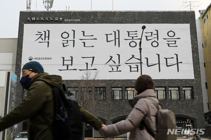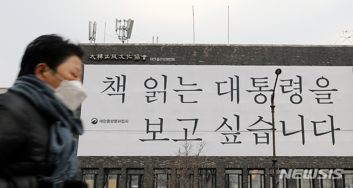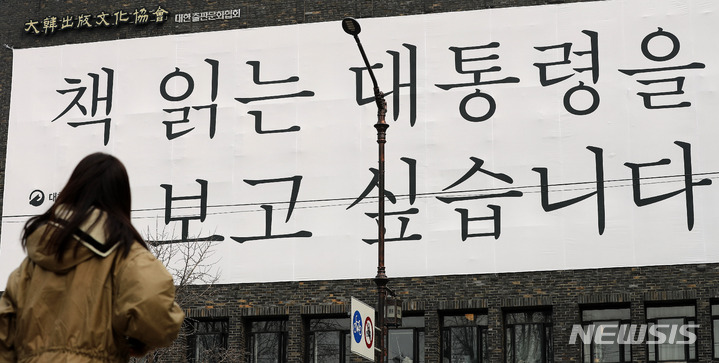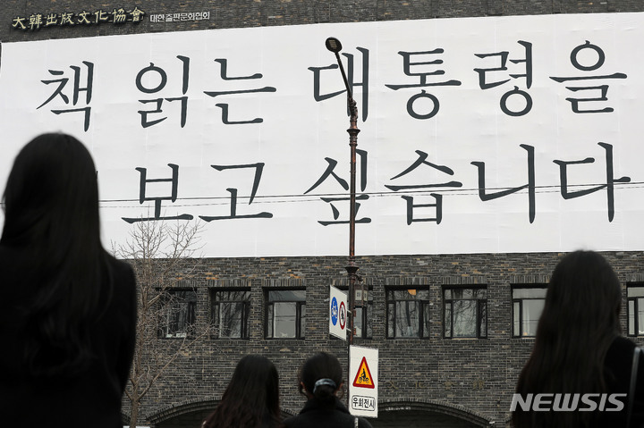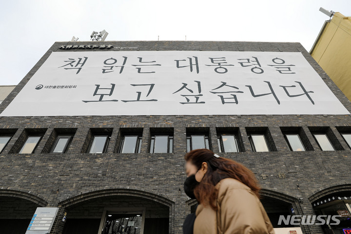 第20代韓国大統領選挙まであと十日あまりとなった25日午後、ソウル市鍾路区の大韓出版文化協会の外壁に「本を読む大統領を見たいです」という垂れ幕が掲げられた。