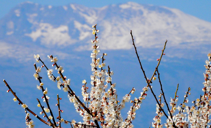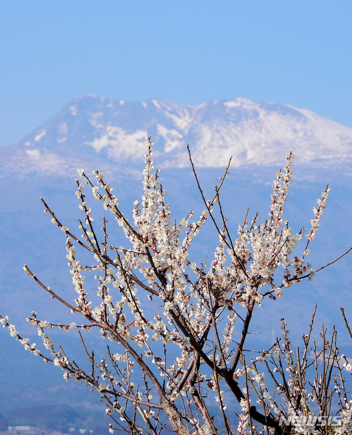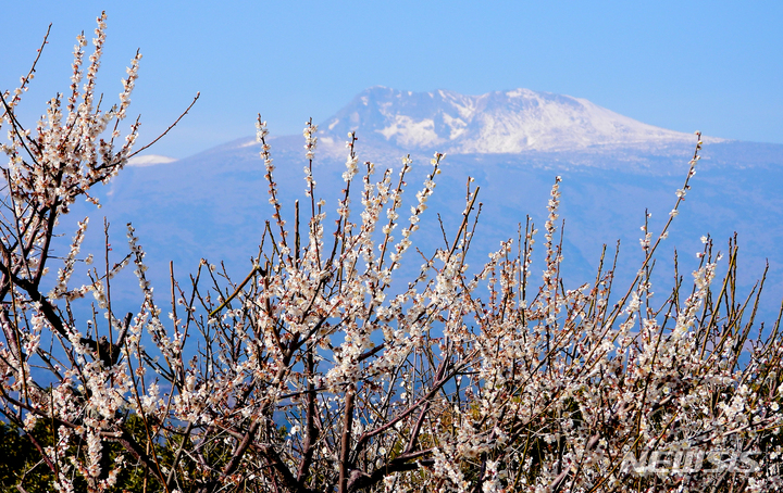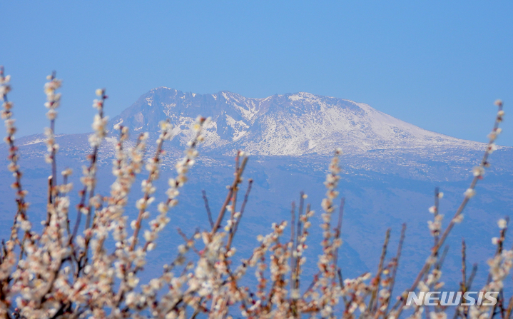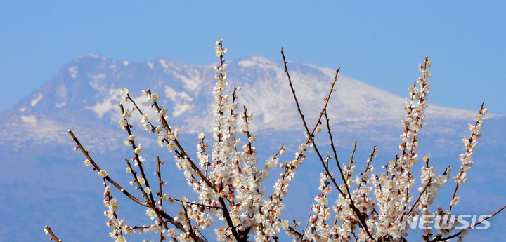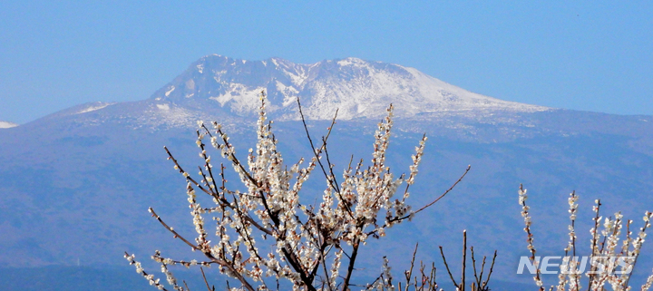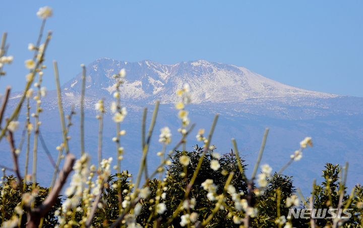 雪の積もった漢拏山と梅の花