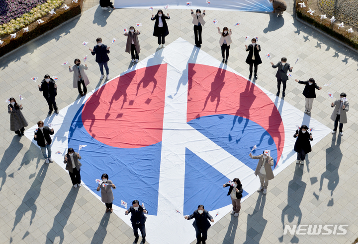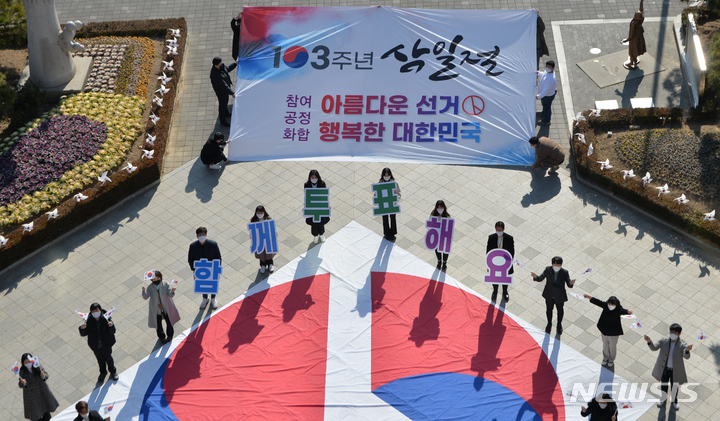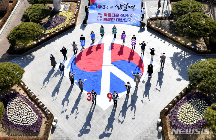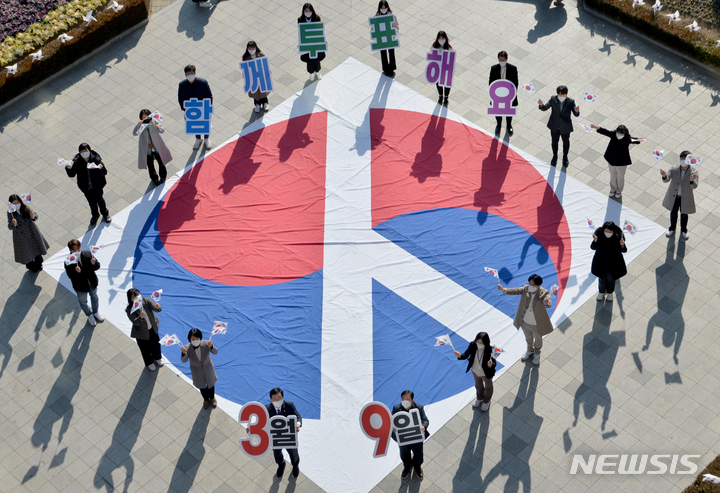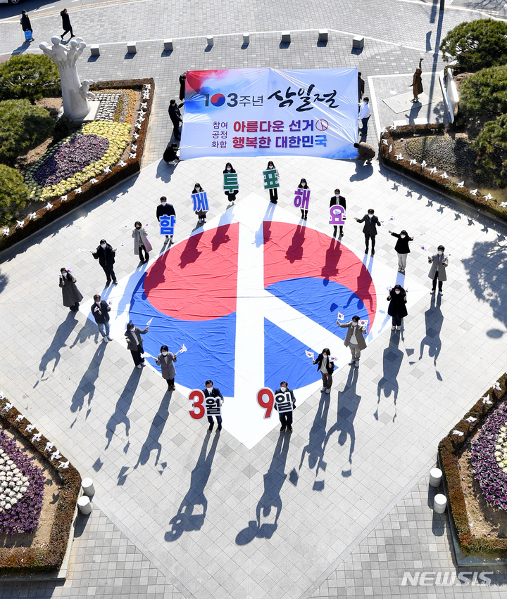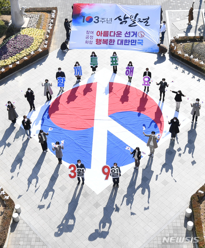 三一節(独立記念運動記念日)を翌日に控えた2月28日午前、公職者たちが光州市北区の庁舎前広場で、投票をうながすため、投票印「卜」を形状化した大型太極旗(韓国の国旗)などを用い、三一節記念選挙参与パフォーマンスを繰り広げた。
