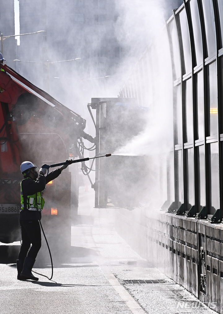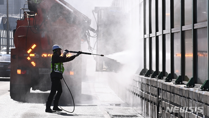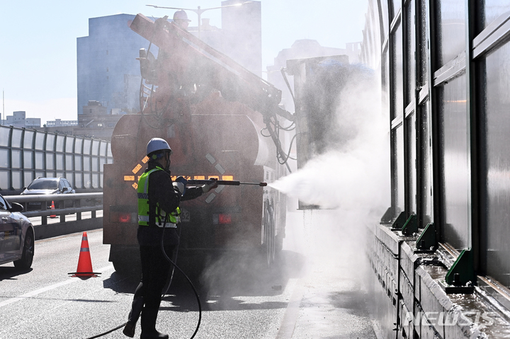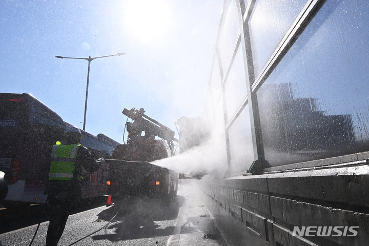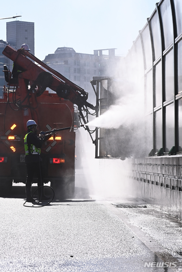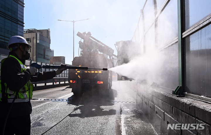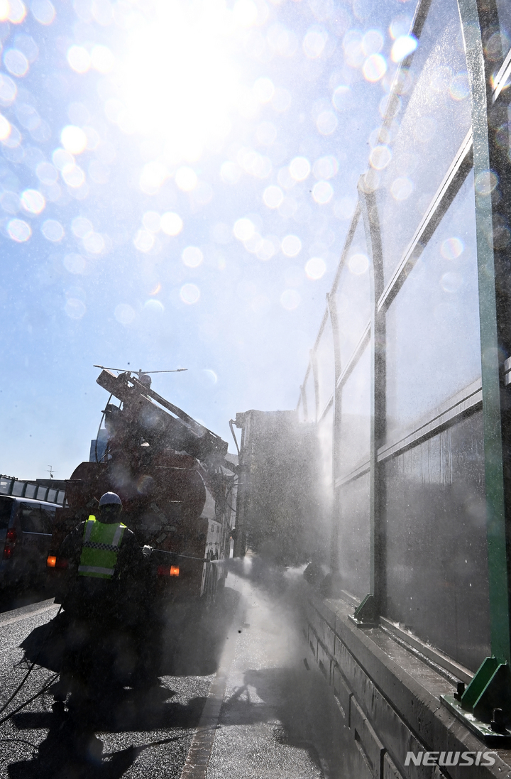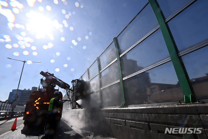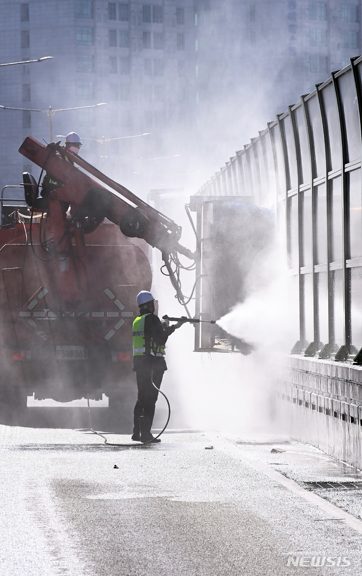 京畿道水原市八達区の東水原高架車道で2日、区庁関係者が清掃車両を用いて防音版など道路施設の清掃を行っているところ。