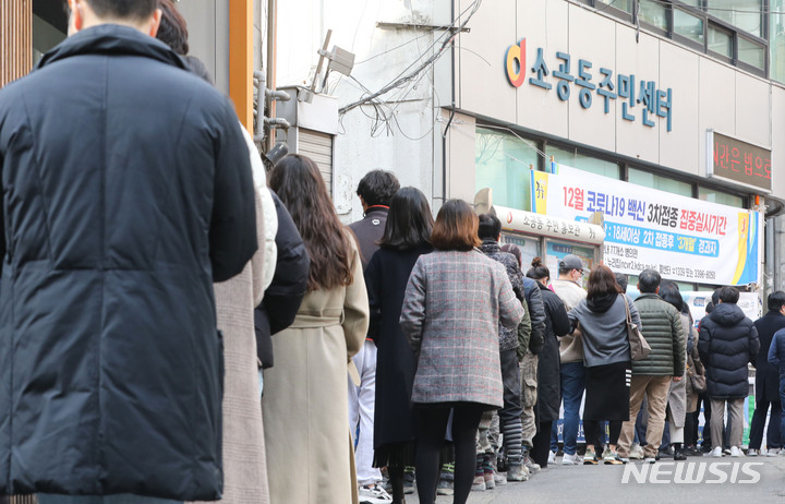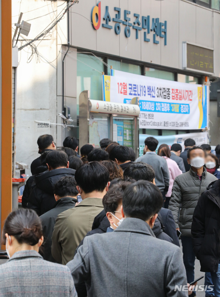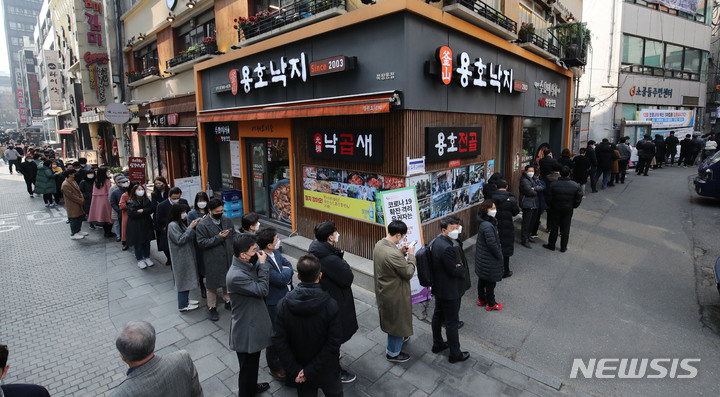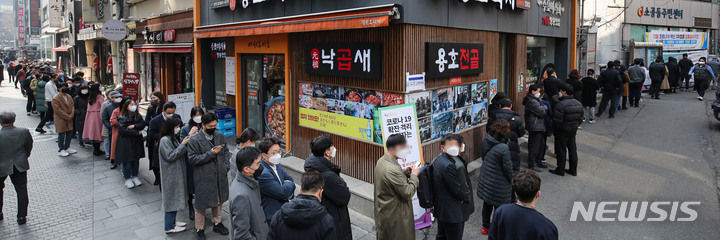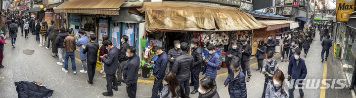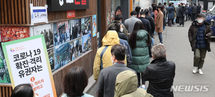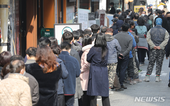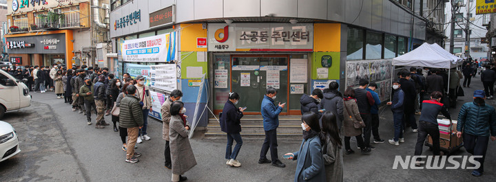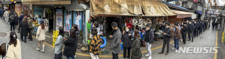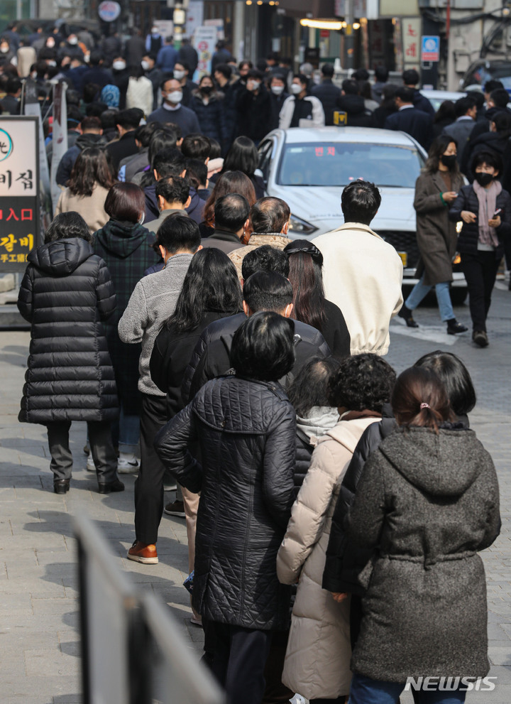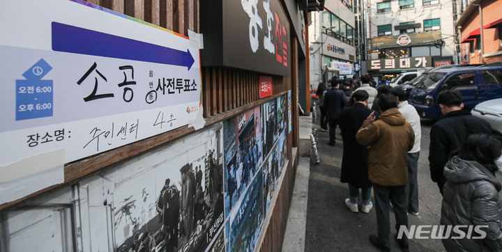 第20代韓国大統領選挙の事前投票が始まった4日午前、ソウル市中区小公洞の事前投票所では、有権者が事前投票をするため長い列を作っていた。