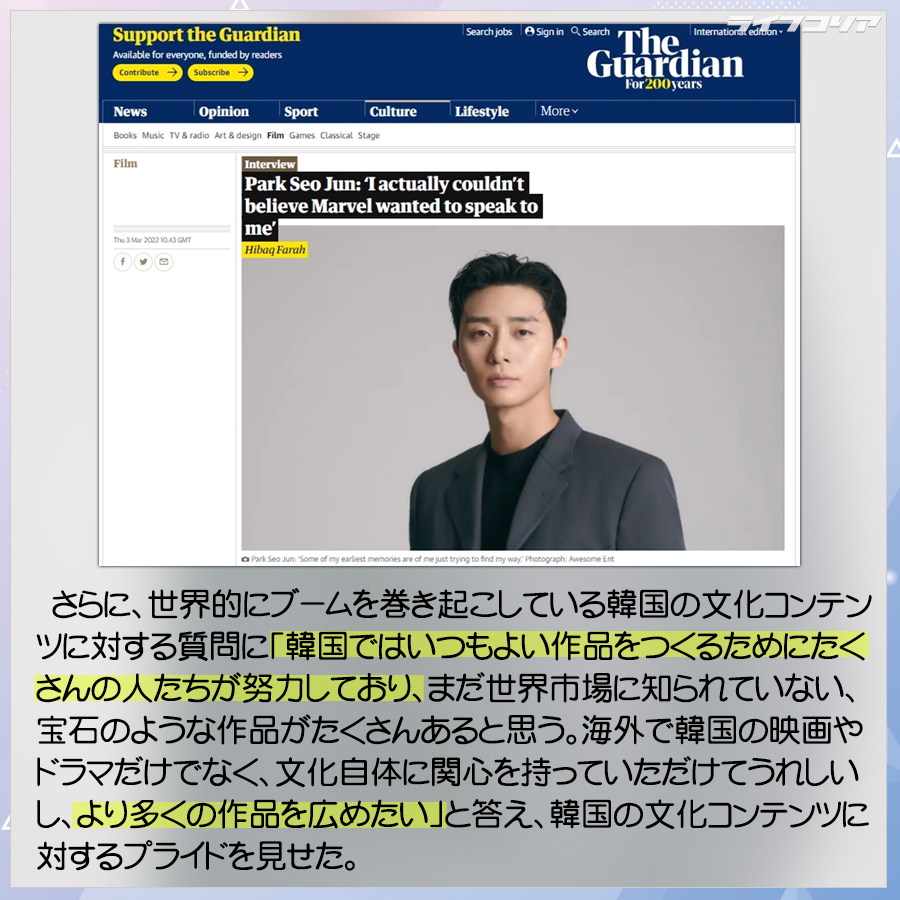 俳優パク・ソジュンと英紙ガーディアンの単独インタビューが報じられた。ガーディアンは3日(現地時間)、パク・ソジュンについてマーベル・シネマティック・ユニバース(MCU)に合流した韓国俳優と紹介し、パク・ソジュンの俳優人生や作品世界...