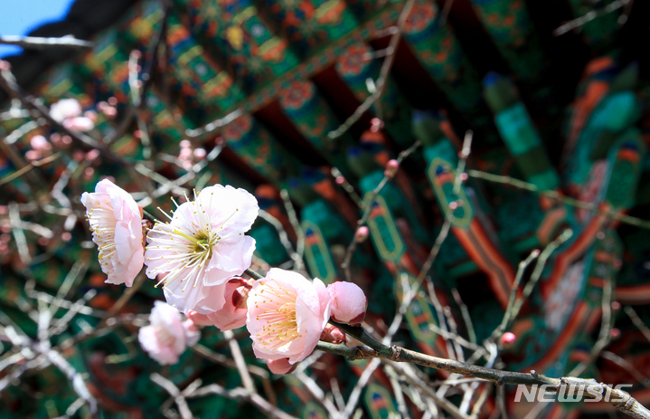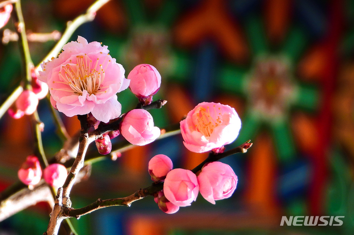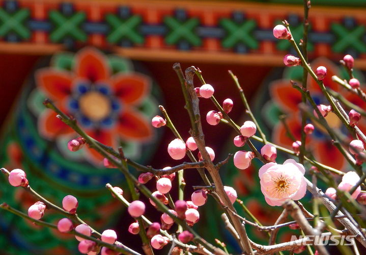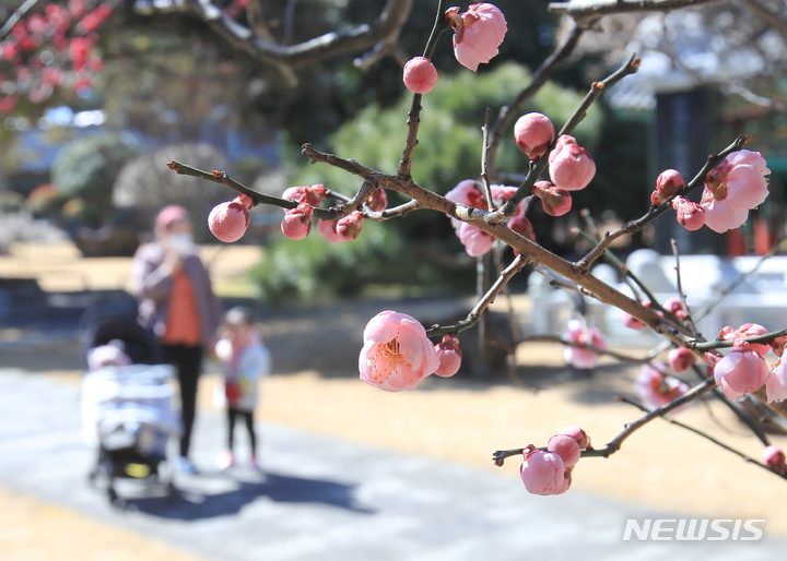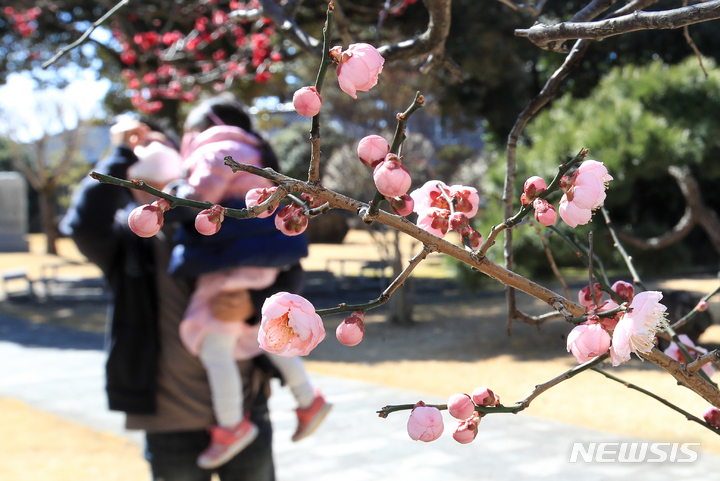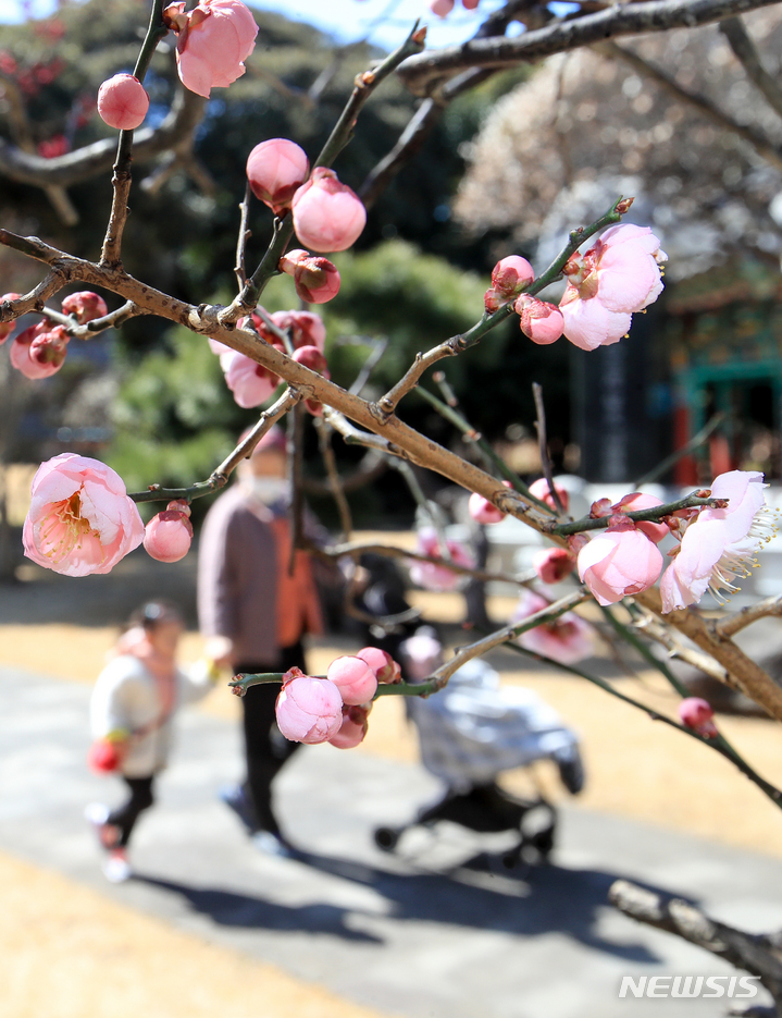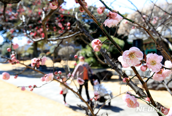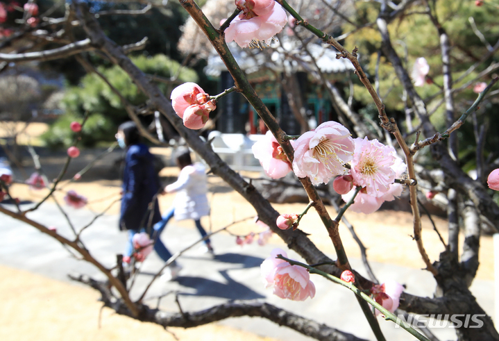 【NEWSIS】スッキリと晴れた6日午後、済州市内の月井寺で、淡いピンク色の梅の花を鑑賞し、春の日差しを楽しむ人々。