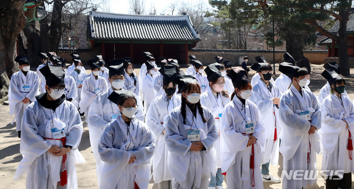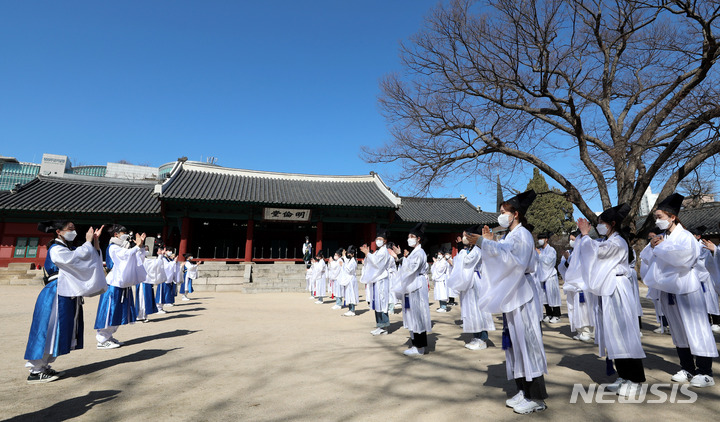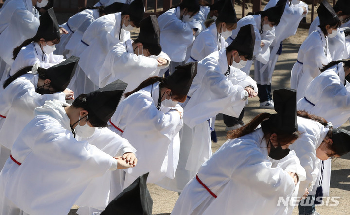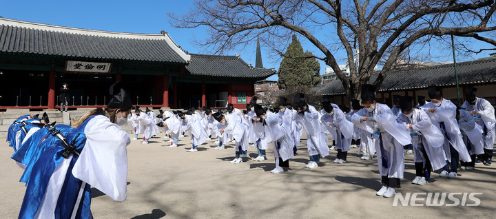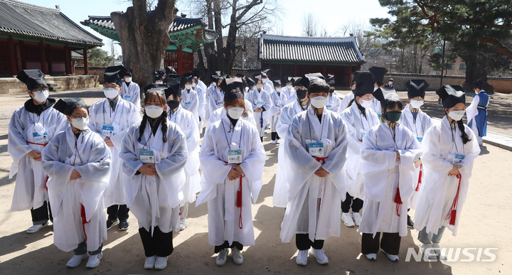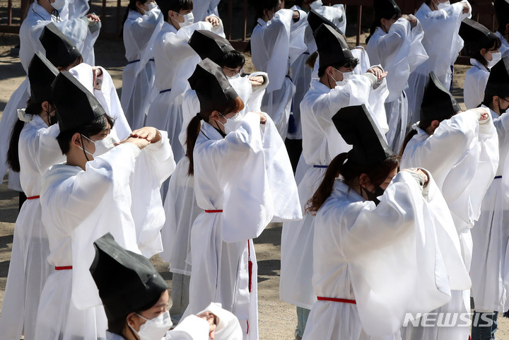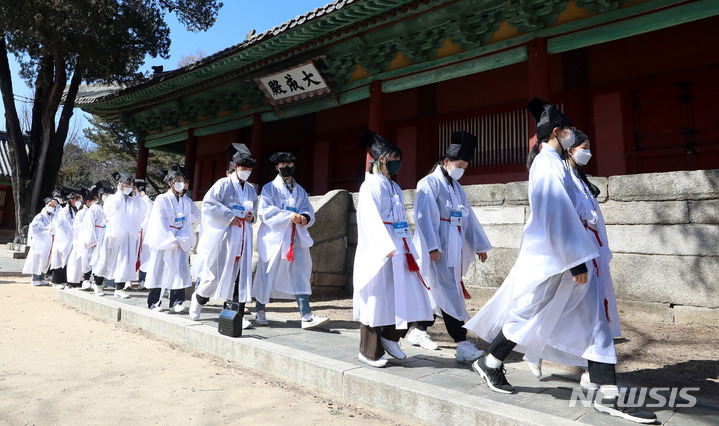 【NEWSIS】6日午後、ソウル市鍾路区の成均館で、朝鮮時代に科挙に合格した儒学生たちのための歓迎式に由来する「新榜礼」に出席した成均館大学の新入生たち。