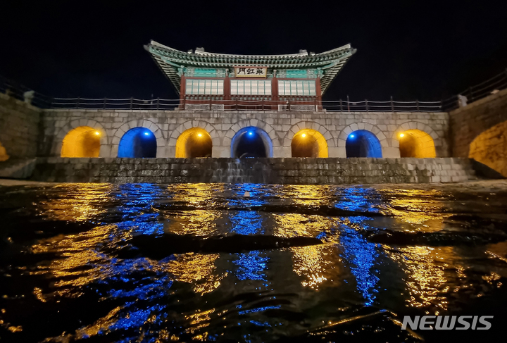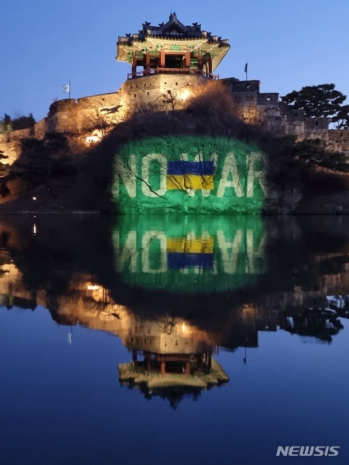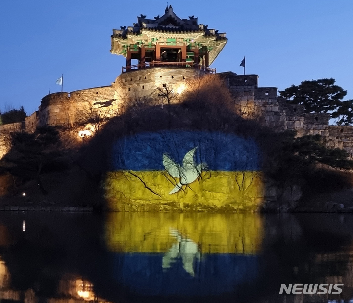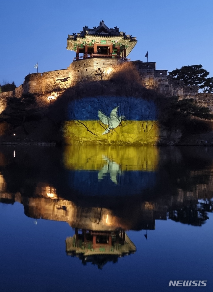 京畿道水原市八達区にある華虹門や訪花隨柳亭、水原華城の城壁が7日、ウクライナの平和を願ってライトアップされた。