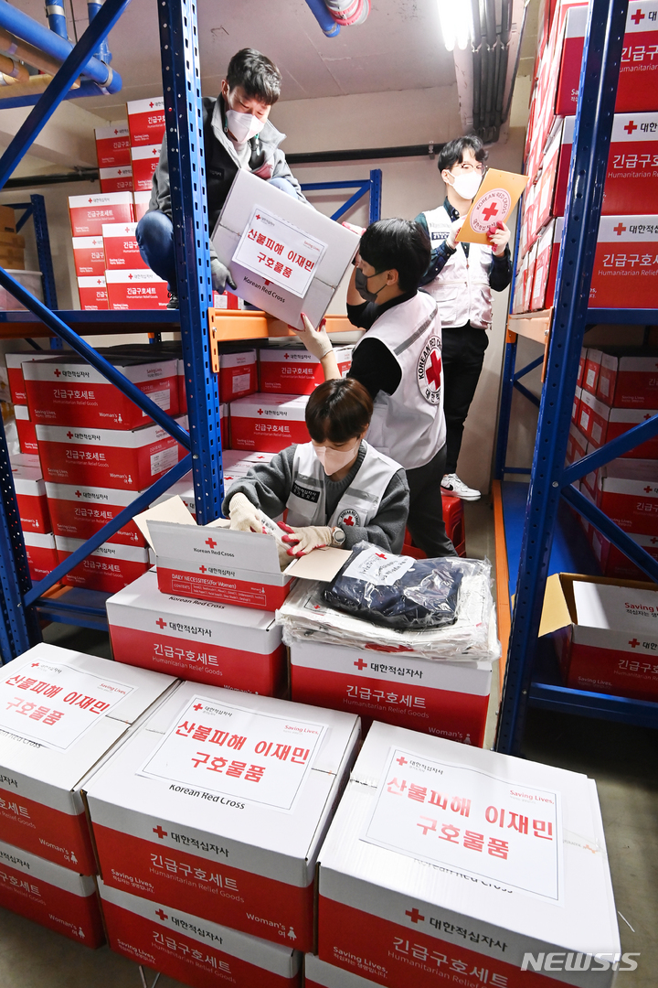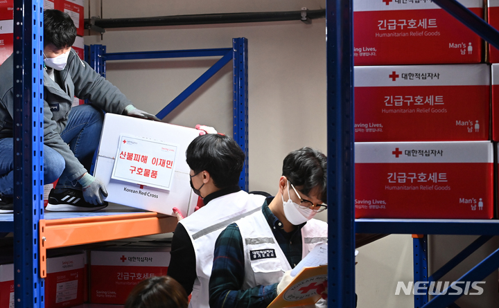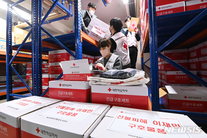 京畿道水原市勧善区にある大韓赤十字社京畿道支社で7日午後、関係者らが山火事の被害に遭った被災者のための支援物資を点検していた。
