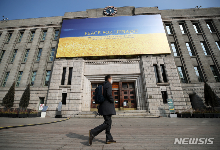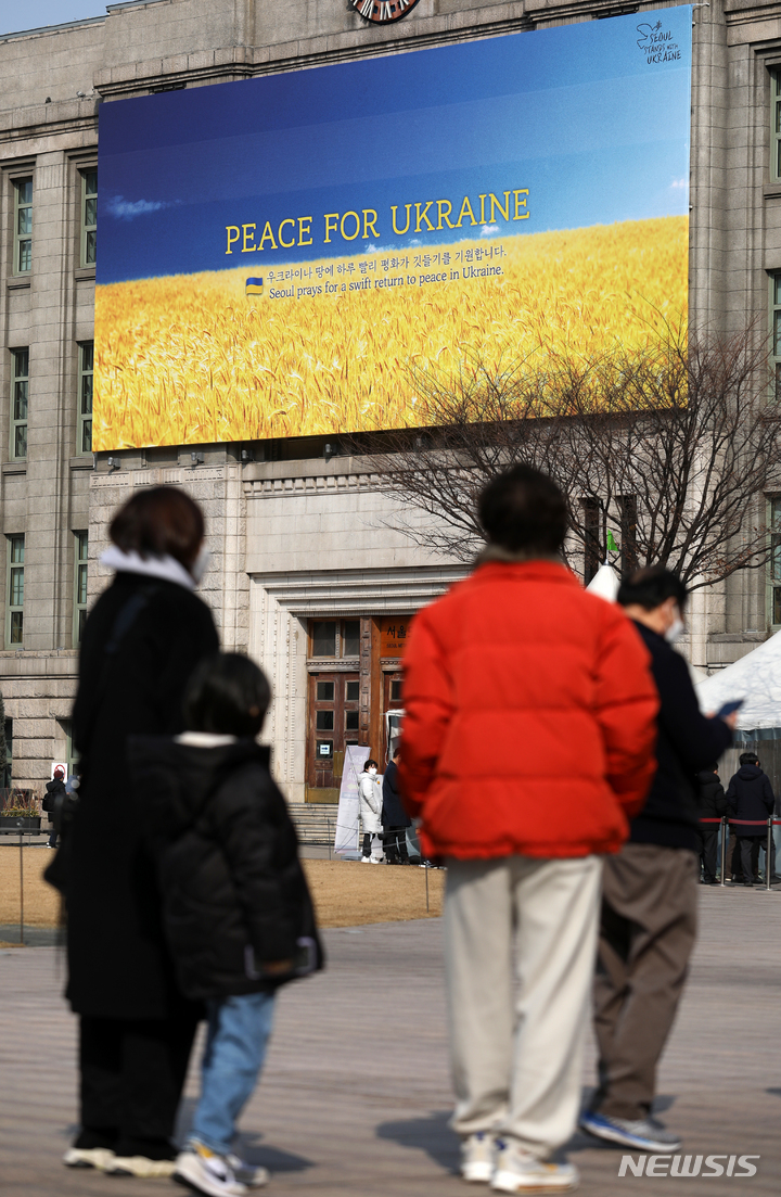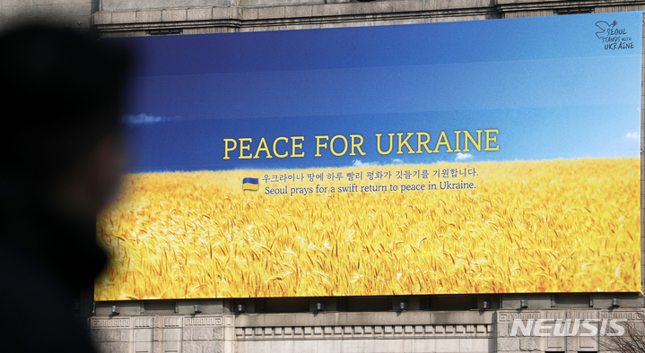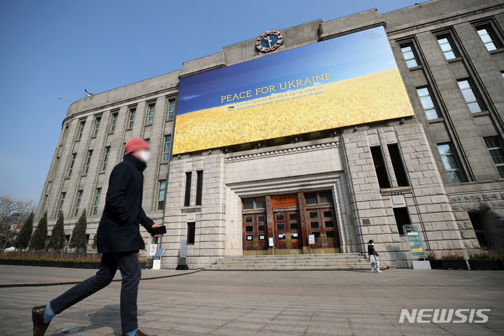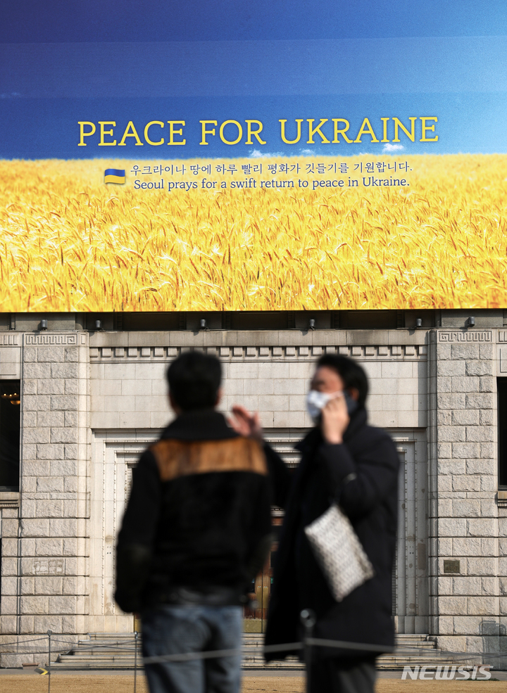 8日午前、ソウル図書館(ソウル市中区)の外壁の「夢刻み板」には、ウクライナの平和を願うメッセージが掲げられていた。
