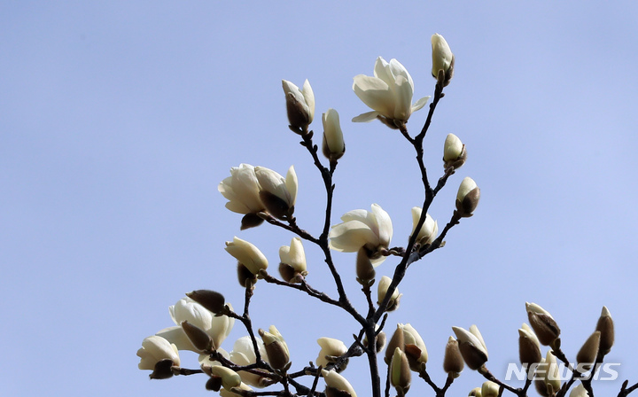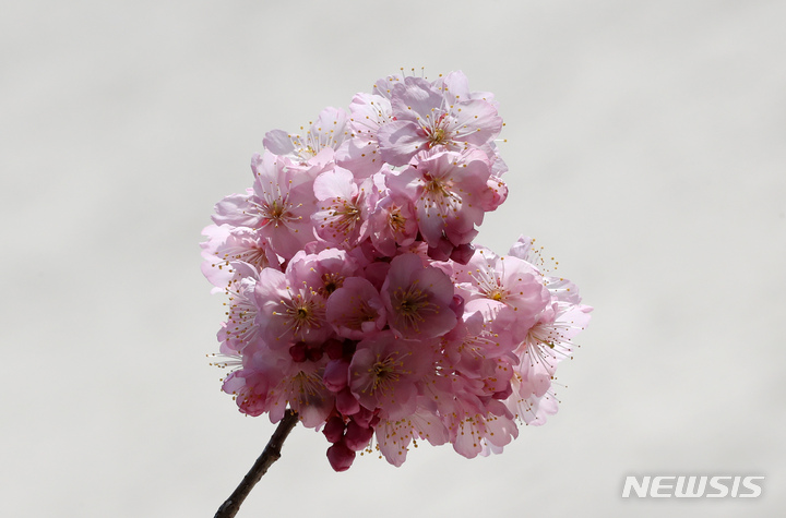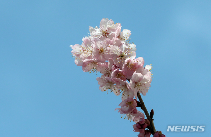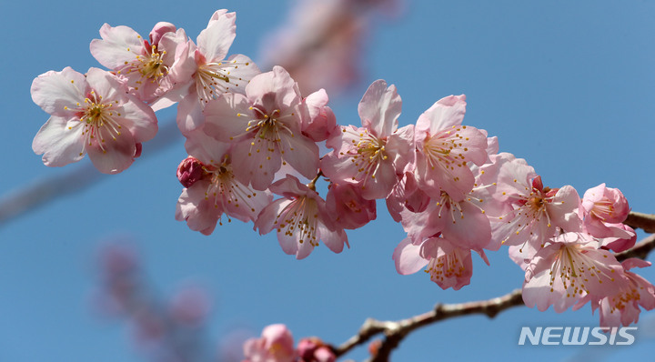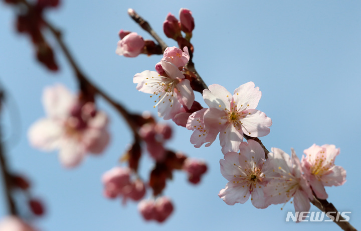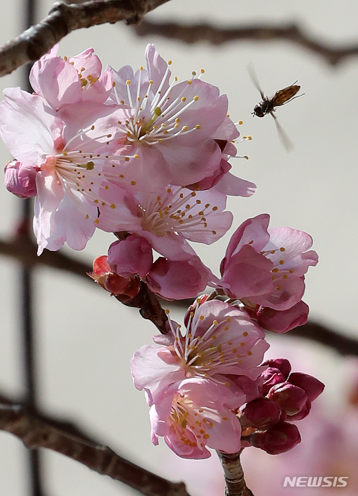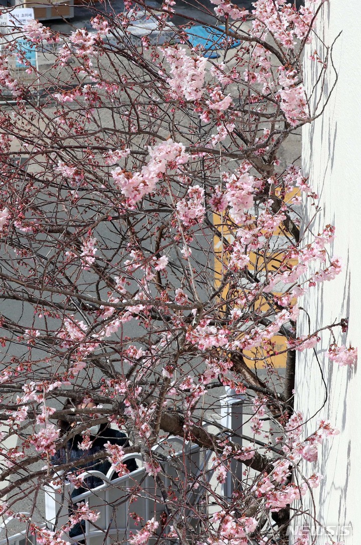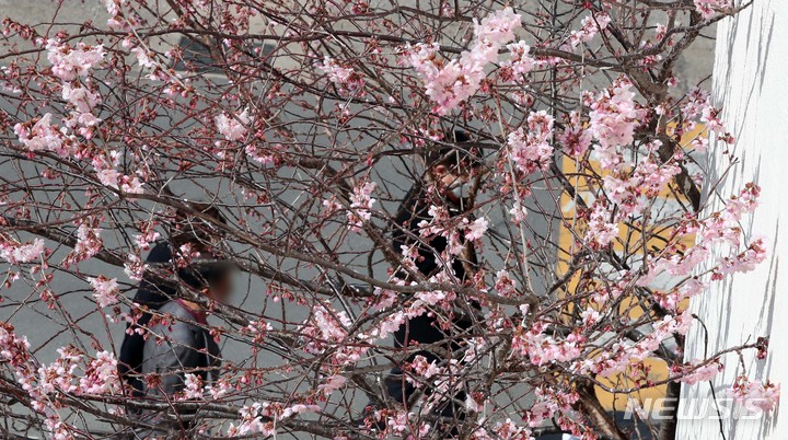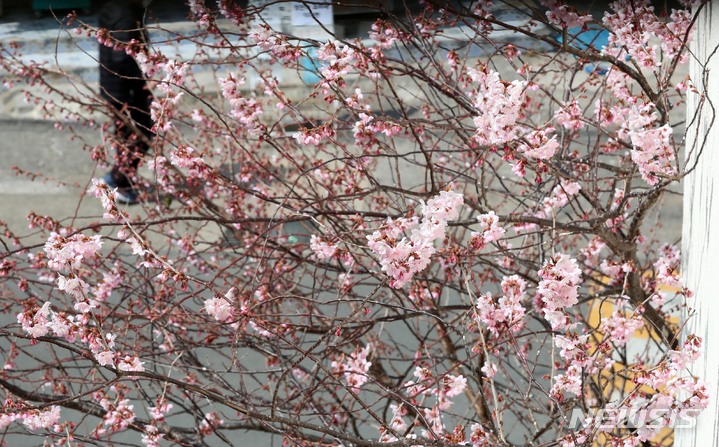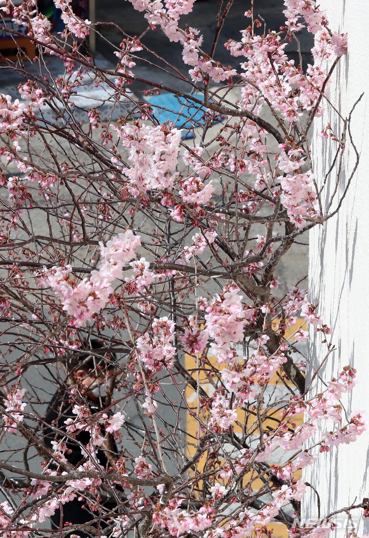 うららかな天気となった10日、釜山市水営区の培花学校の塀沿いではサクラが開花し始め、市民の目を引き付けている。