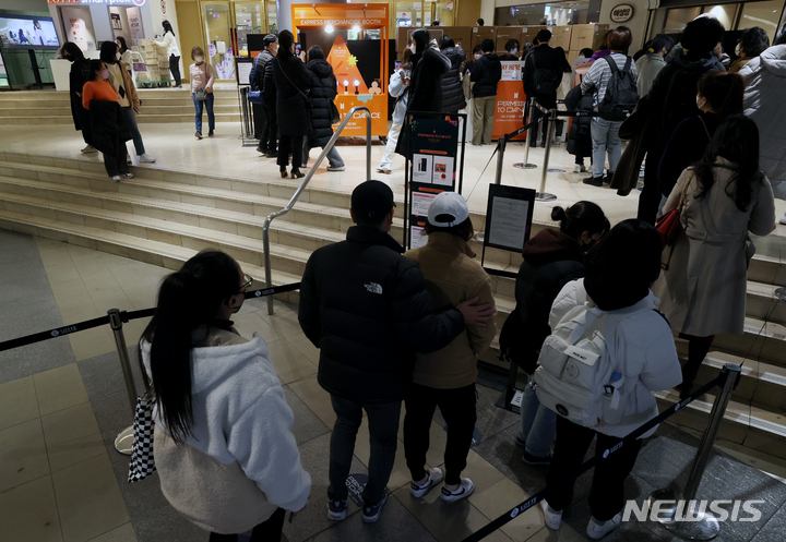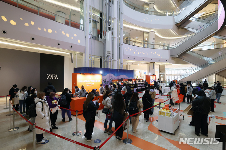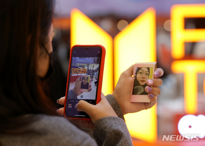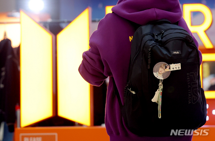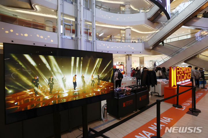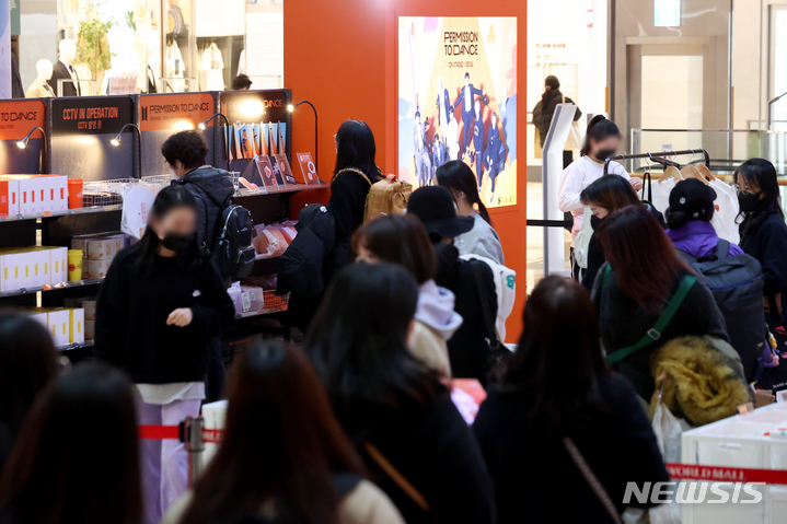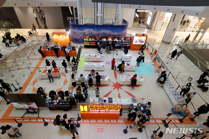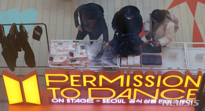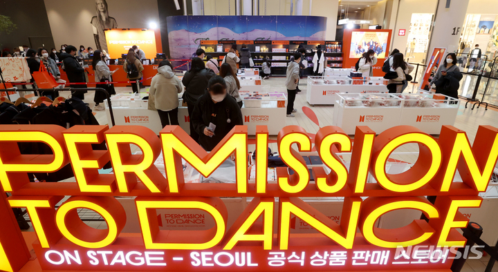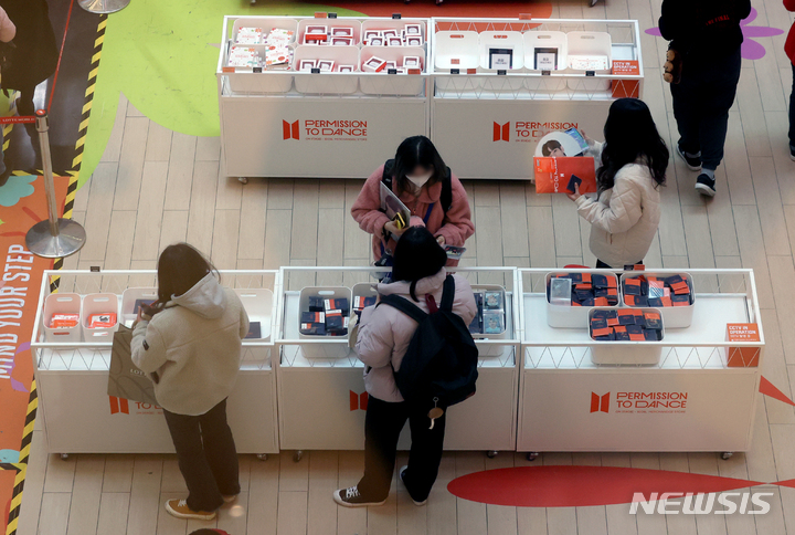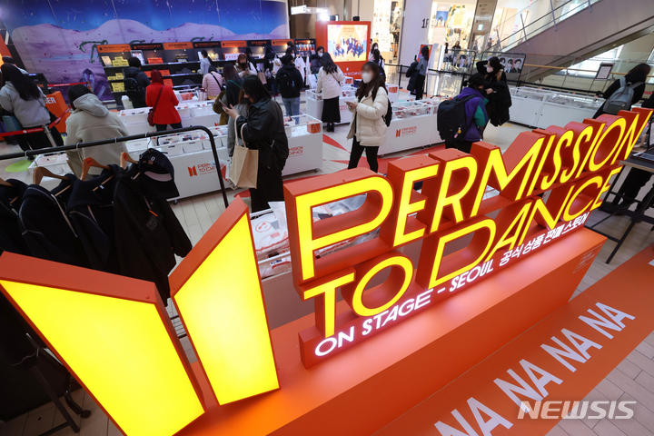 アイドルグループ防弾少年団の「Permission to Dance」コンサート初日となる10日午後、ソウル市松坡区のロッテワールドにオープンした公式商品のポップアップストアで、グッズを見て回る人々の様子。