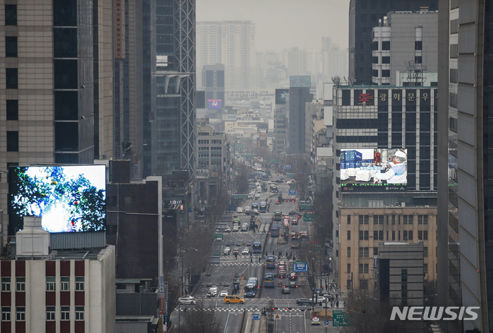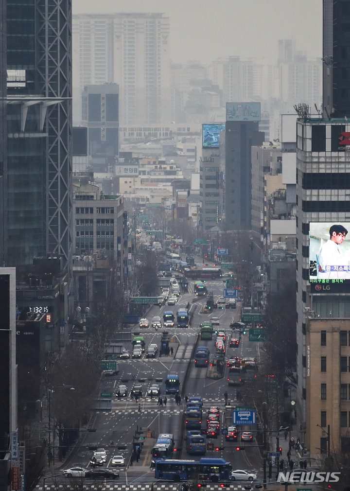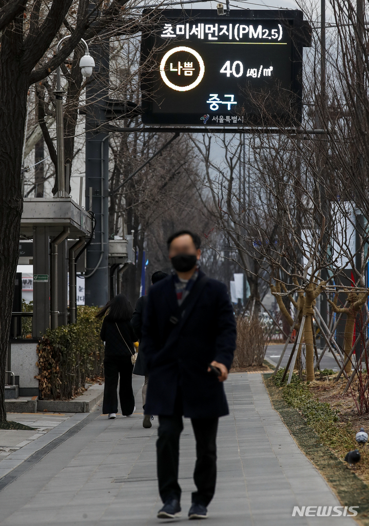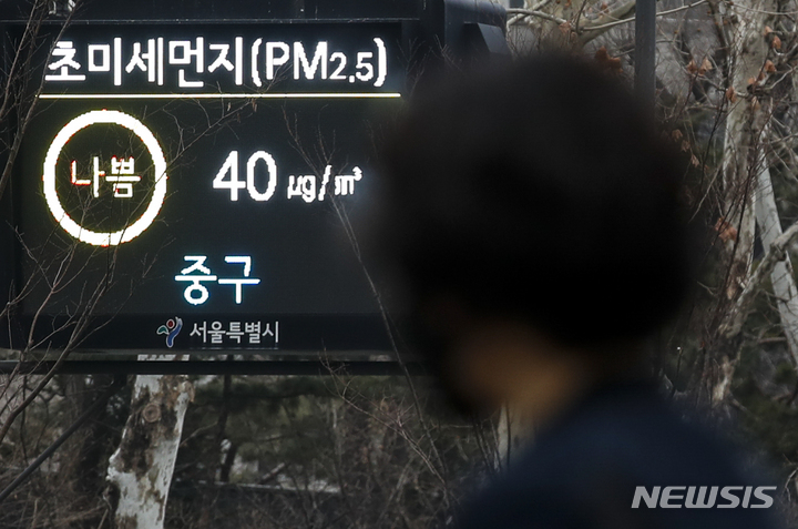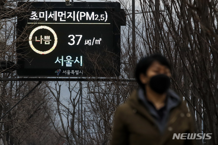 【NEWSIS】PM2.5などの微小粒子状物質の濃度が「不良」となった11日午前、ソウル市中区の世宗大路に設置された電光掲示板には、PM2.5の数値が表示されていた。