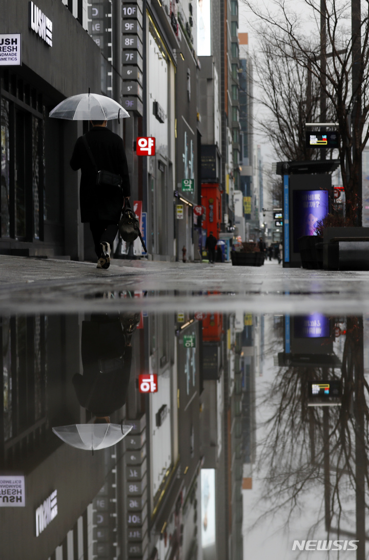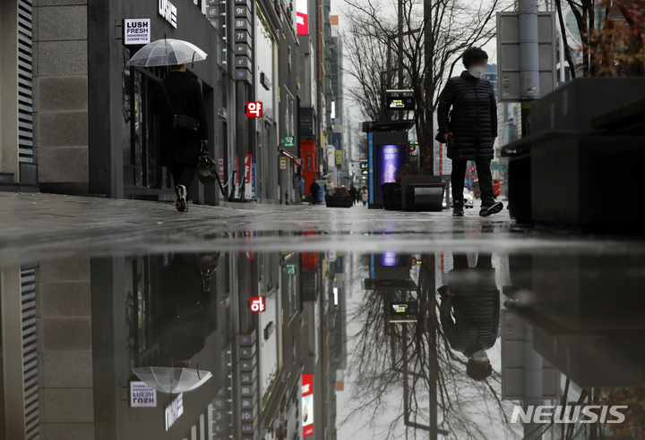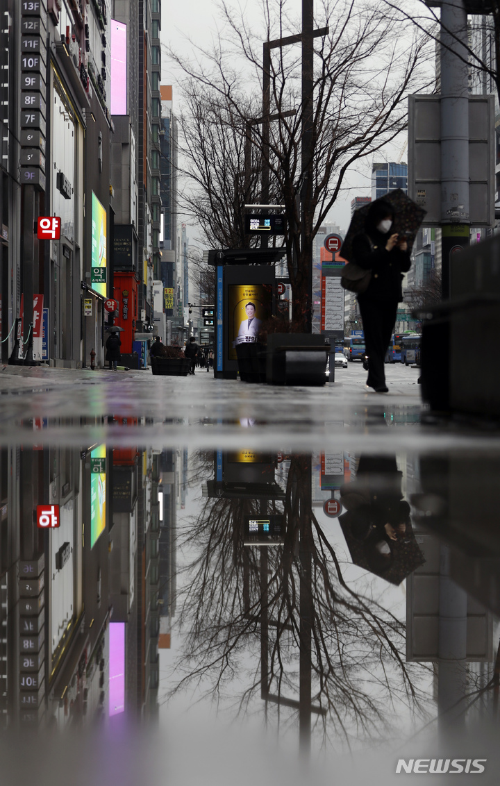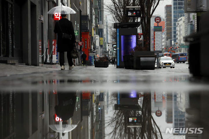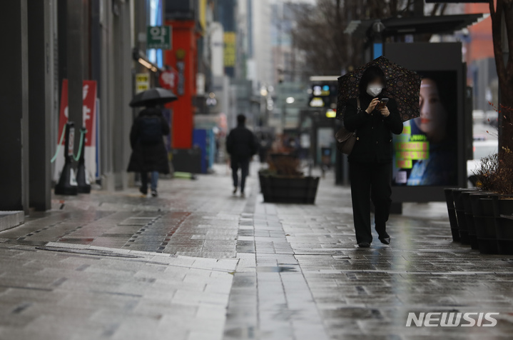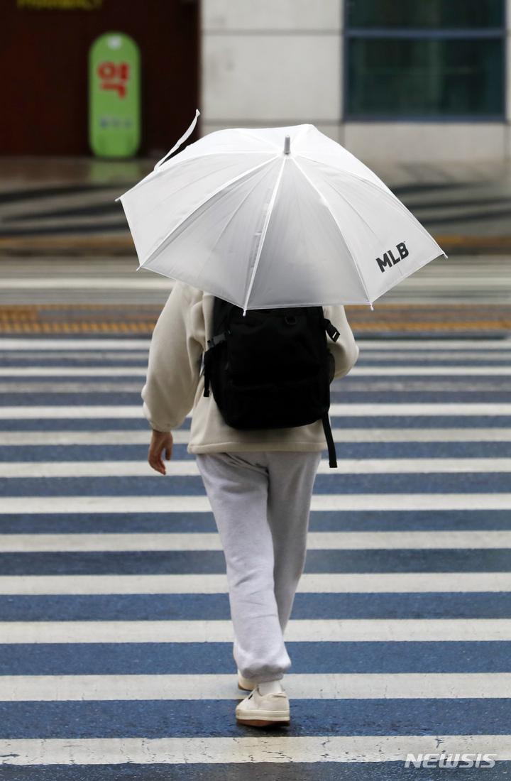 【NEWSIS】全国的に雨となった13日、ソウル市内の江南駅近くで傘をさして足早に歩く人々。