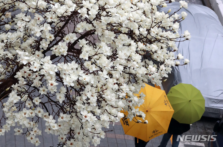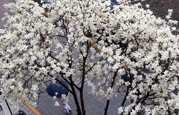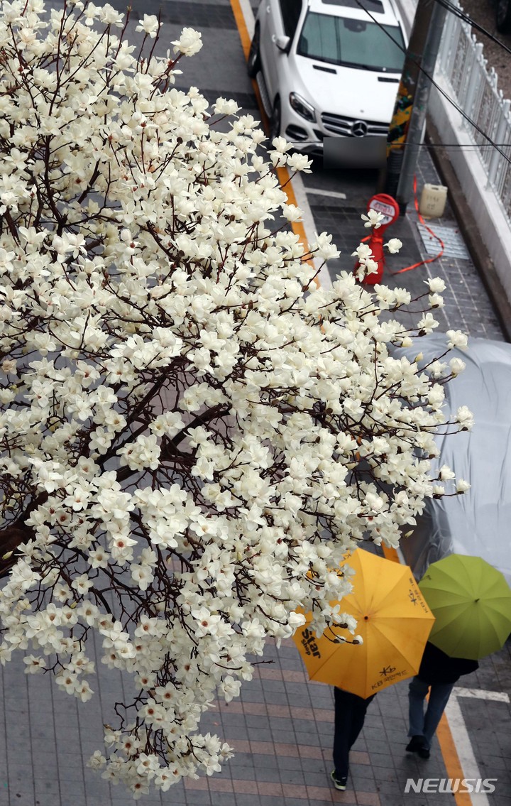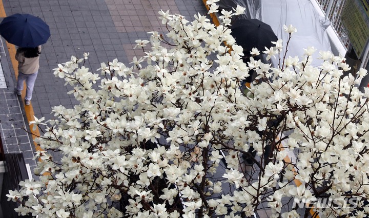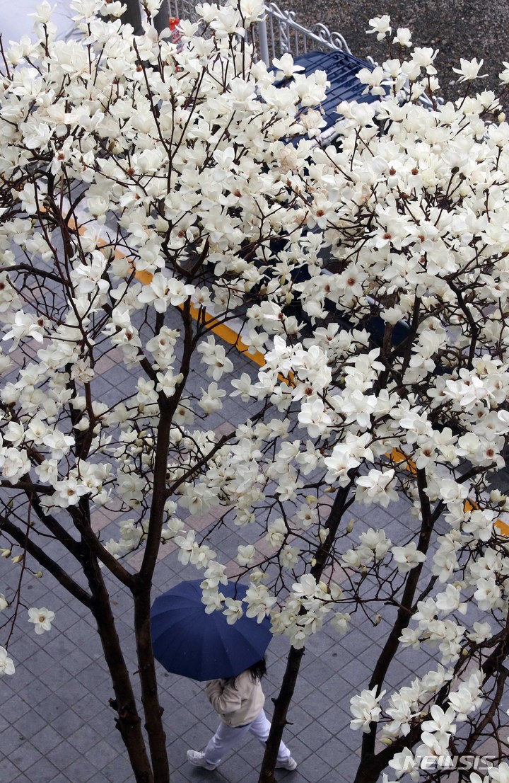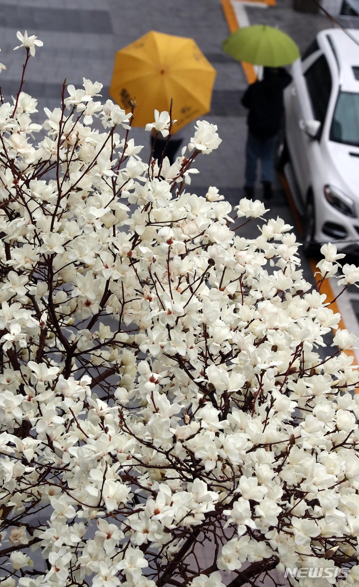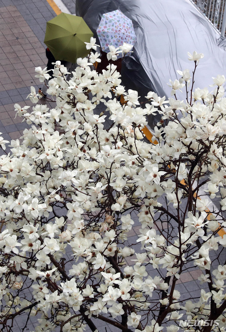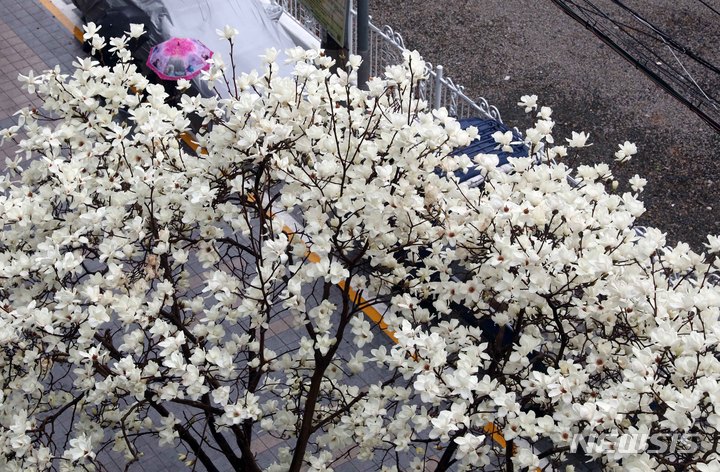 【NEWSIS】春の雨となった13日、釜山市南区にある住宅街では、モクレンの花が満開となり、人々が足を止めていた。