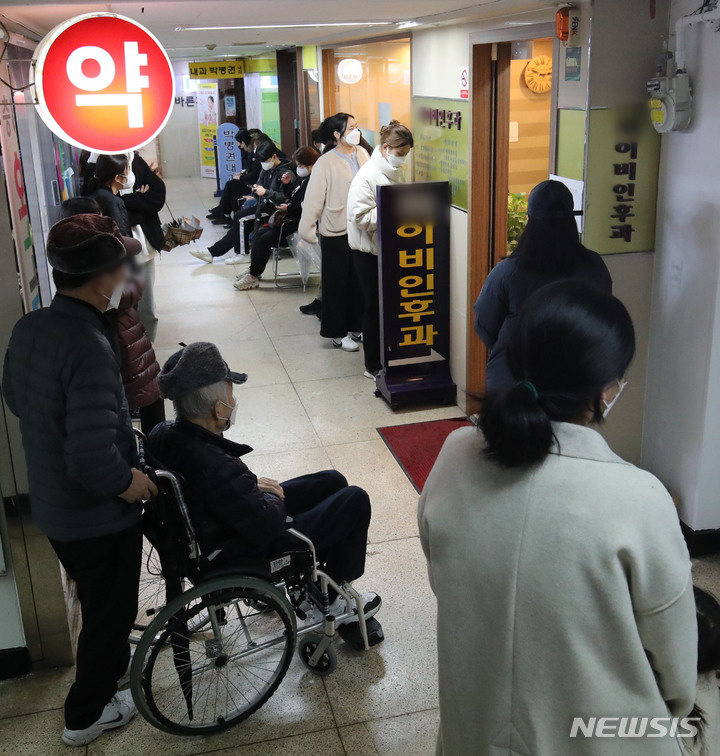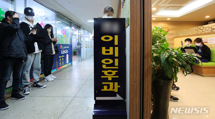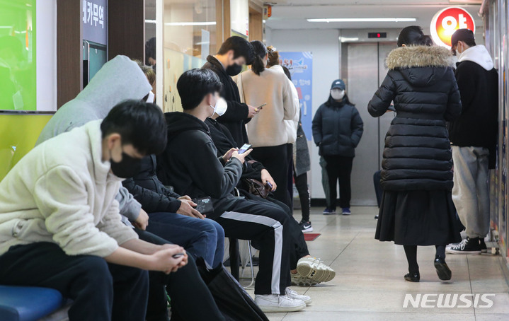 病院・医院などの医療機関で抗原検査を受け、陽性判定が出ると、追加でPCR検査を受けずに陽性者に分類されることになって初日の14日午後、ソウル市内の耳鼻咽喉科は検査を受けようと来院した人たちで混雑していた。