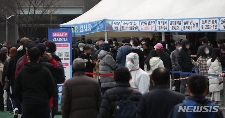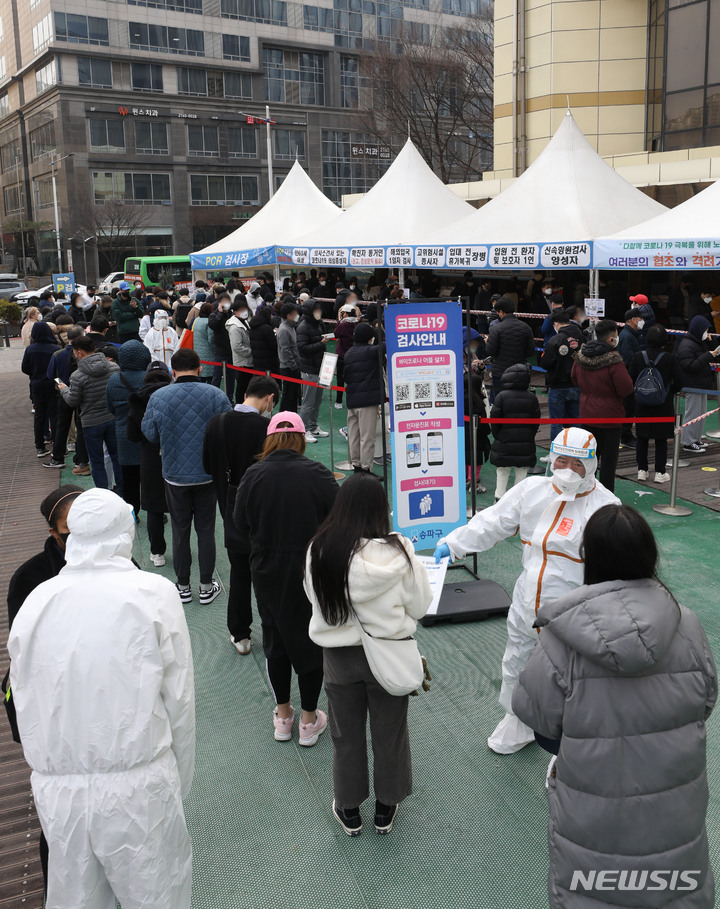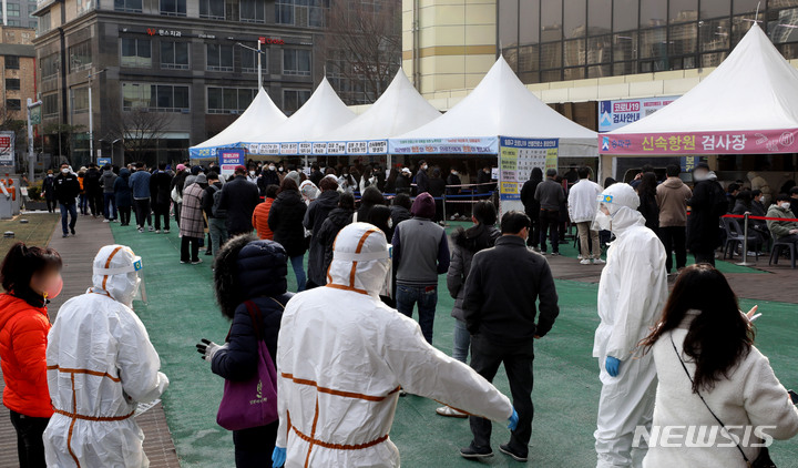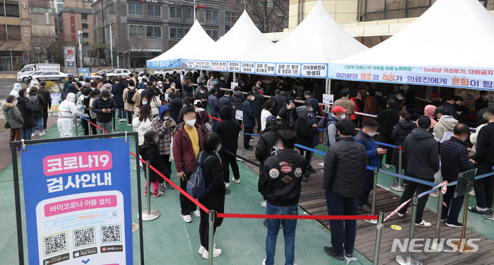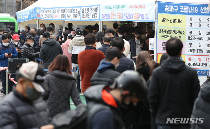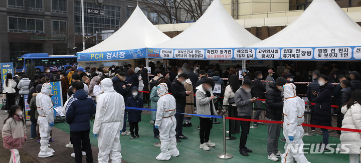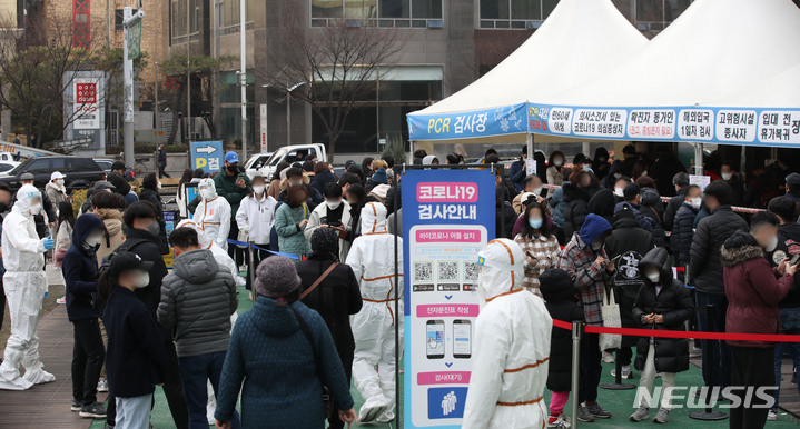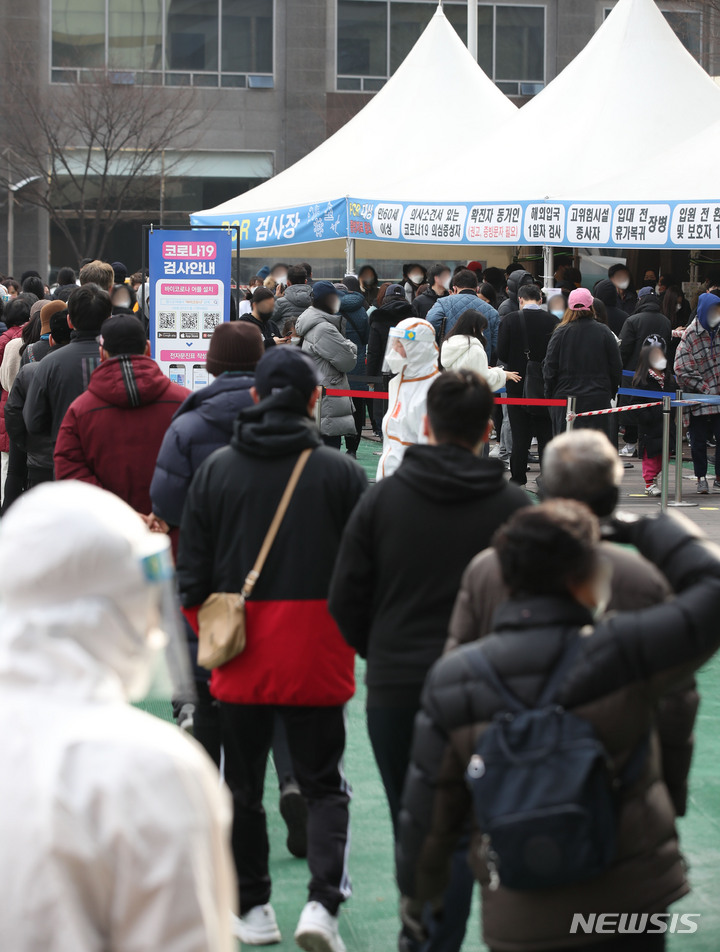 写真は15日午前、ソウル市内の松坡区保健所選別検査所でPCR検査や抗原検査を受けるため、列をなしている市民たち。