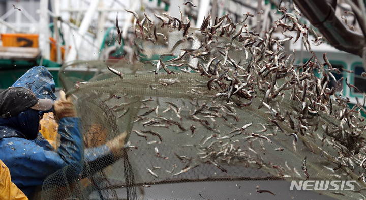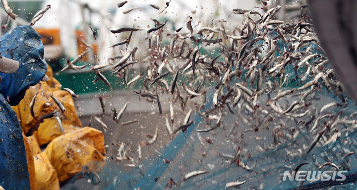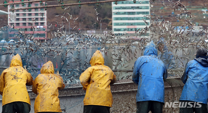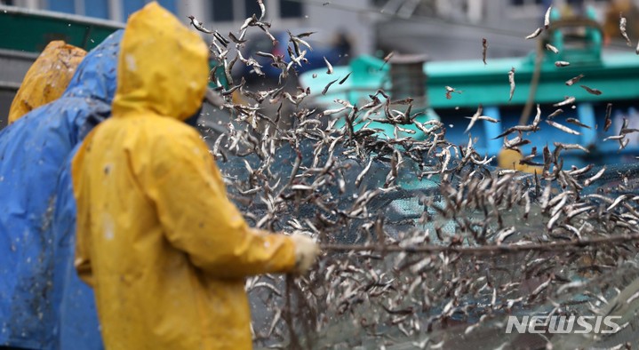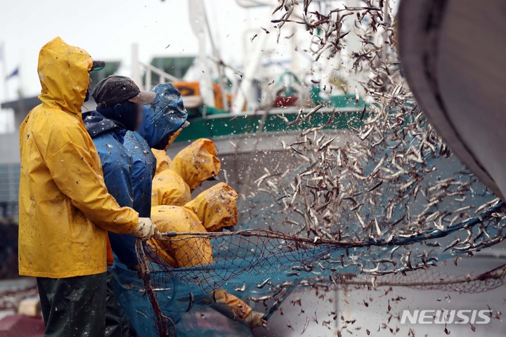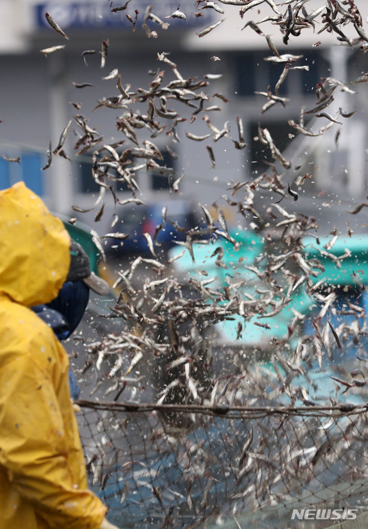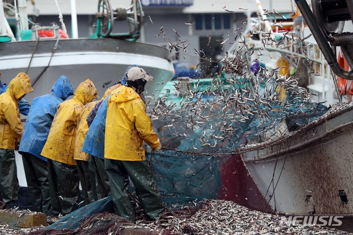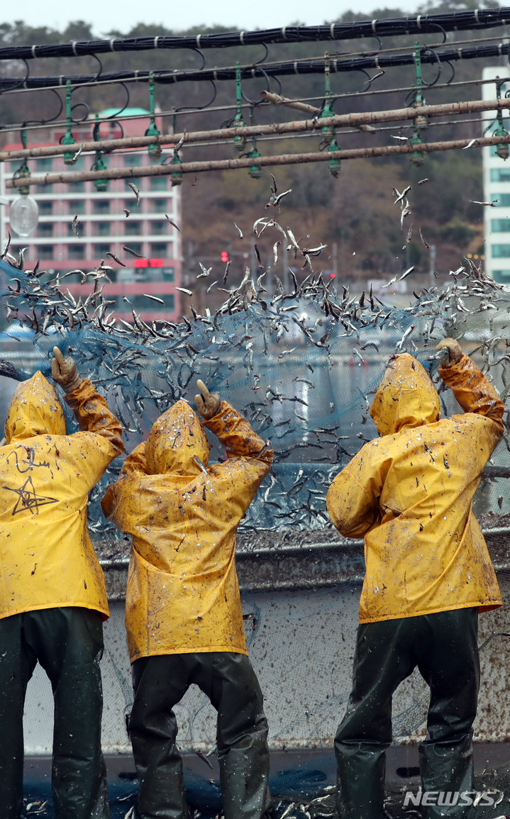 【NEWSIS】14日午後、釜山市機張郡の大辺港で、春のカタクチイワシをとる沿岸流し網漁の漁船。春のカタクチイワシは体長10-15センチメートルで焼き魚・刺身・塩辛などで食される。