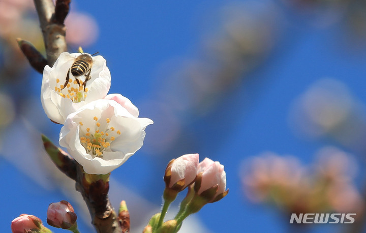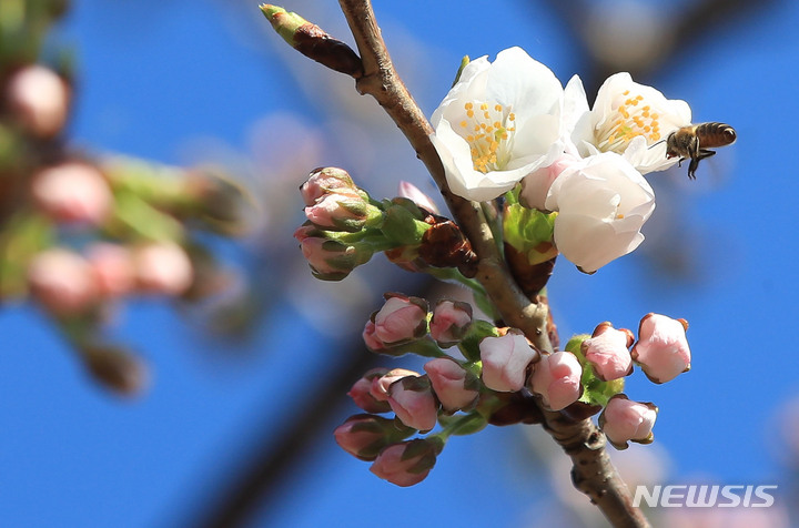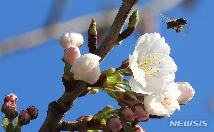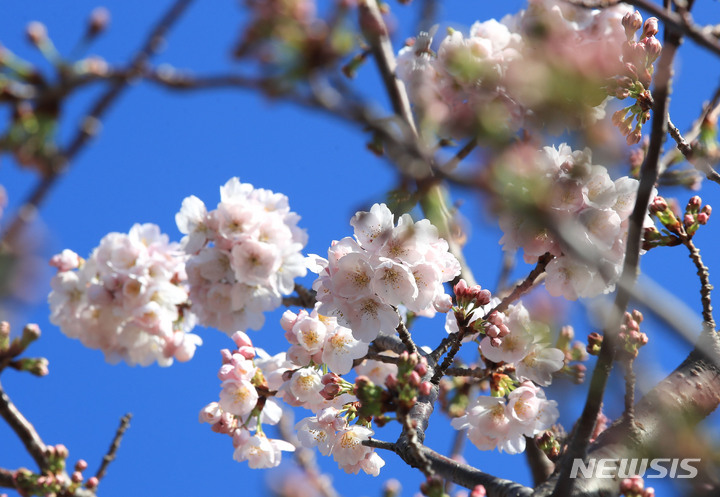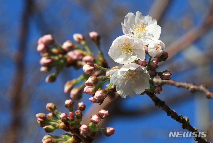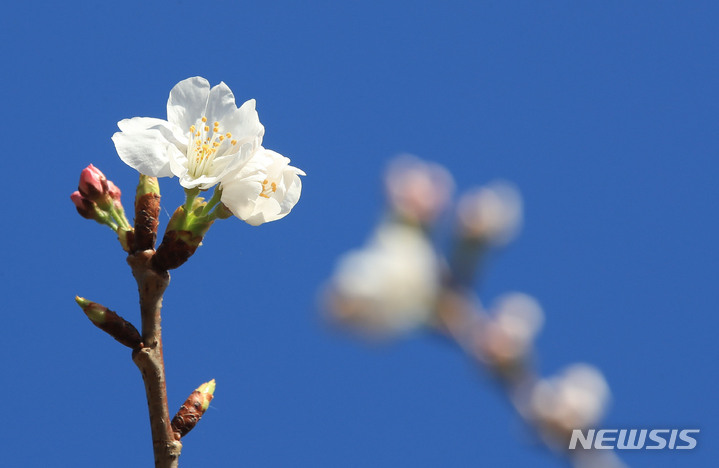 晴天となった15日午前、済州市道頭洞では今年最初の桜が咲き、春らしい雰囲気を漂わせていた。