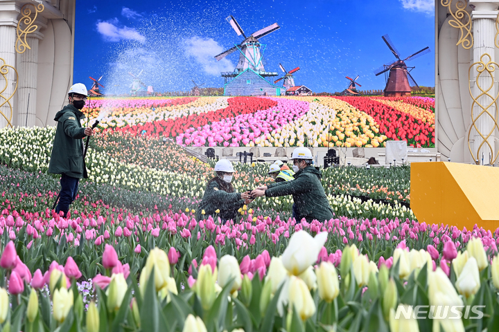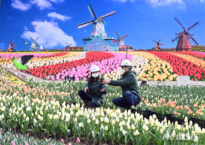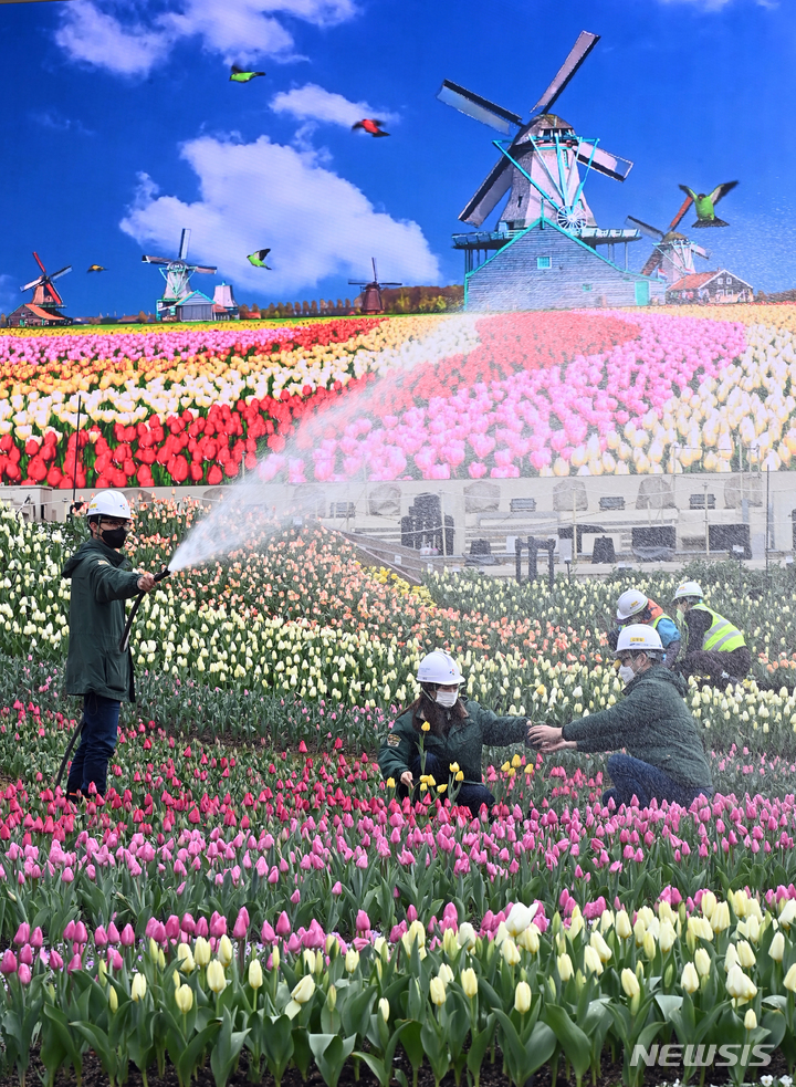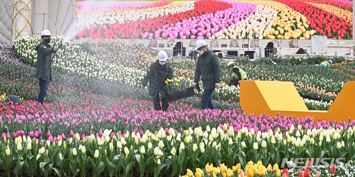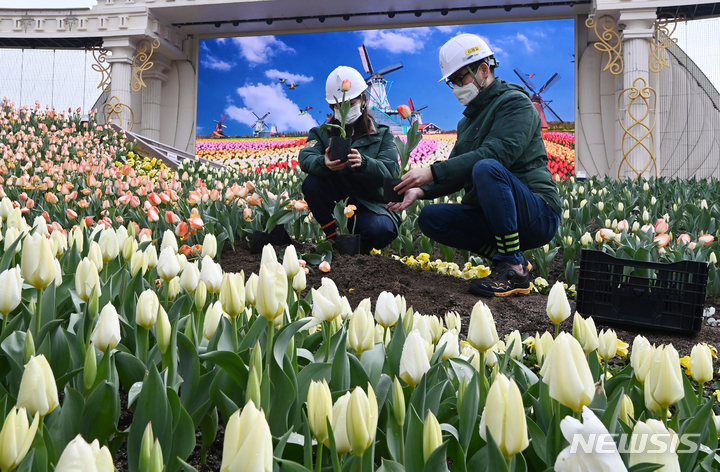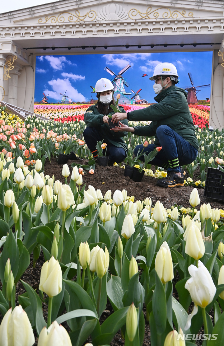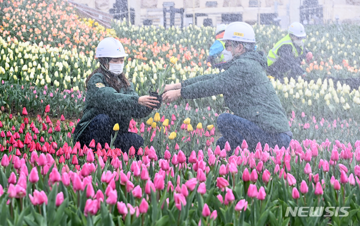 エバーランド(京畿道竜仁市)の「チューリップパワー・ガーデン」で15日午前、関係者がチューリップの植え替えなどチューリップ祭りの準備を行っている。今年で30周年を迎えるチューリップ祭りは、今月18日から来月24日までの開催だ。