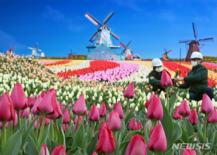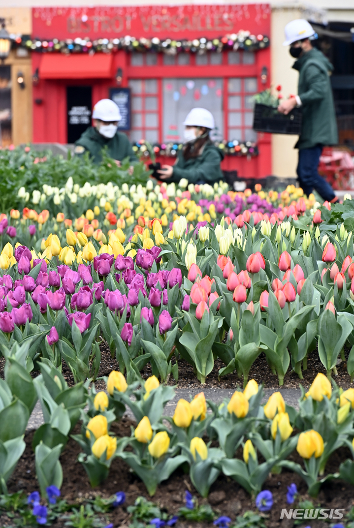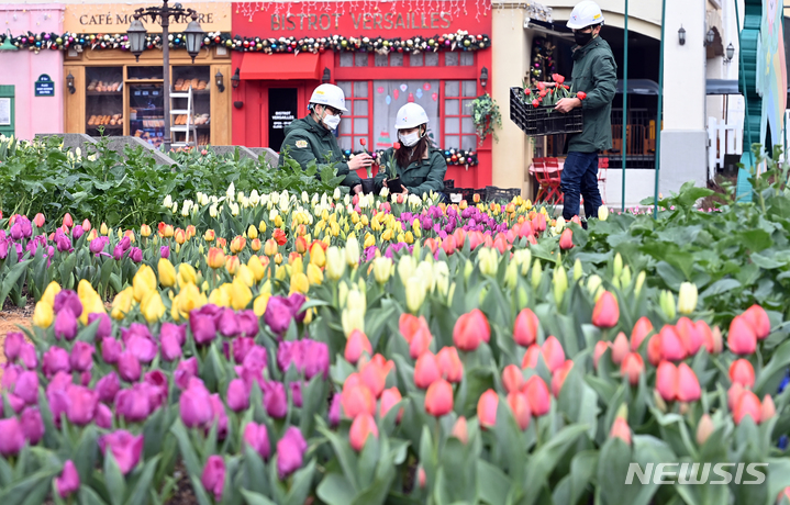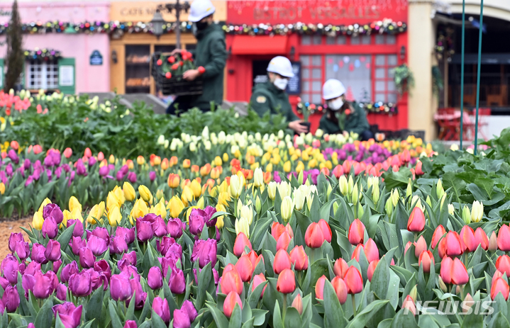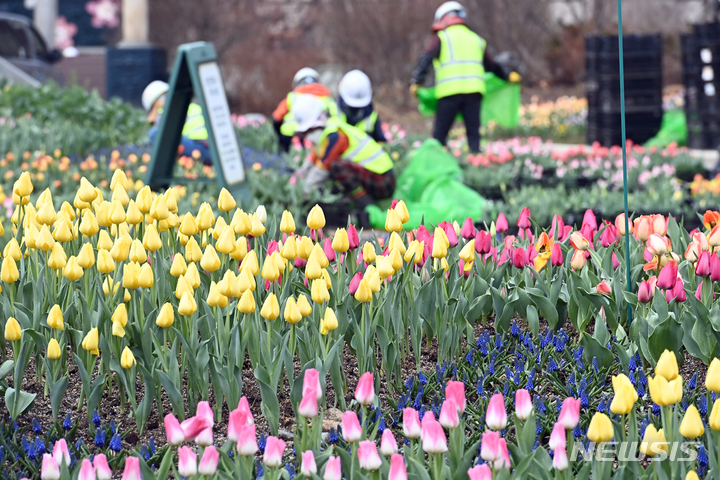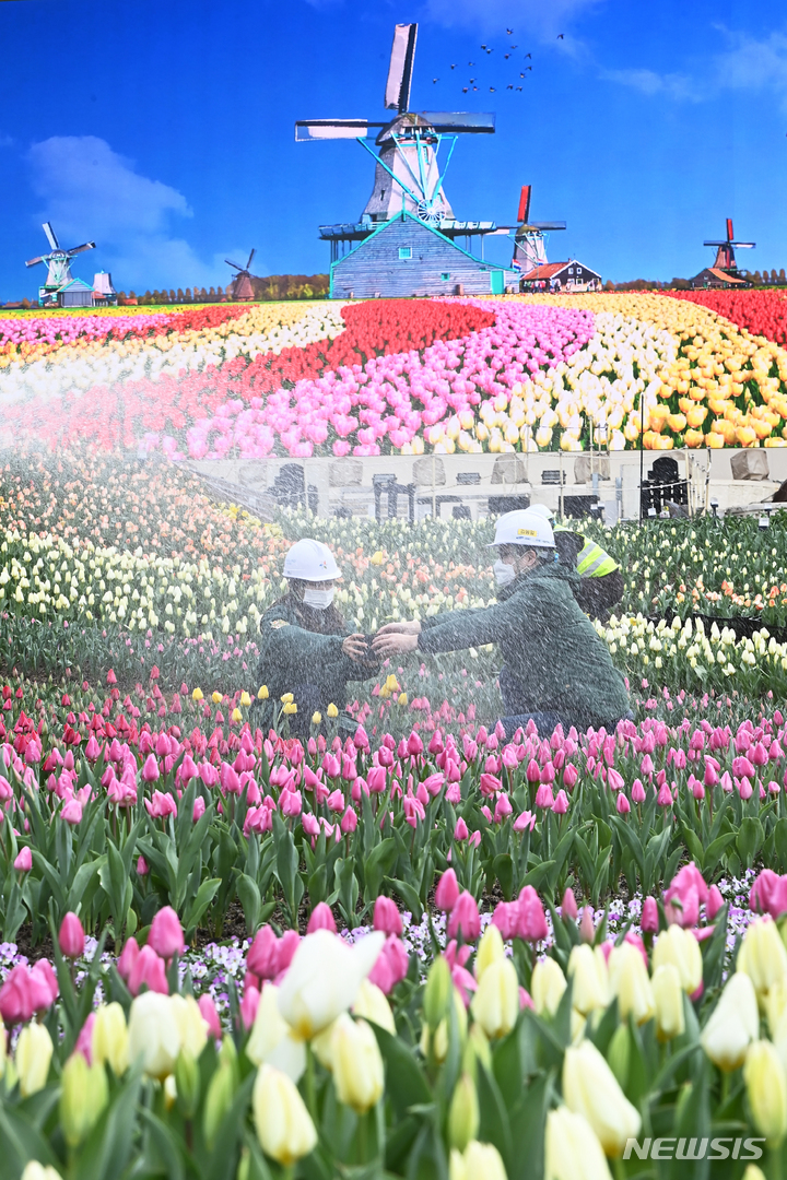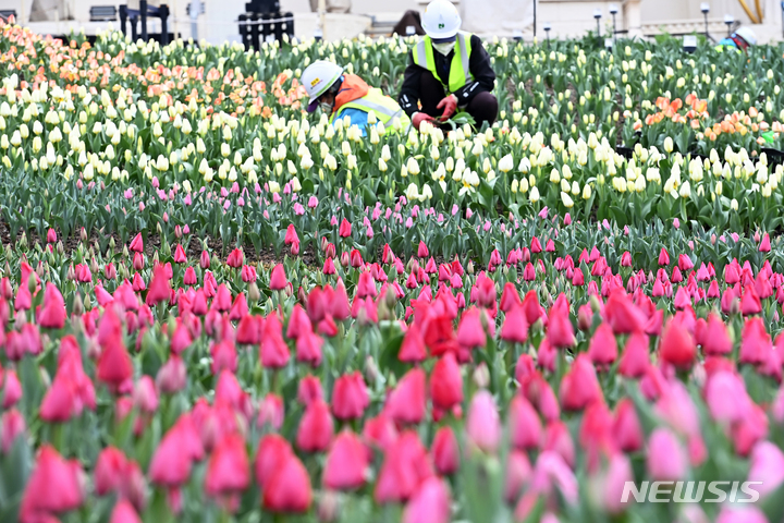 エバーランド(京畿道竜仁市)の「チューリップパワー・ガーデン」で15日午前、関係者がチューリップの植え替えなどチューリップ祭りの準備を行っている。今年で30周年を迎えるチューリップ祭りは、今月18日から来月24日までの開催だ。
