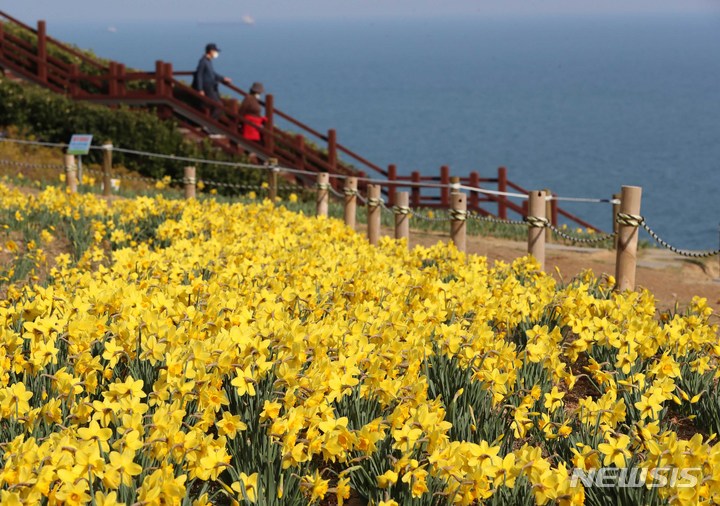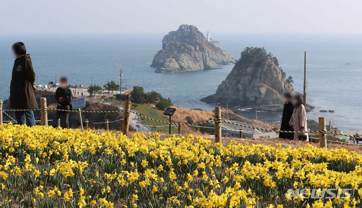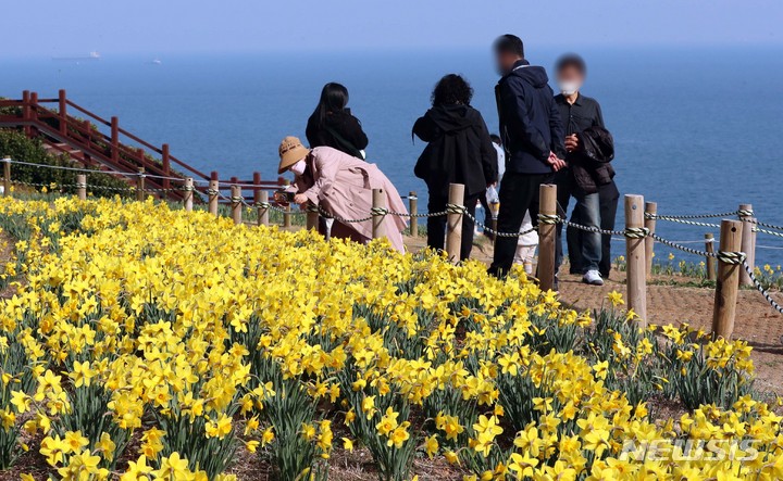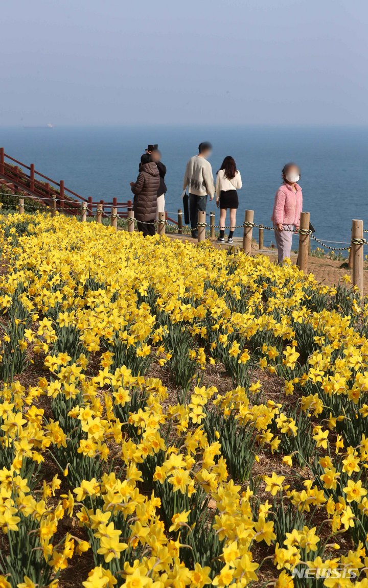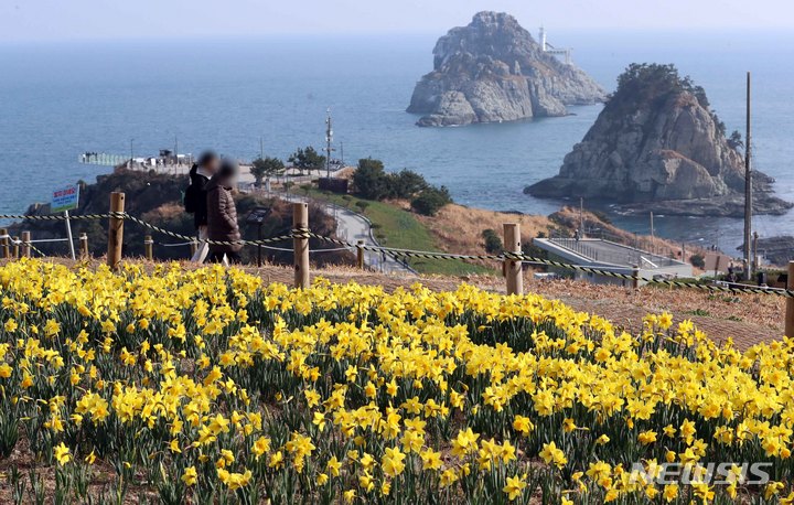穏やかな陽気となった15日、釜山市南区の五六島日の出公園を訪れた市民たちが咲き誇る水仙の花や青い海を眺めながら春のお出掛けを楽しんでいた。