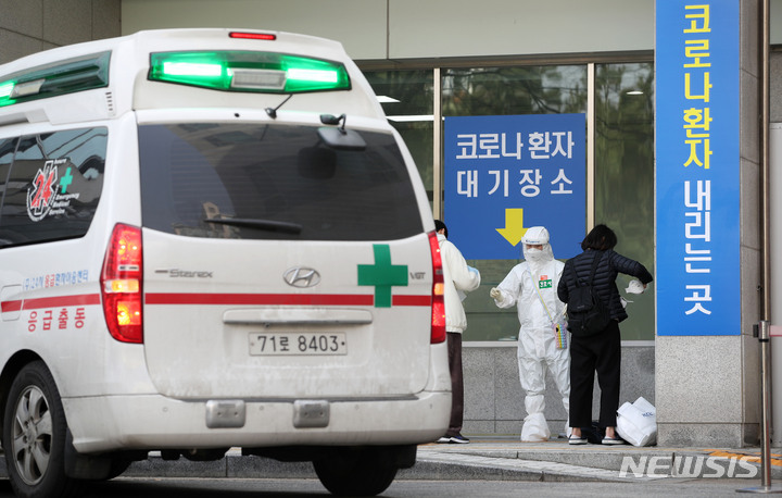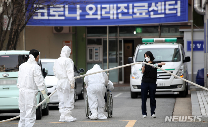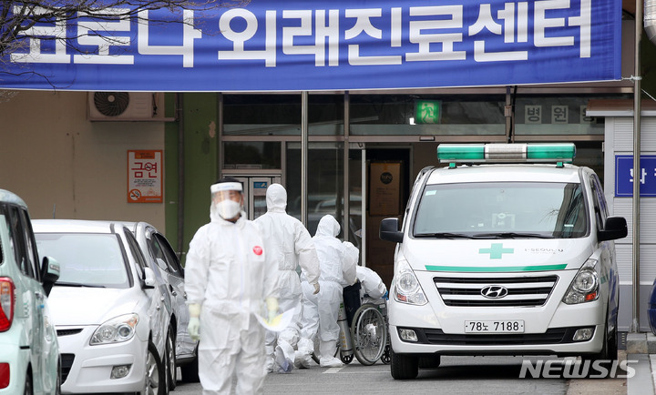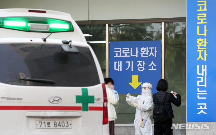 午前0時現在で新型コロナの危重症患者が1244人、重症患者病床の稼働率が64.2%に達した16日午後、ソウル市恩平区のソウル市立西北病院で患者を移送している医療陣の様子。