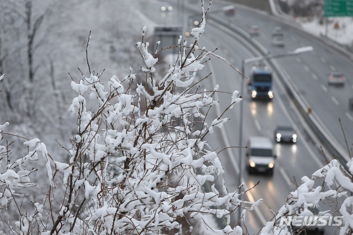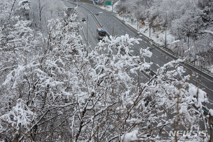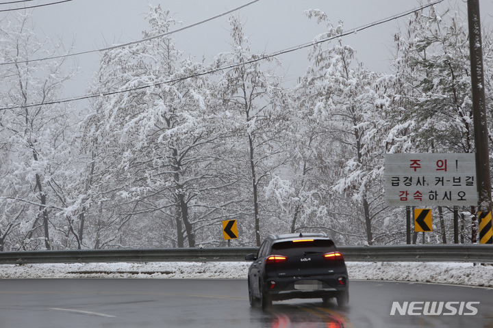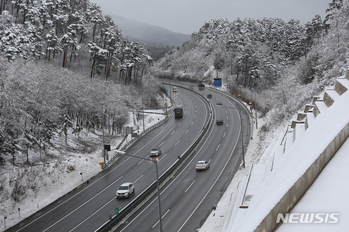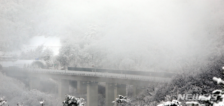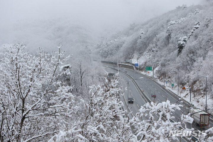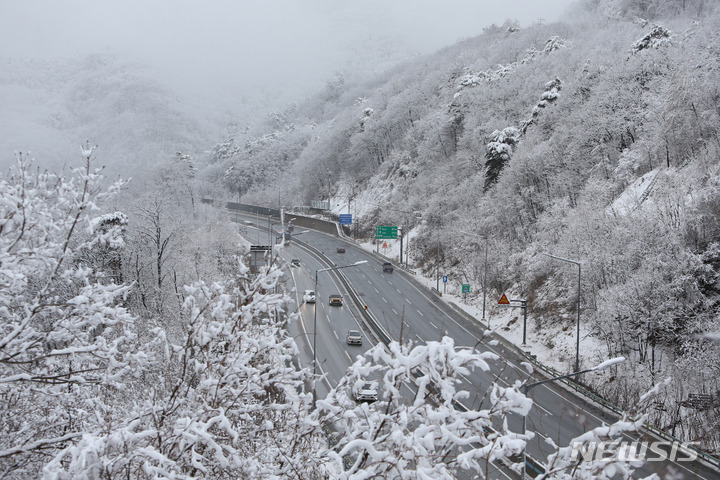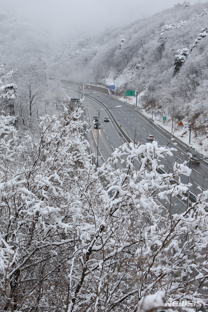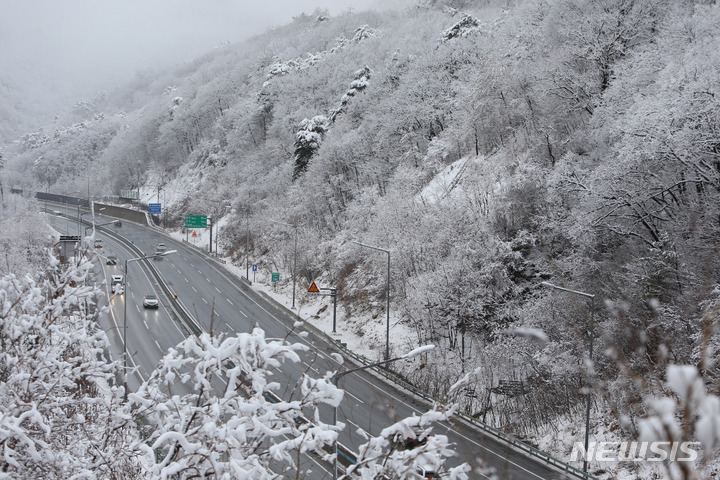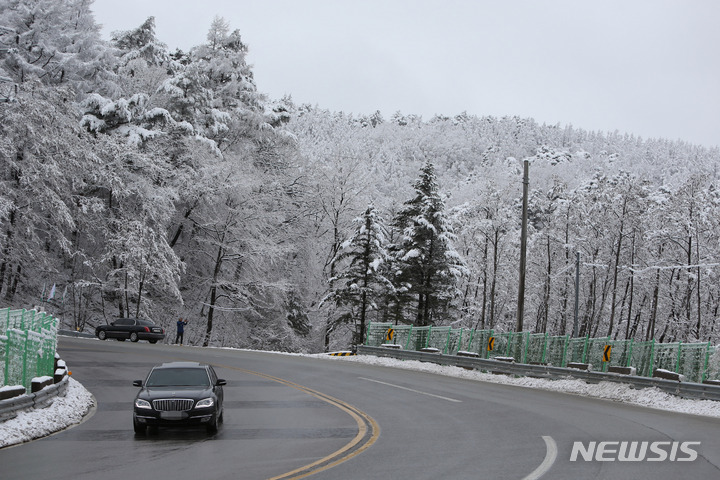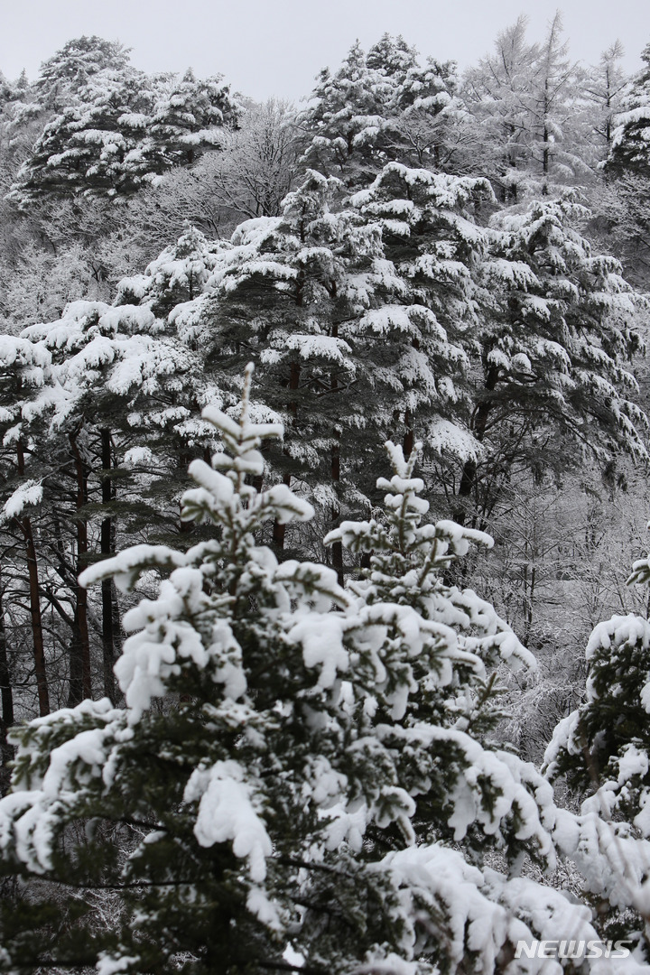 18日午後、江原道江陵市城山面の大関嶺の峠道を上がっていくと、春から冬へと入る時間旅行をすることになった。大雪警報が発令された江陵・平昌の山間地域に位置する大関嶺に、春を嫉妬する雪が降り、美しい雪景色を演出している。江原地方気象庁によると、雪は19日まで降るという。