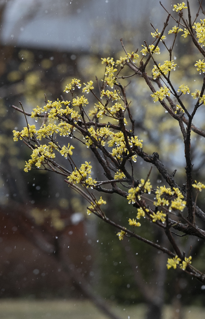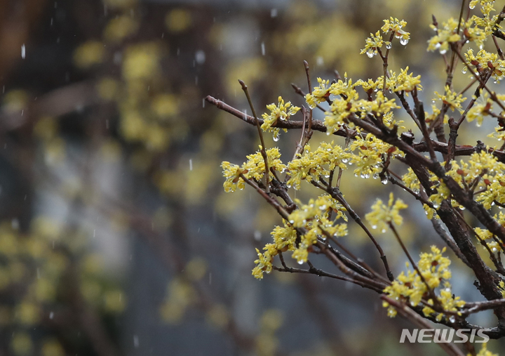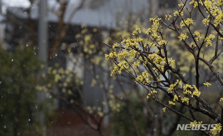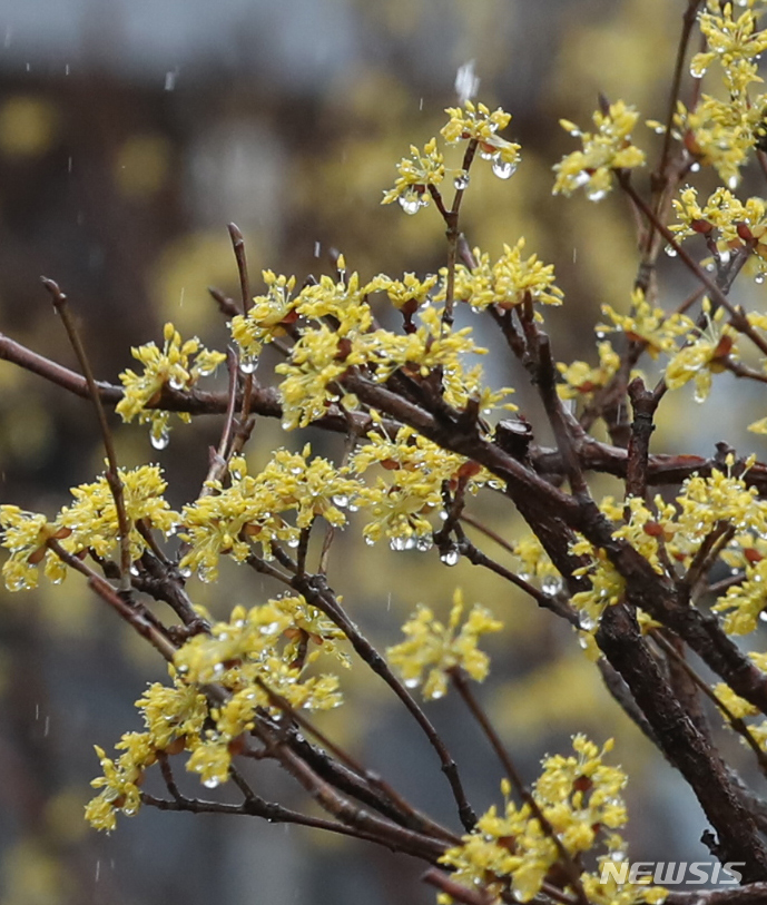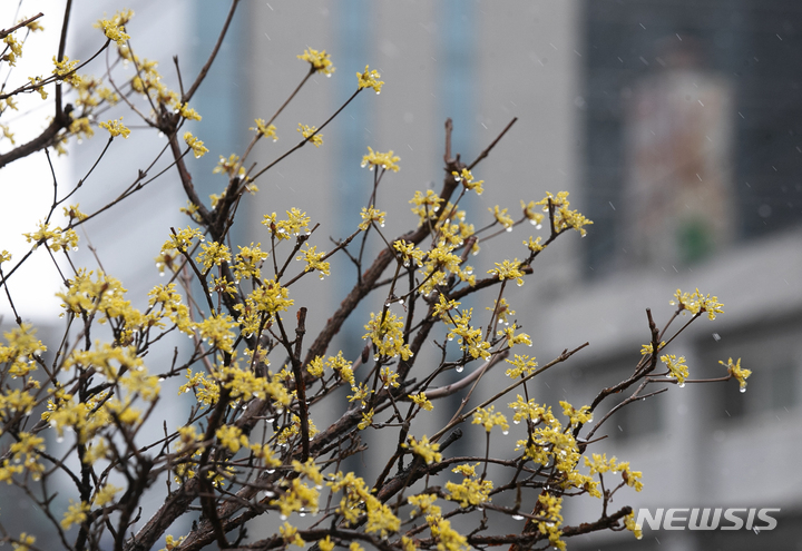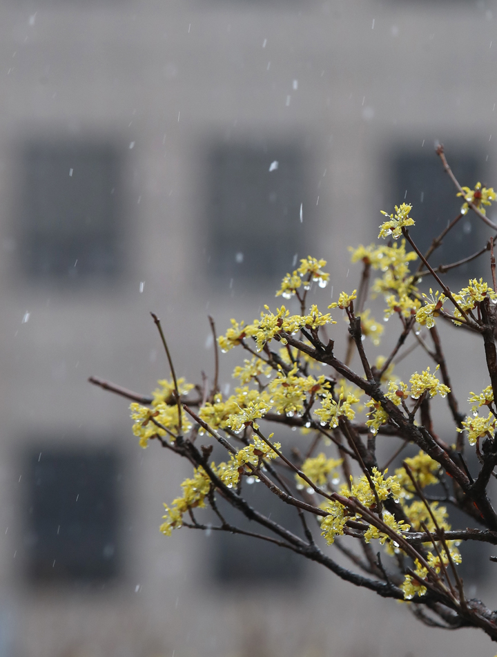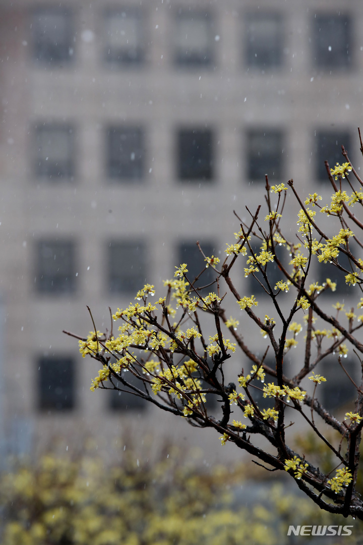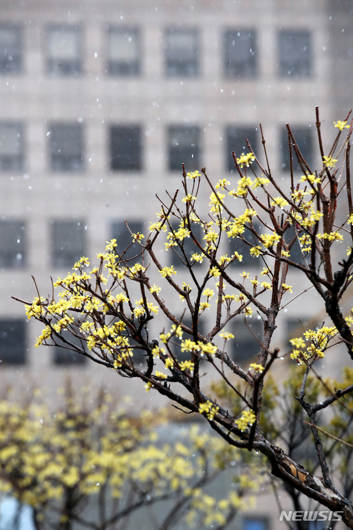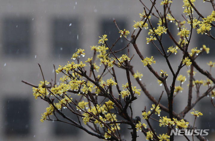 春分まであと二日と迫り、春をねたむような花冷えとなった19日午前、ソウル市中区の退溪路に咲いたサンシュユの花に降る雪の様子。