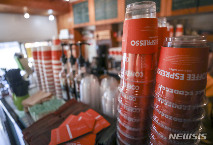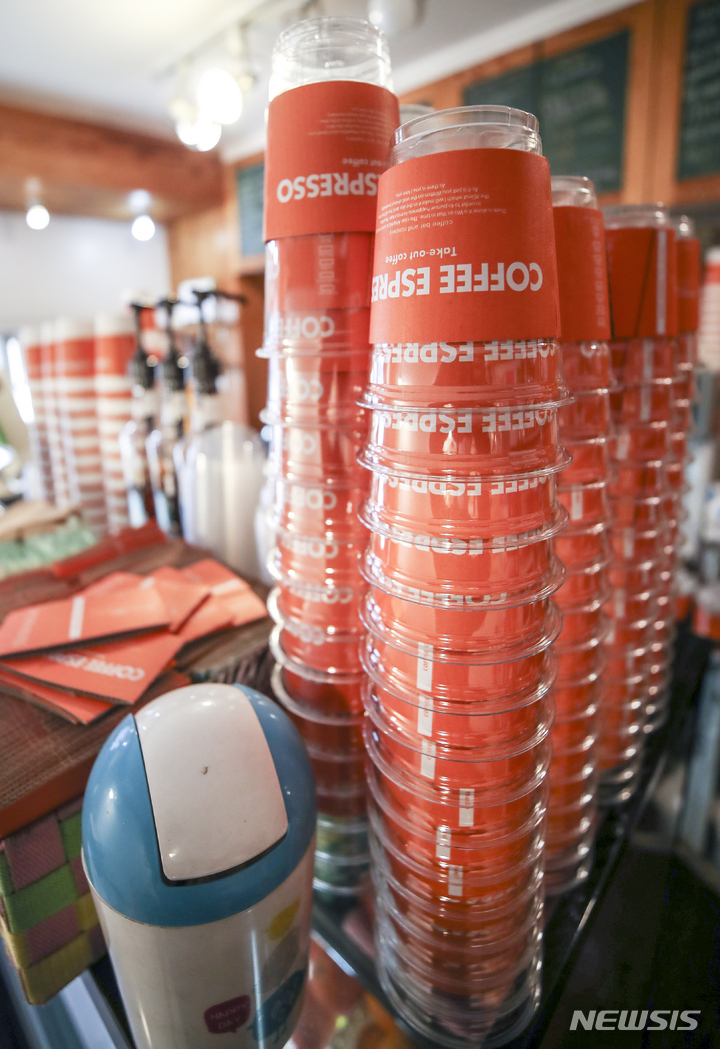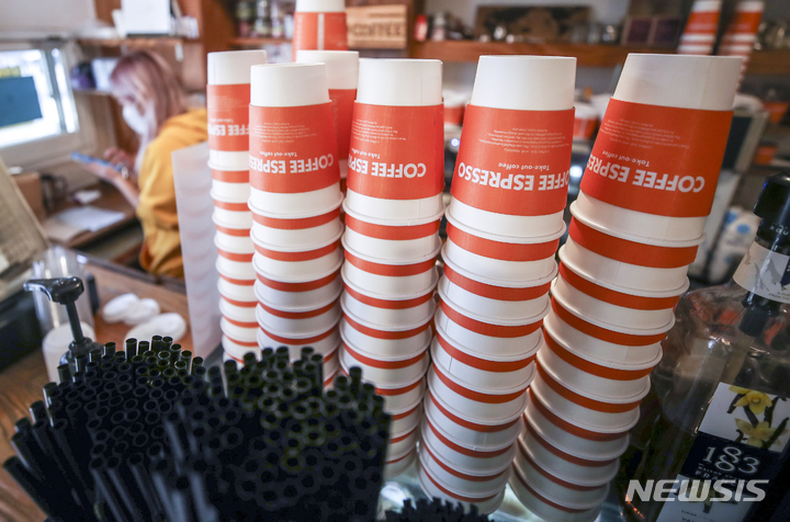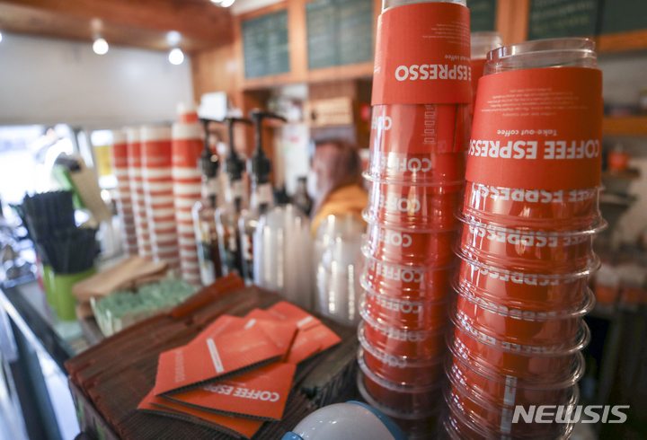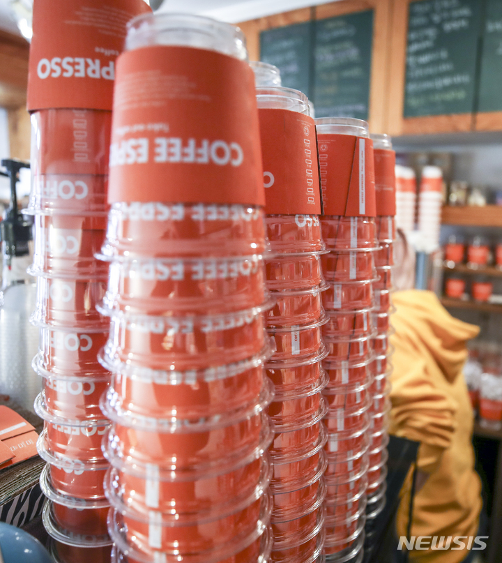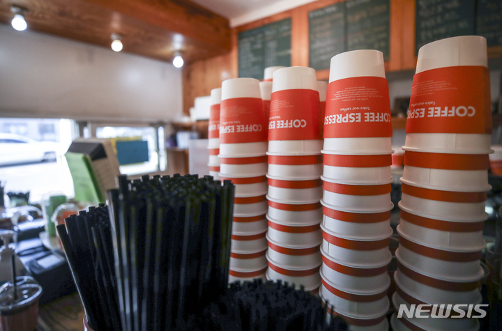 【NEWSIS】新型コロナウイルス流行拡大により、この2年間にわたり先送りされていたプラスチック・カップなど使い捨て用品の使用規制が4月1日から施行される予定だ。写真は21日午前、ソウル市内のコーヒー専門店で積み上げられた使い捨てのカップ。