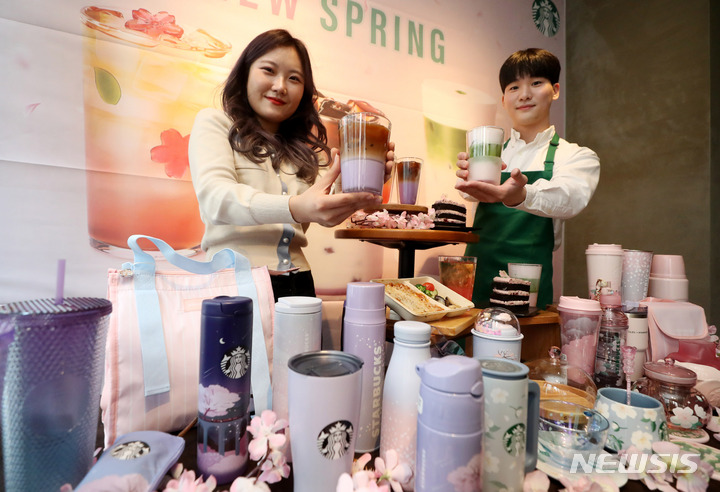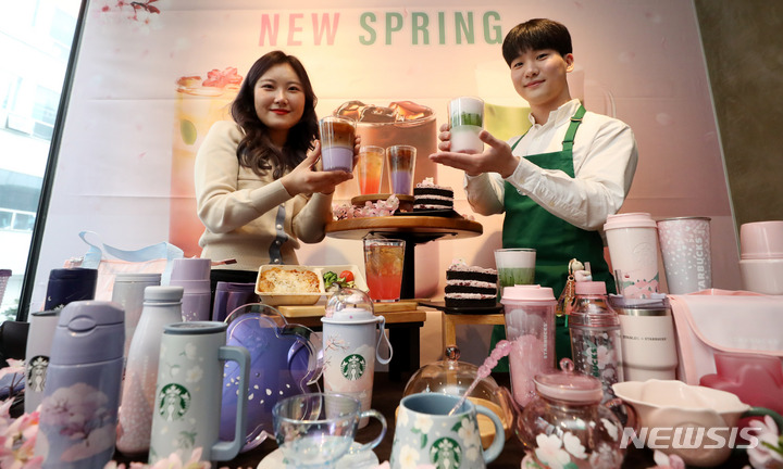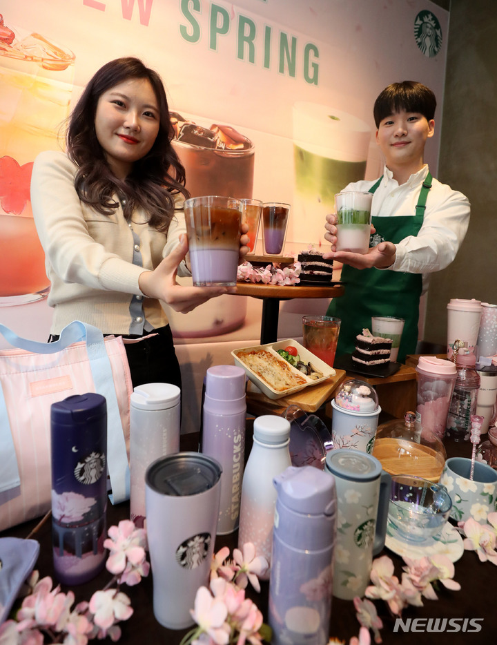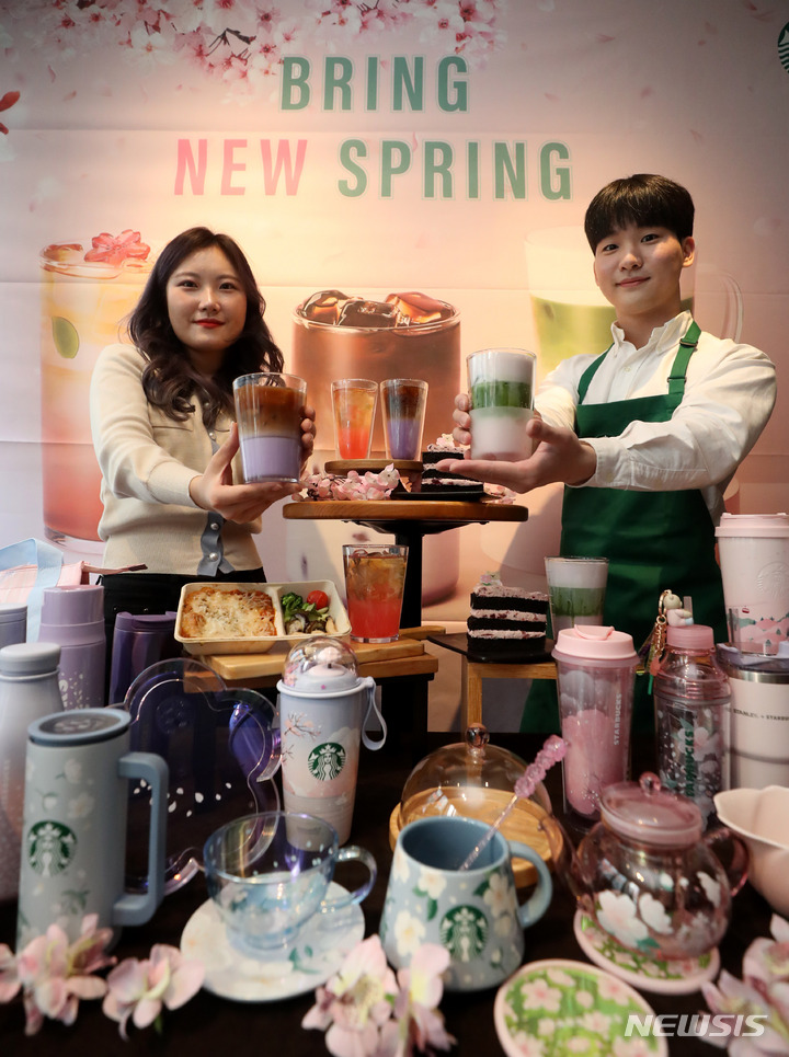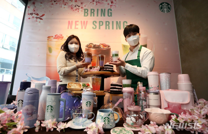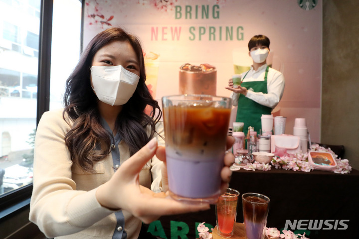ソウル市中区のスターバックスコーヒー店舗で21日午前、コンパニオンらが春の絶頂を告げるドリンク「ミッドナイト・ベルガモット・コールドブリュー」をPRした。